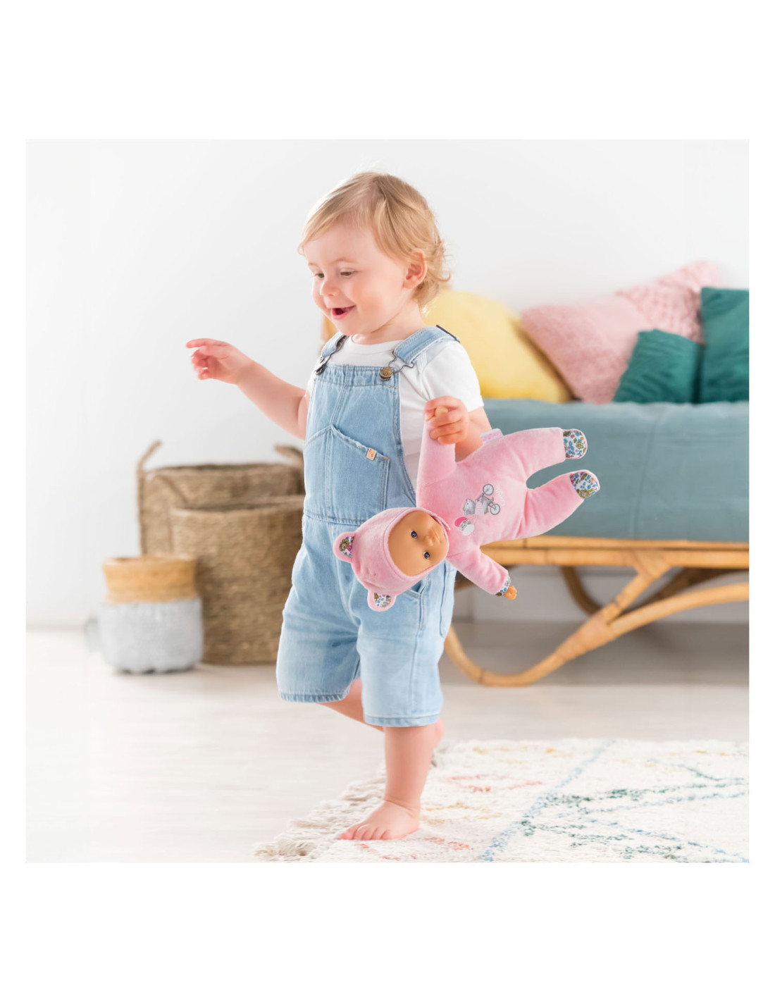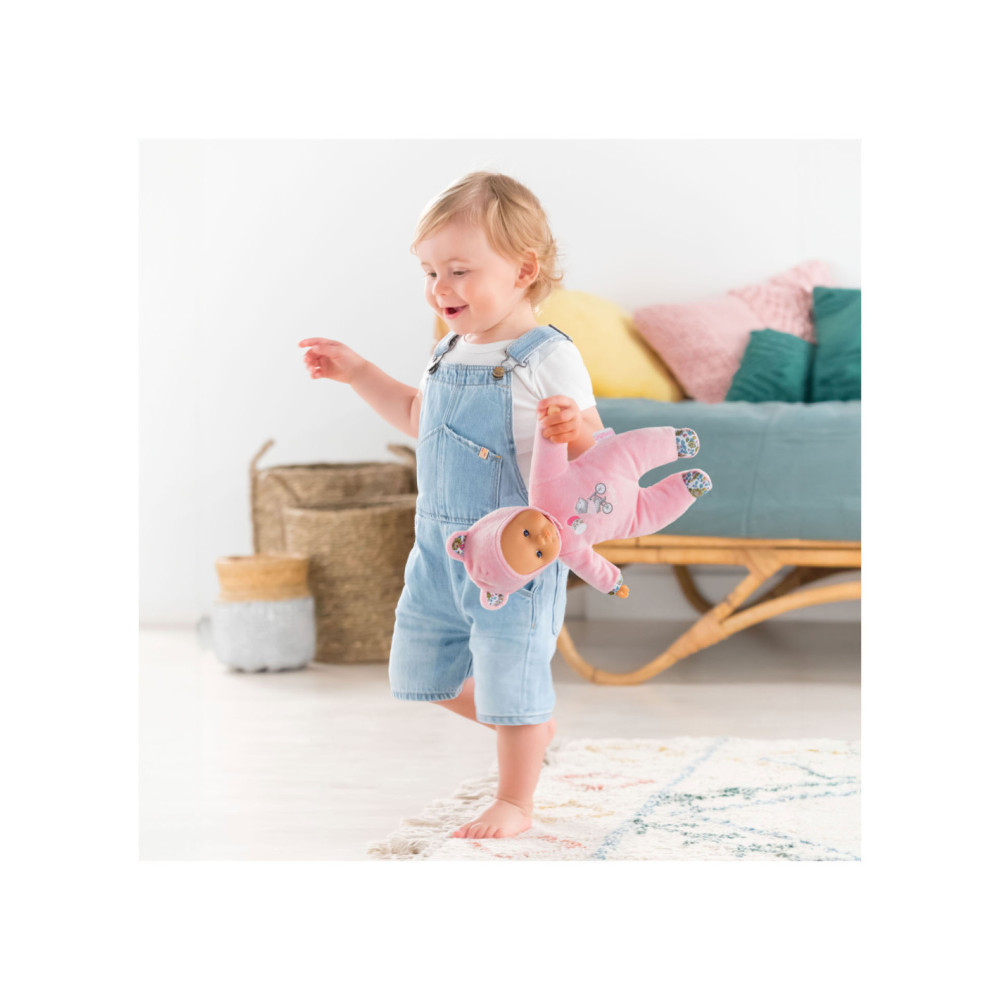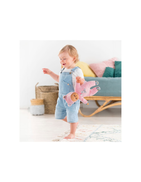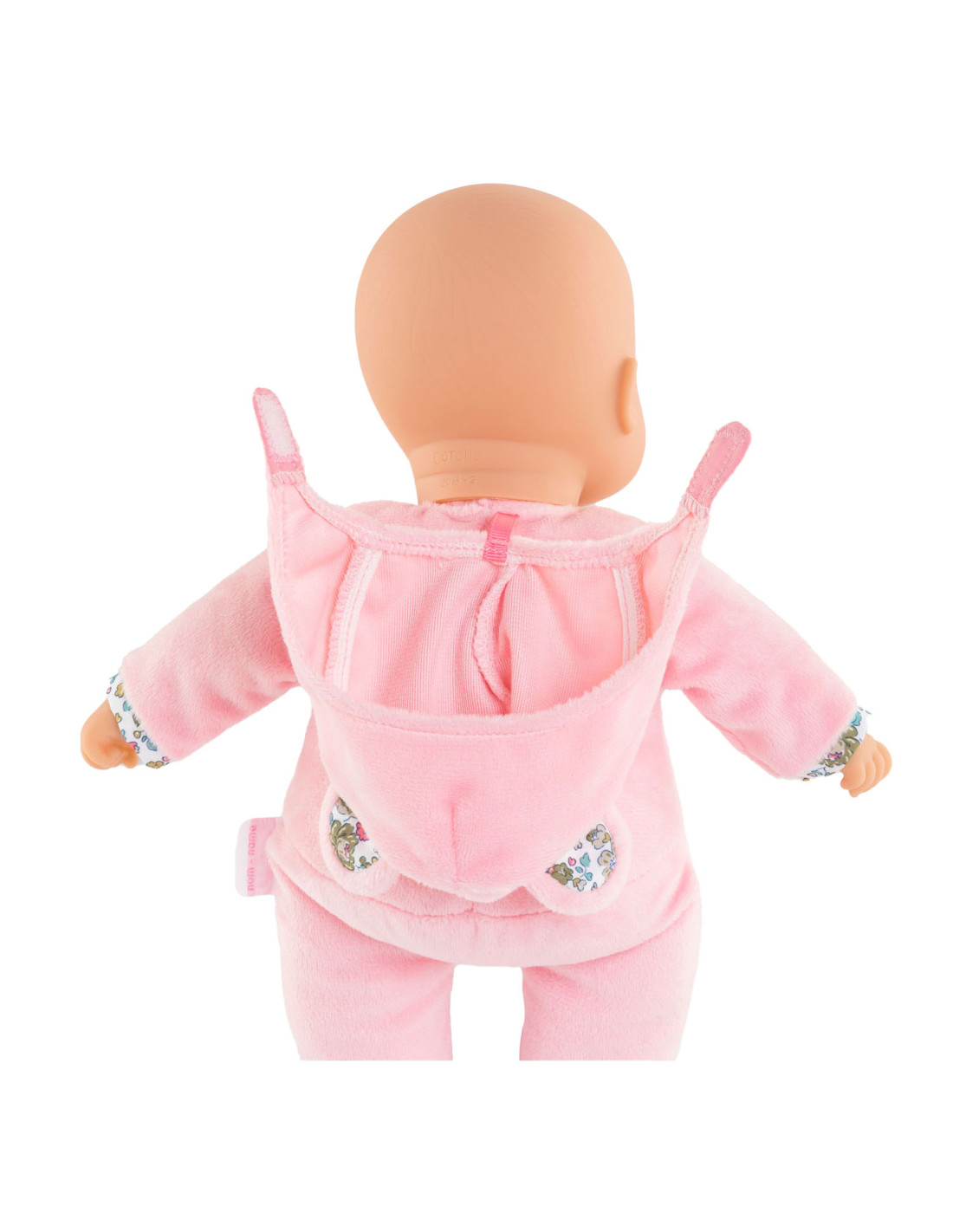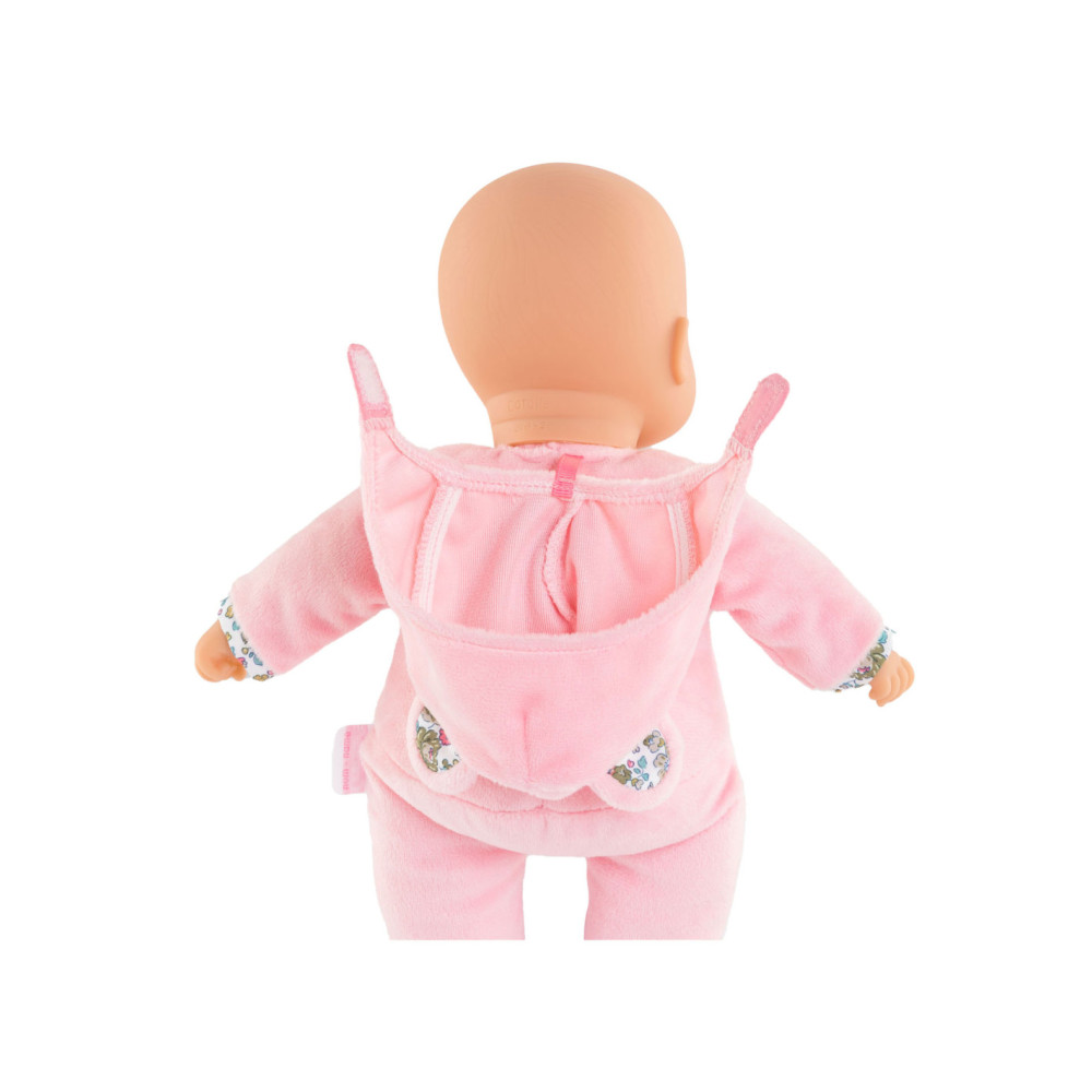 Knuffelpop van Corolle met een zachte, roze outfit met berenoortjes en een gezicht en handjes van vinyl. De pop heeft de kenmerkende Corolle vanillegeur en een label voor een naam/telefoonnummer. Geschikt voor kinderen vanaf 9 maanden oud.