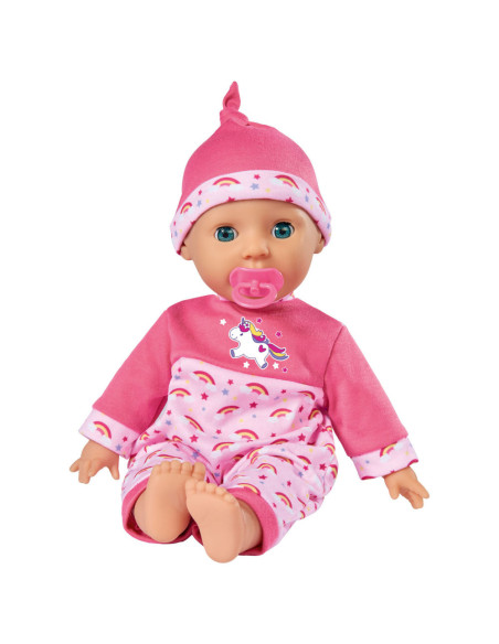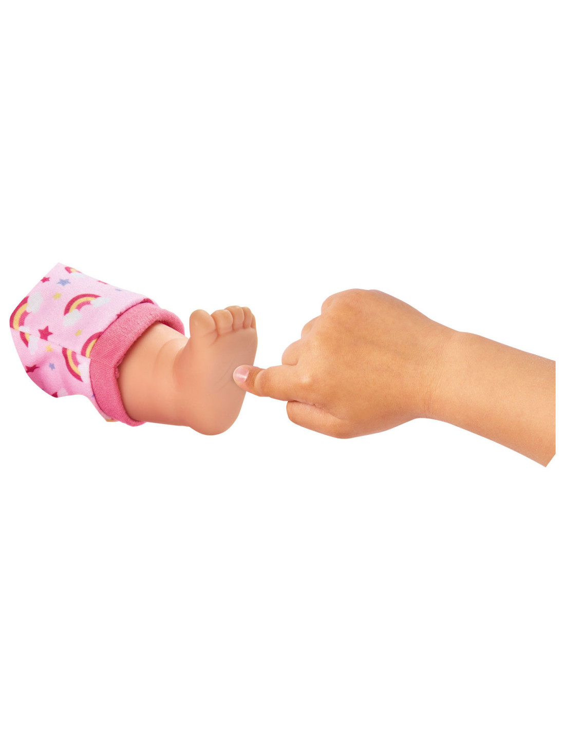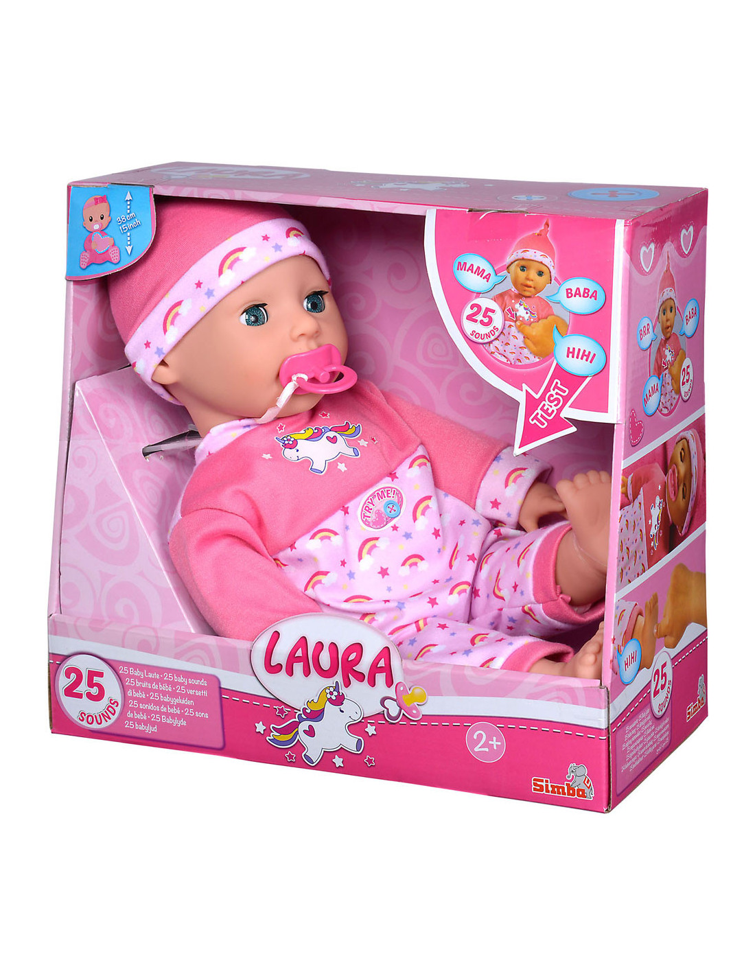 Babypop Laura is 38 centimeter groot en maakt 25 verschillende geluidjes. Kietel haar voeten en laat haar lachen! Inclusief speentje, regenboogpyjama en muts.