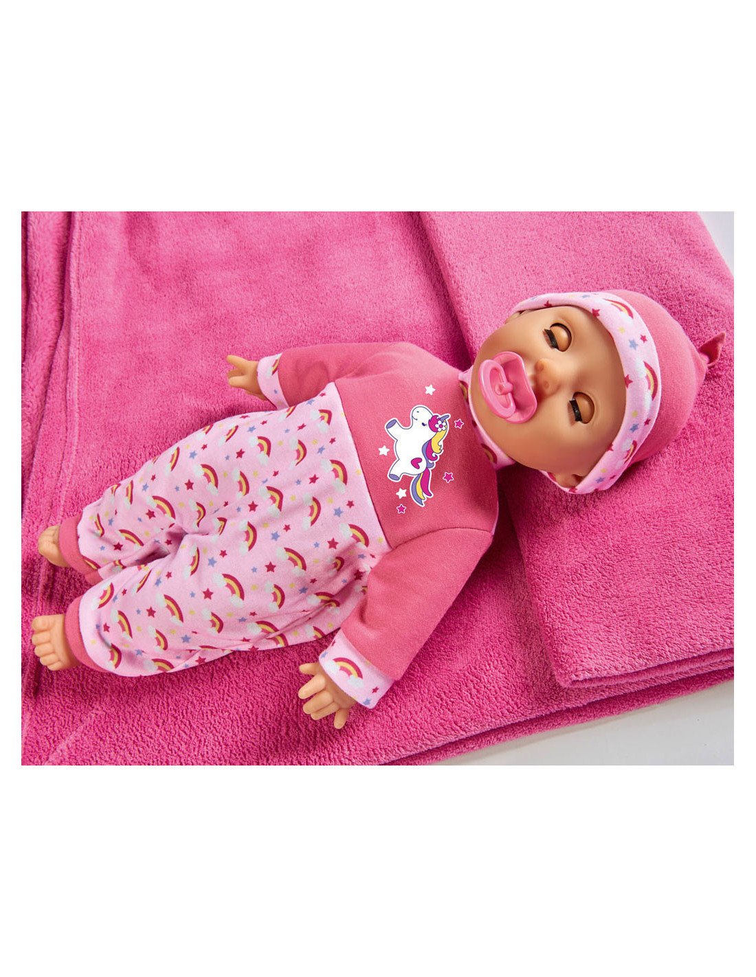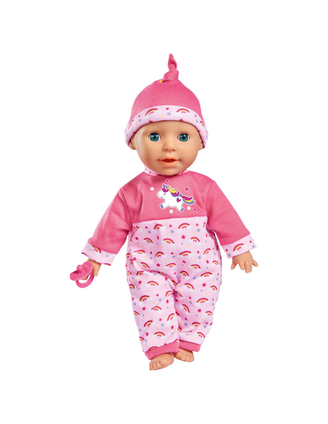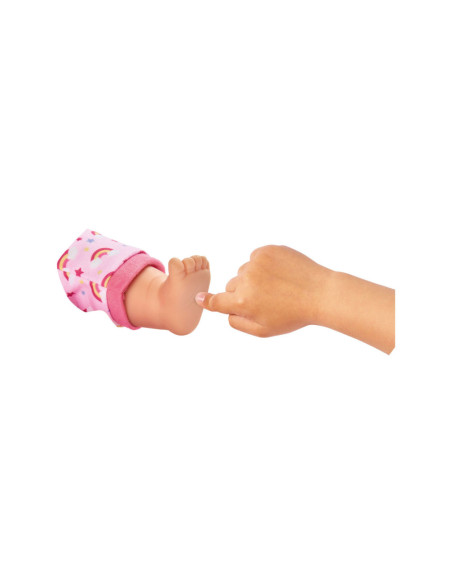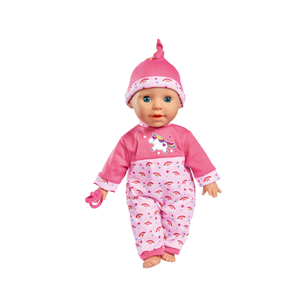 Babypop Laura is 38 centimeter groot en maakt 25 verschillende geluidjes. Kietel haar voeten en laat haar lachen! Inclusief speentje, regenboogpyjama en muts.