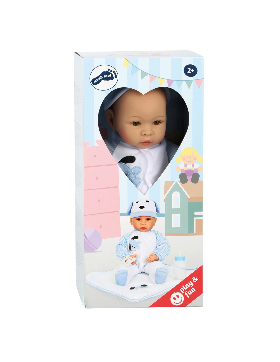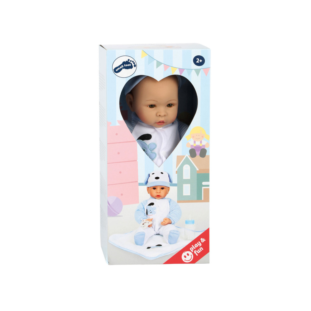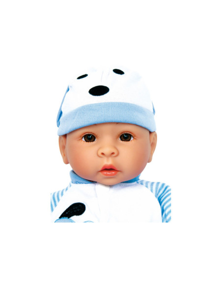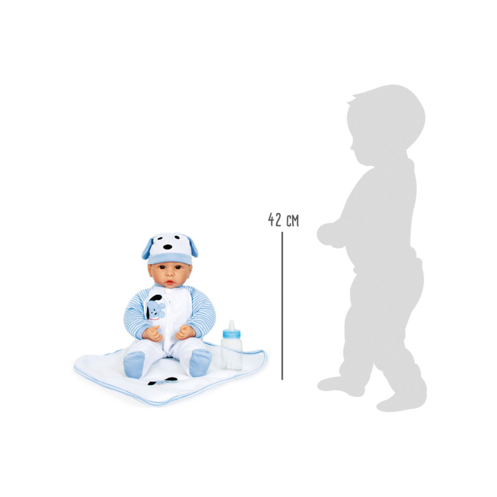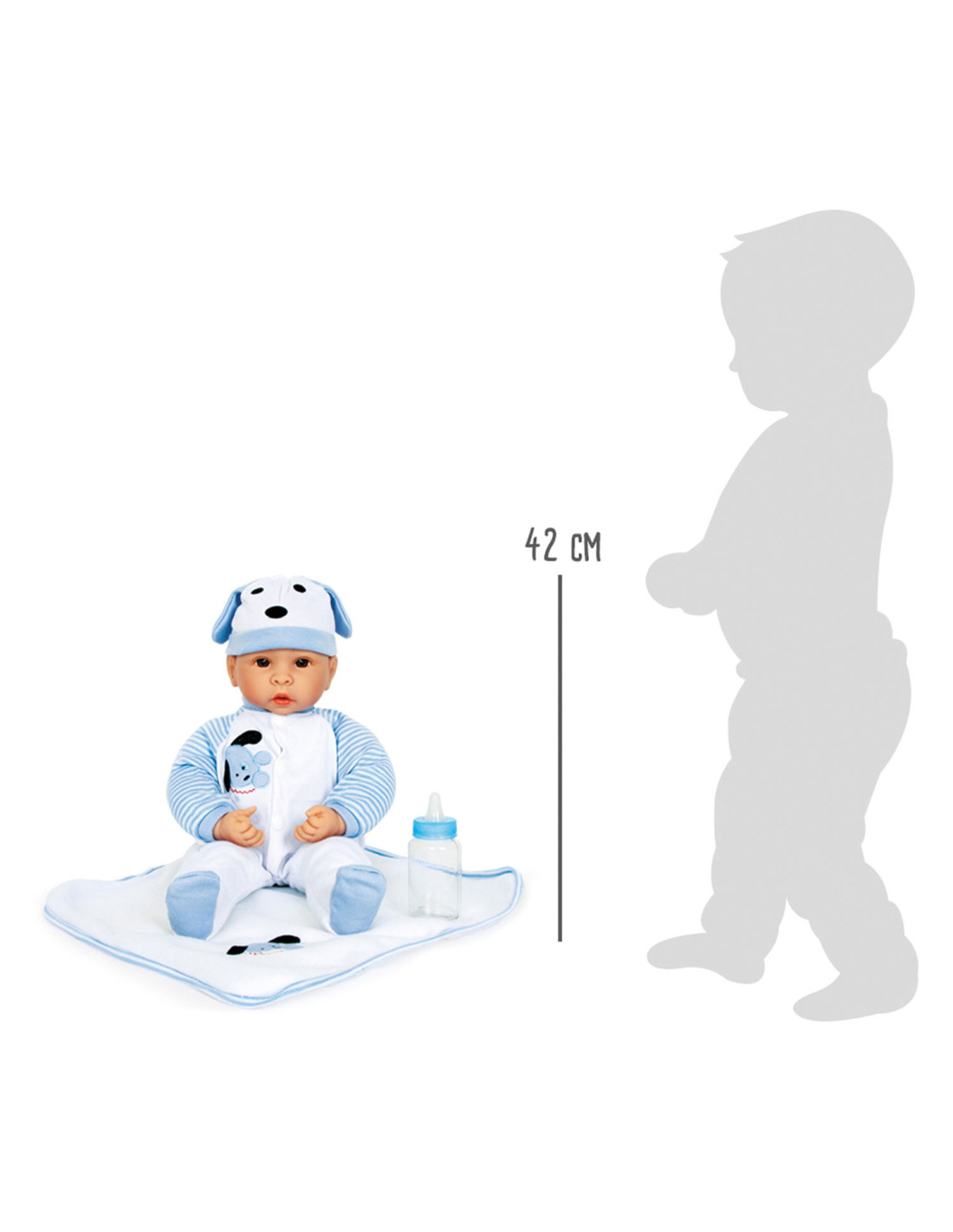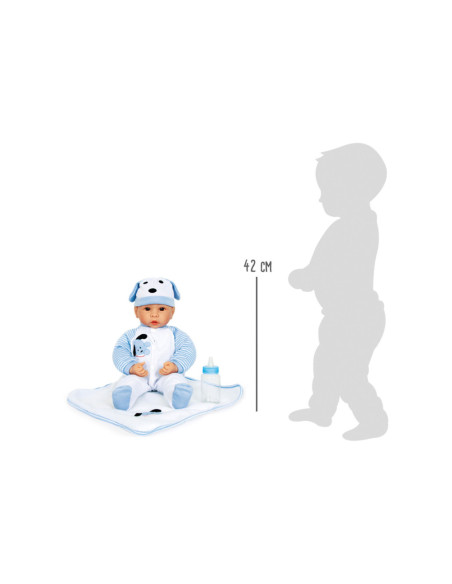 Oh, hoe schattig - deze kleine jongen met zijn schattige kleding doet het hart van elke poppenmama smelten! De pop heeft een lichtblauwe babyfles, een fopspeen die in zijn mond kan worden gestopt en een zacht dekentje. De kleding van de jongen is een echte blikvanger - veel elementen, zoals de oren op de muts, doen denken aan een hond.