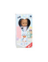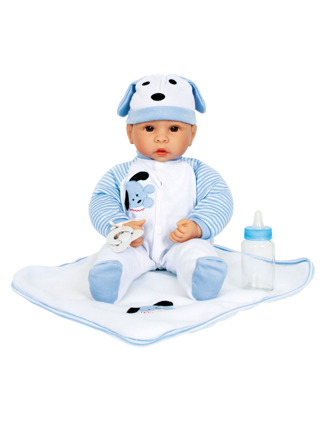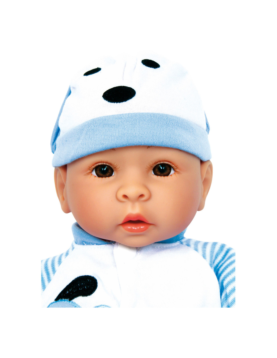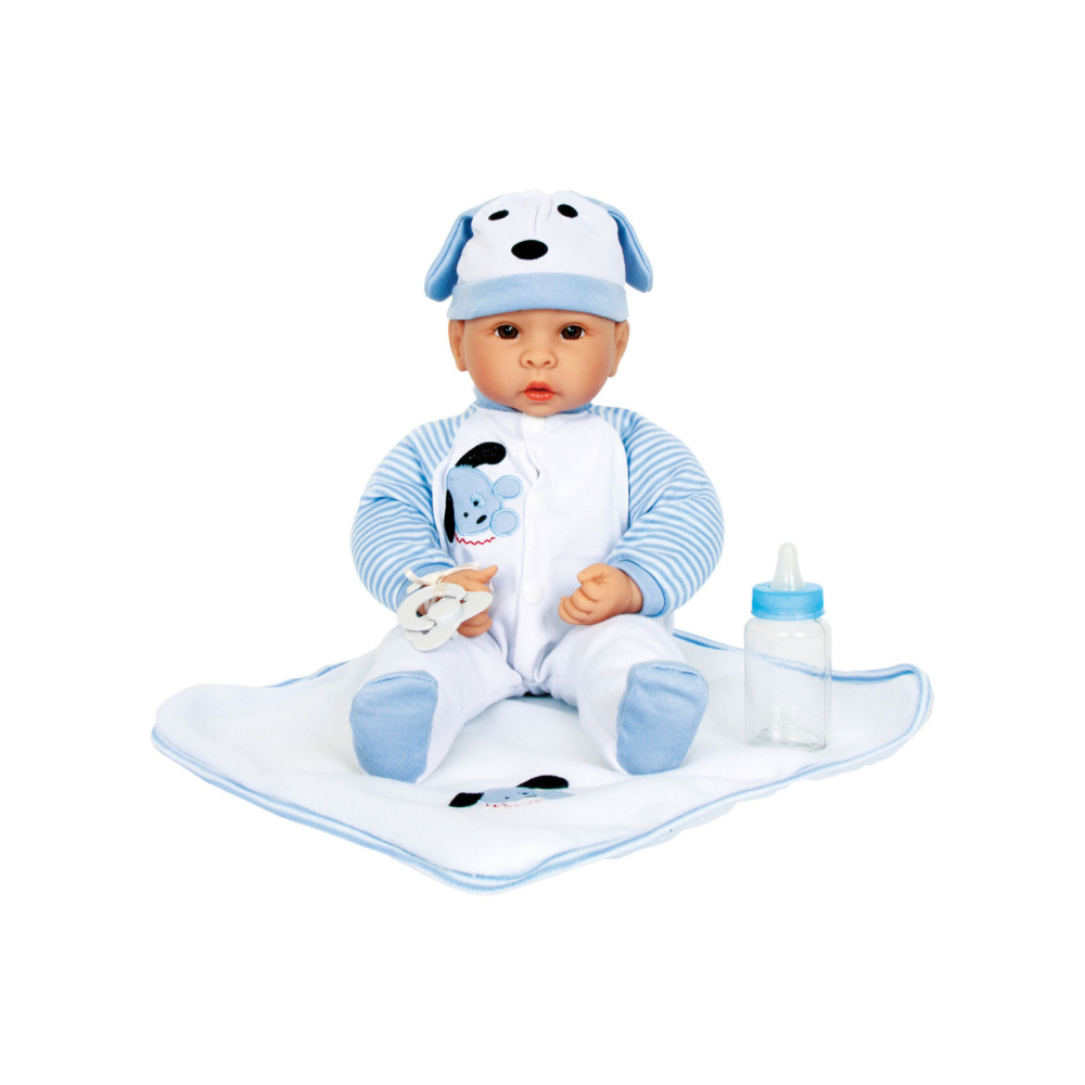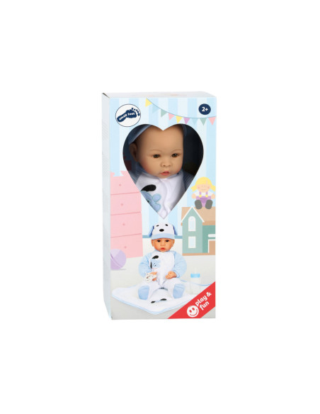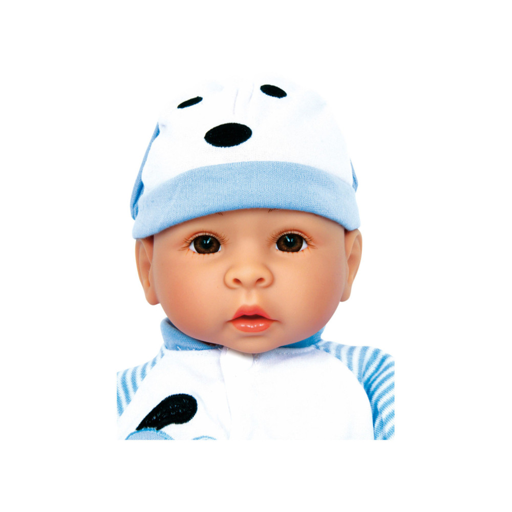 Oh, hoe schattig - deze kleine jongen met zijn schattige kleding doet het hart van elke poppenmama smelten! De pop heeft een lichtblauwe babyfles, een fopspeen die in zijn mond kan worden gestopt en een zacht dekentje. De kleding van de jongen is een echte blikvanger - veel elementen, zoals de oren op de muts, doen denken aan een hond.