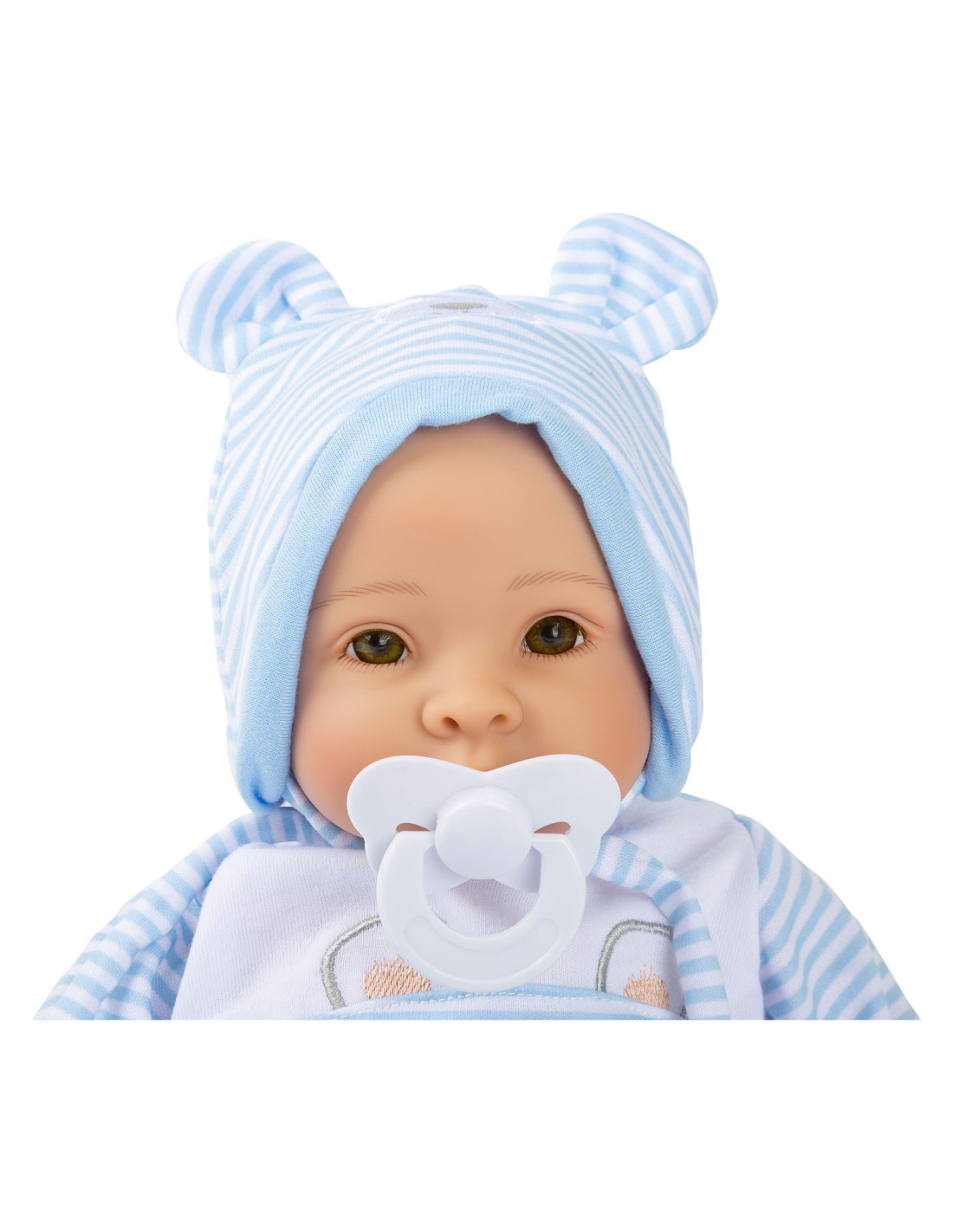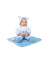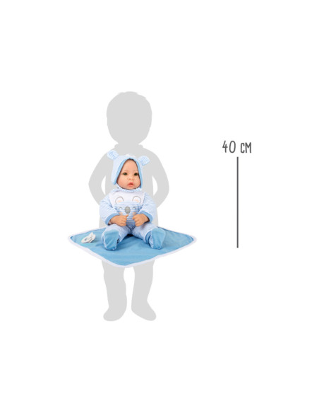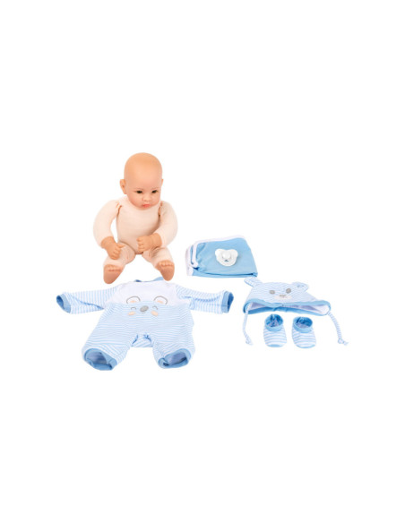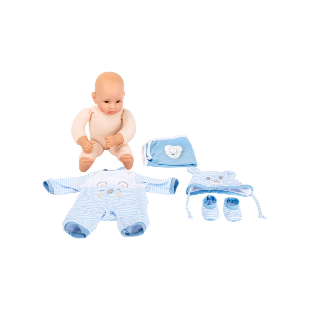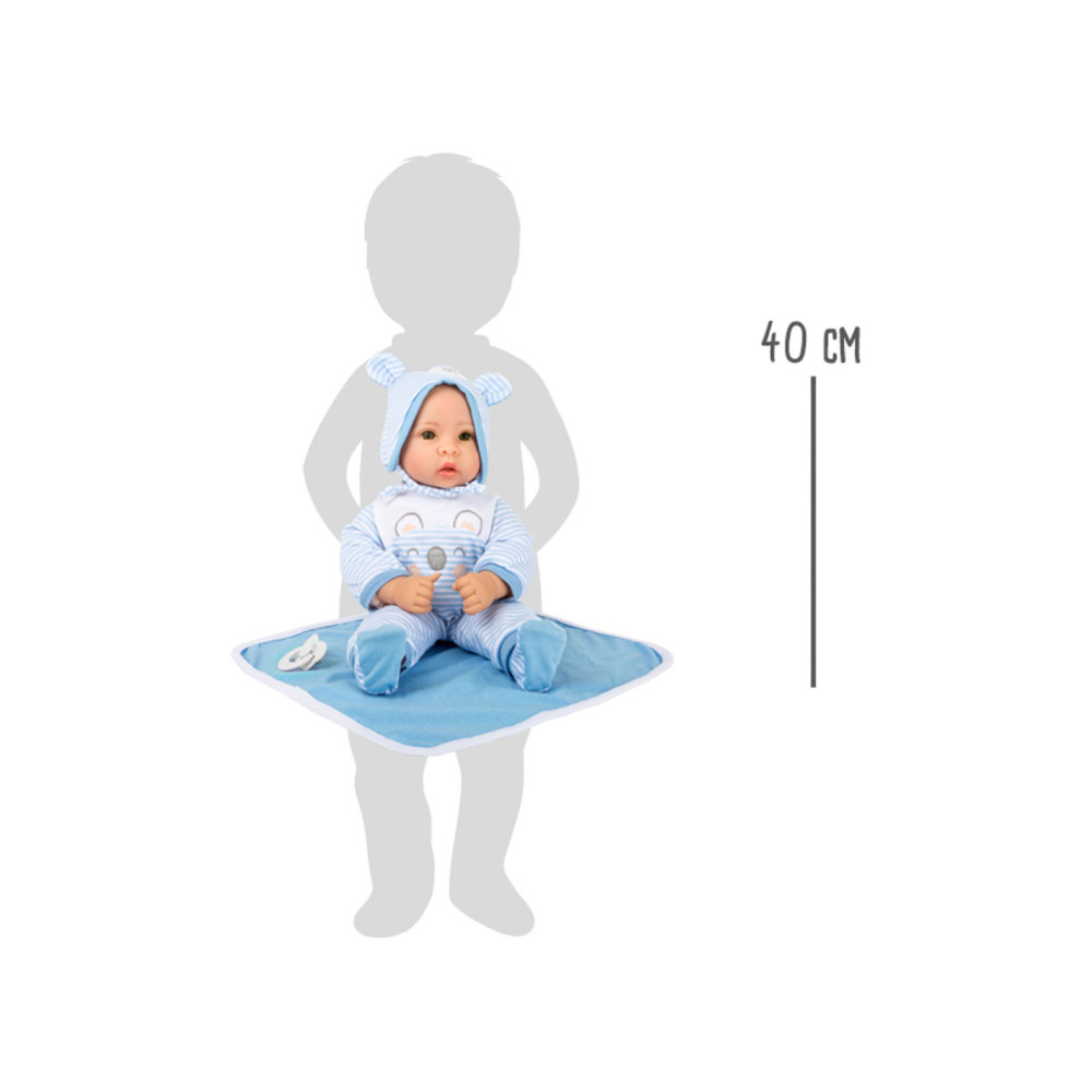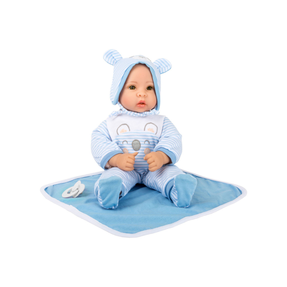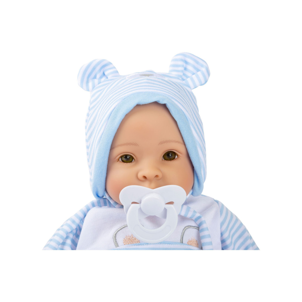 Lucas de pop is geweldig om mee te knuffelen! Met zijn fonkelende ogen en zijn opgeplakte wimpers zal hij alle poppenouders vanaf het begin betoveren. De charmante gestreepte babykleertjes kunnen de pop gemakkelijk aan- en uittrekken. Een schattig slabbetje met klittenband, de bijpassende muts met oortjes, een fopspeen en het zachte dekentje maken deze outfit helemaal af.