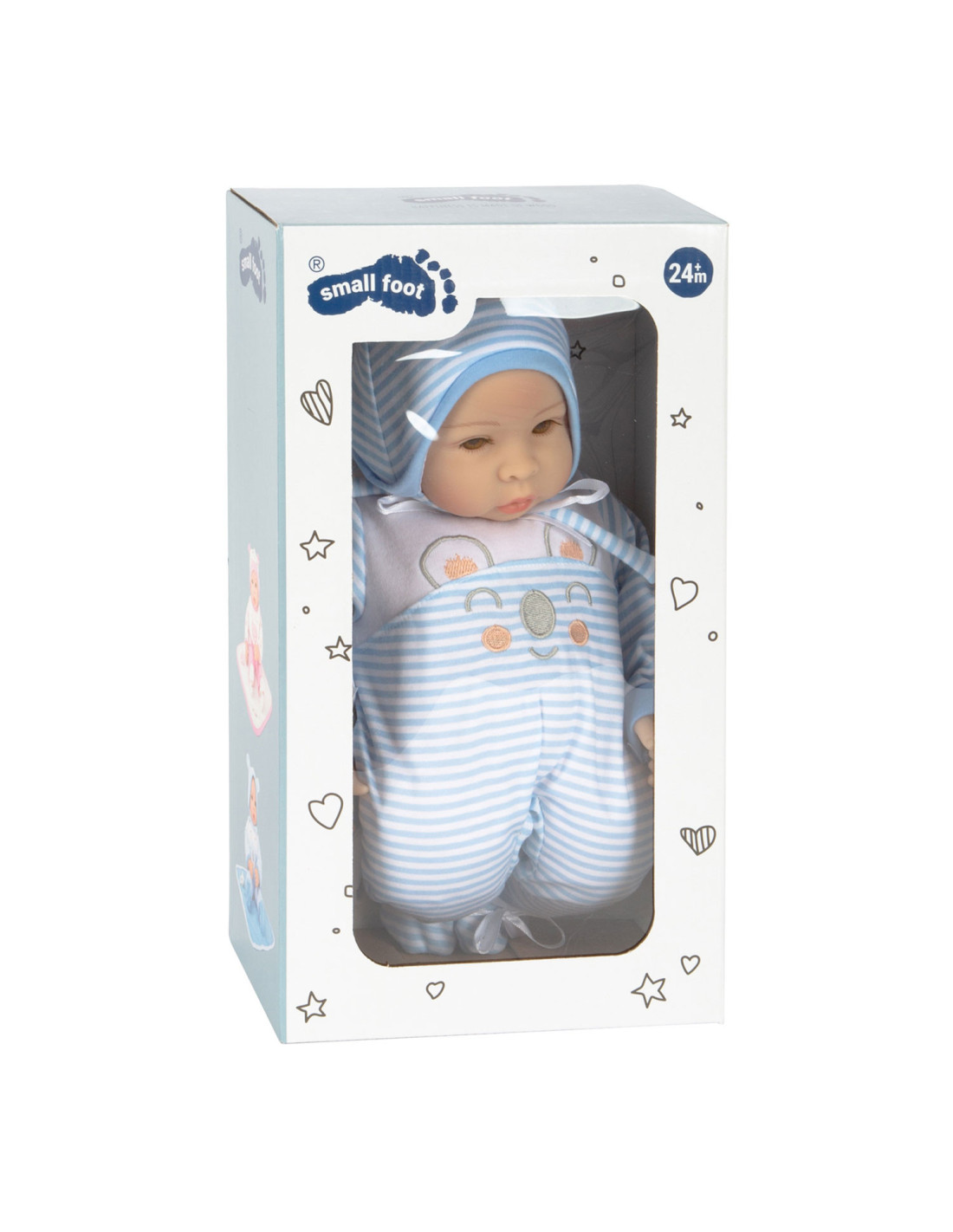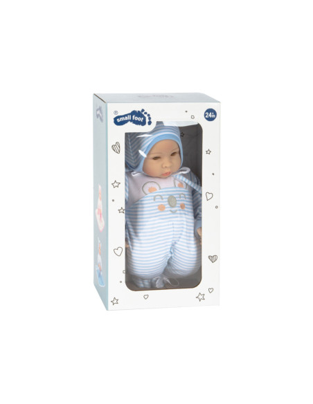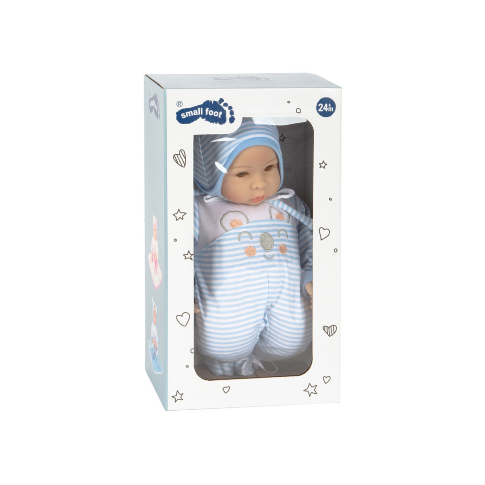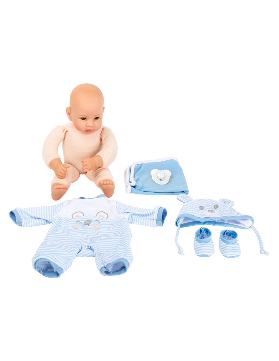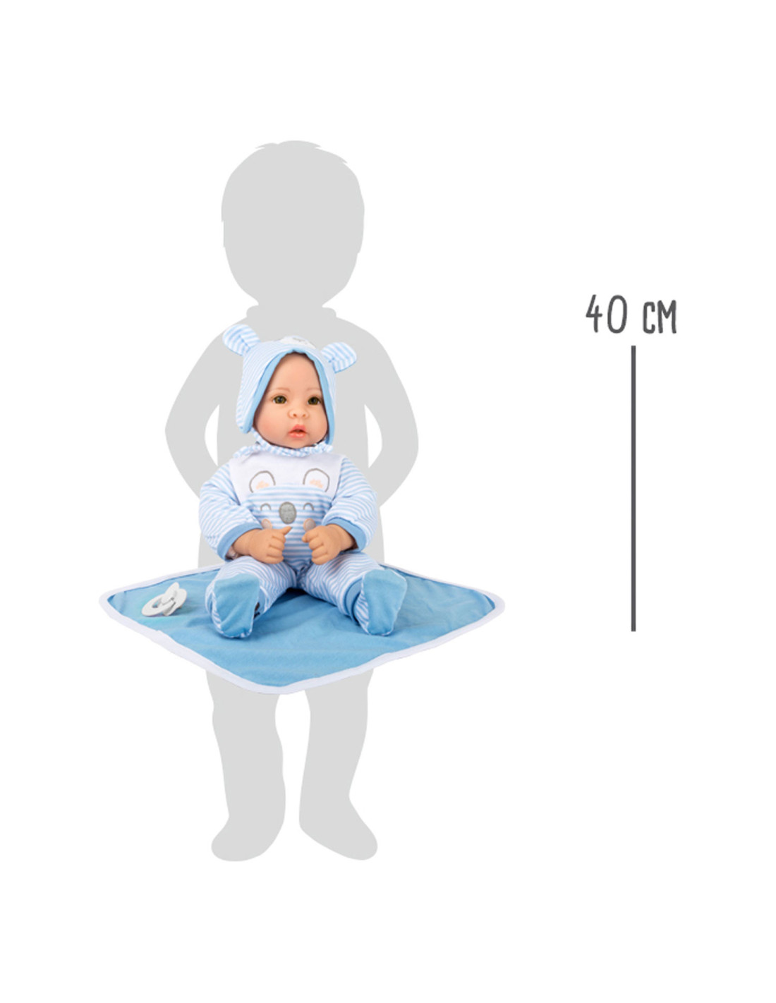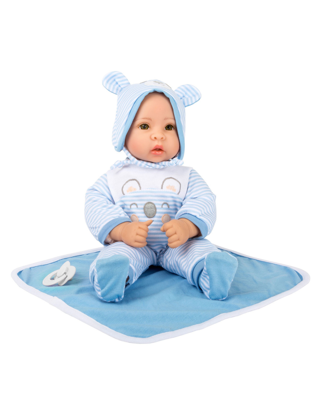 Lucas de pop is geweldig om mee te knuffelen! Met zijn fonkelende ogen en zijn opgeplakte wimpers zal hij alle poppenouders vanaf het begin betoveren. De charmante gestreepte babykleertjes kunnen de pop gemakkelijk aan- en uittrekken. Een schattig slabbetje met klittenband, de bijpassende muts met oortjes, een fopspeen en het zachte dekentje maken deze outfit helemaal af.