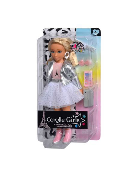 De Valentine Fashion Week Paris-set bestaat uit Valentine, een modepop van 28 cm, en 4 accessoires: 1 paar afneembare oorbellen, 1 mobiele telefoon, 1 telefoonhoesje en 1 haarband. Valentine heeft een natuurlijk gezicht met fijne gelaatstrekken en de kenmerkende Corolla-vanillegeur. Haar ogen zijn geverfd en ze heeft blond haar tot op haar schouders. Ze draagt 1 witte tule rok, 1 roze T-shirt, 1 jasje, 1 paar afneembare roze enkellaarsjes en 1 paar afneembare oorbellen.