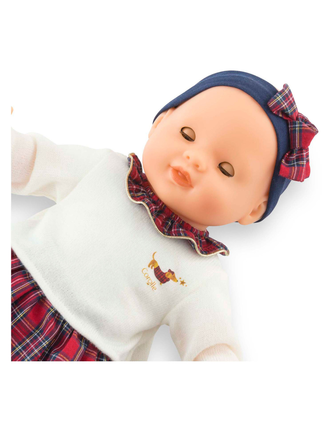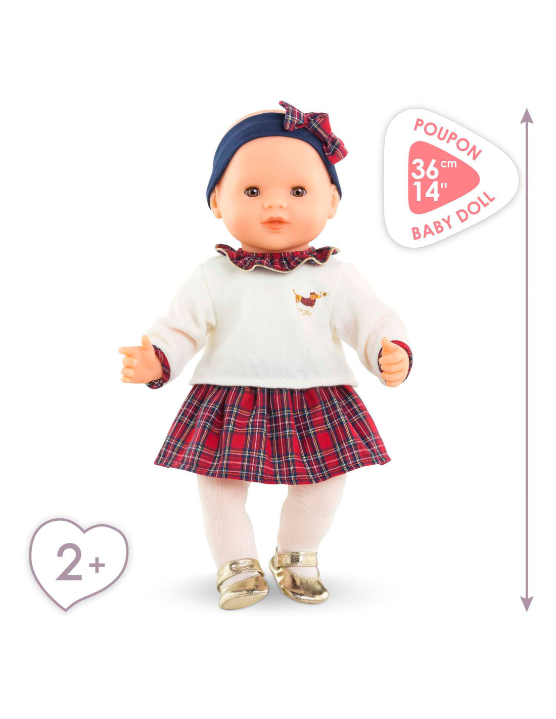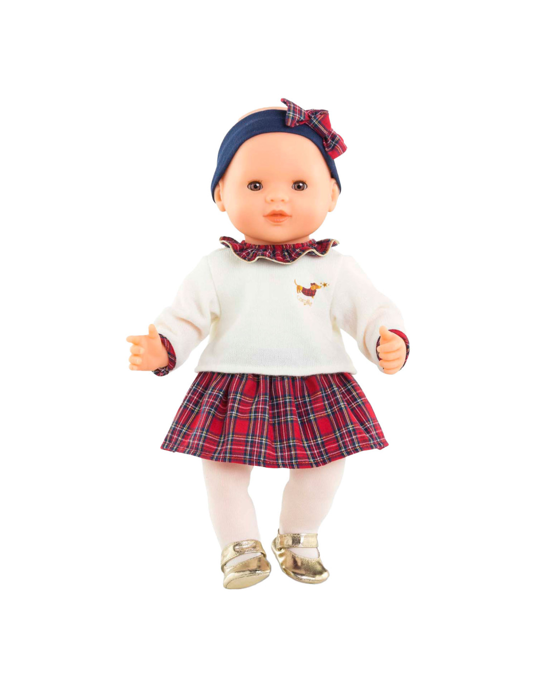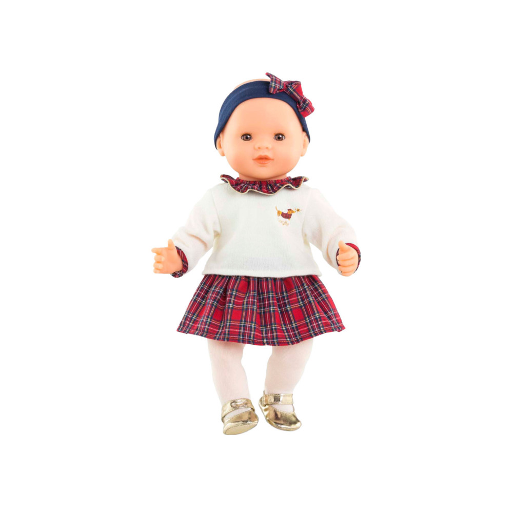 Voor de feestdagen is Suzanne prachtig aangekleed met een ivoorkleurige gebreide trui met geruite kraag, een bijpassende rok, een panty en gouden schoentjes. Op haar trui staat een schattige teckel in een geruite jas. De outfit wordt compleet gemaakt met een marineblauwe haarband met strik.