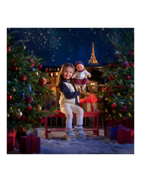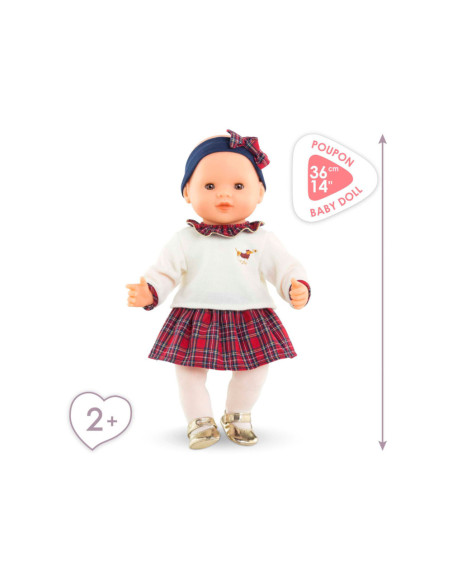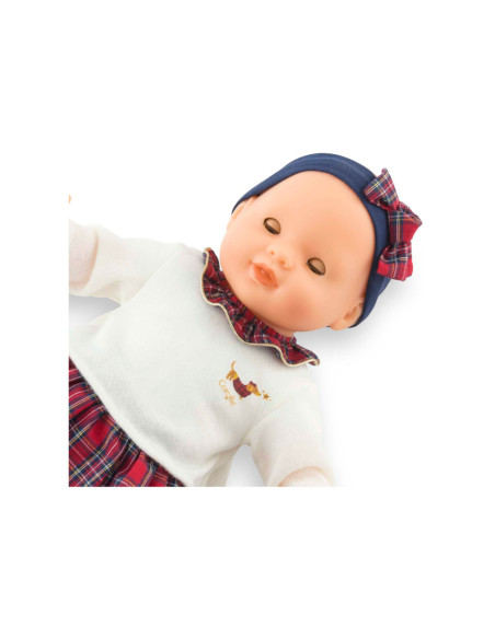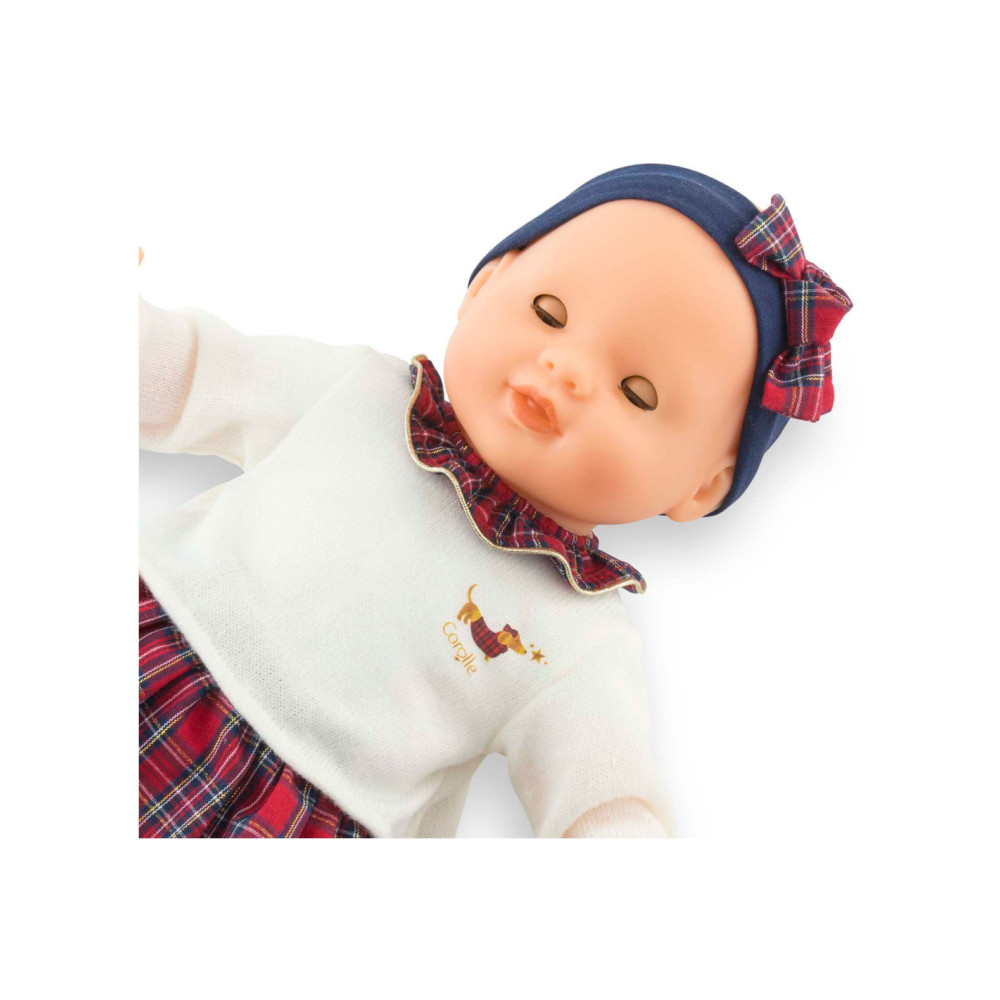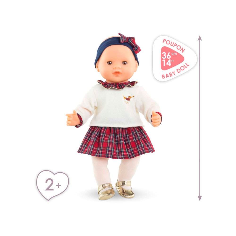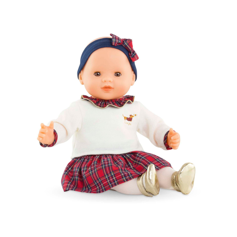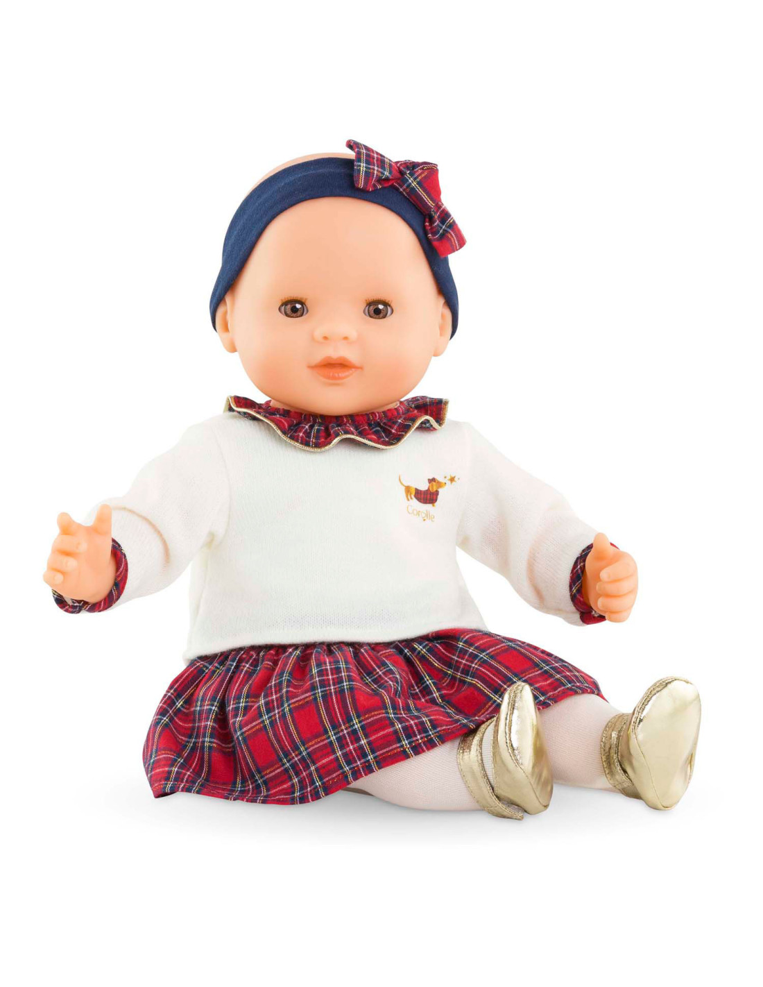 Voor de feestdagen is Suzanne prachtig aangekleed met een ivoorkleurige gebreide trui met geruite kraag, een bijpassende rok, een panty en gouden schoentjes. Op haar trui staat een schattige teckel in een geruite jas. De outfit wordt compleet gemaakt met een marineblauwe haarband met strik.