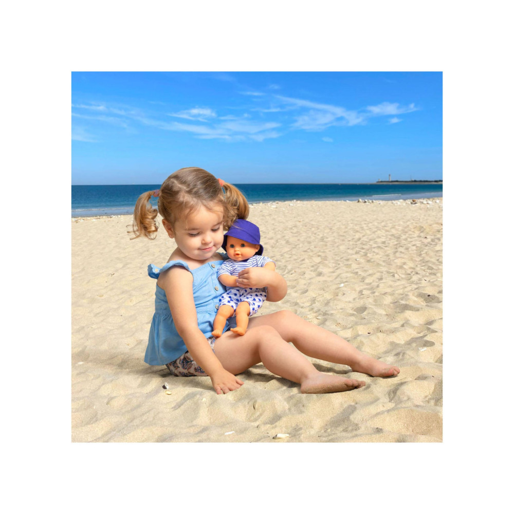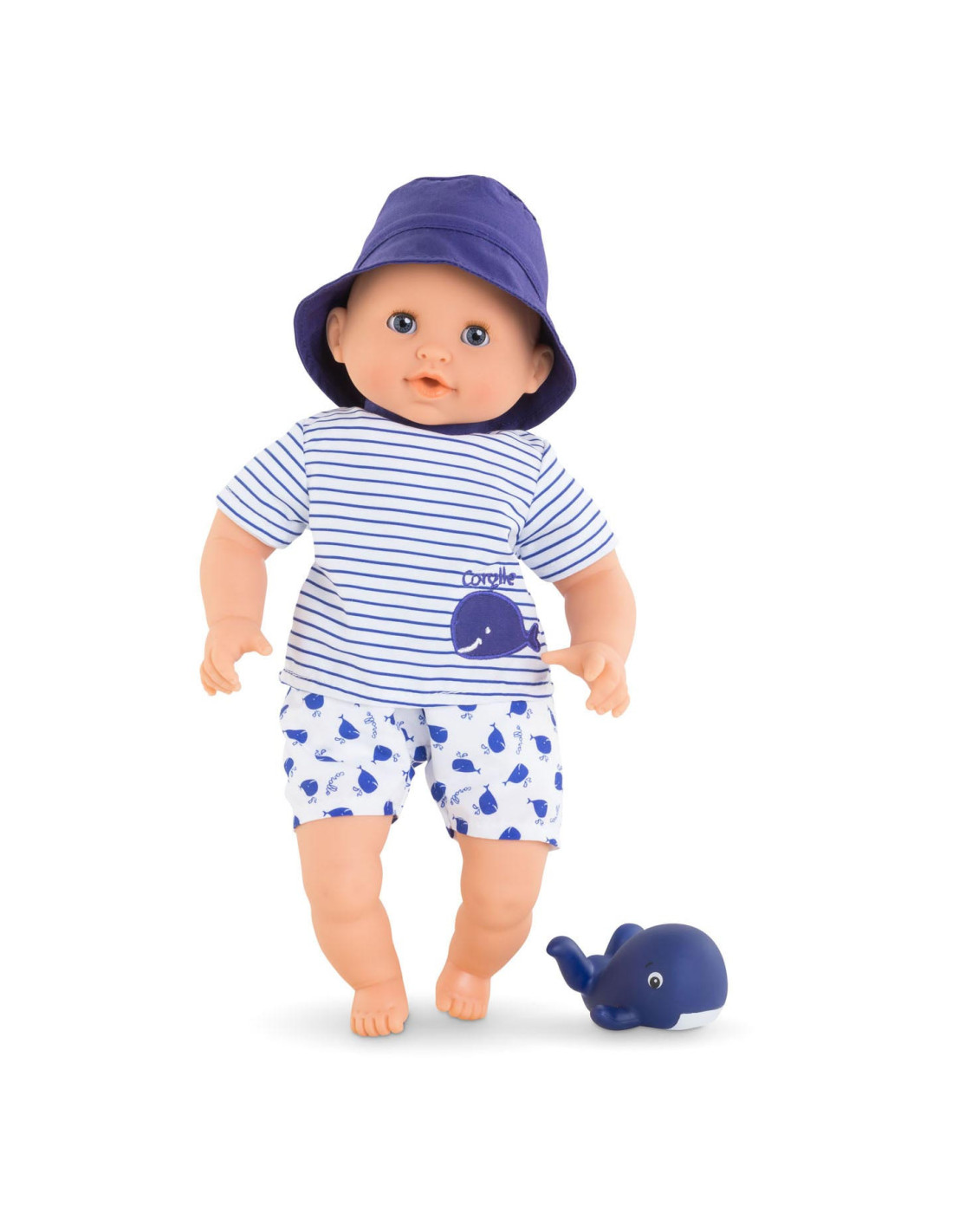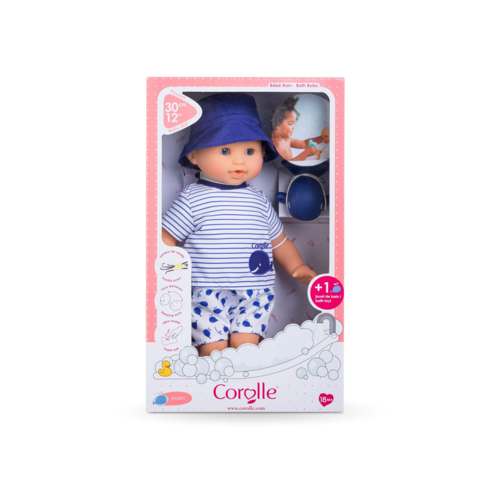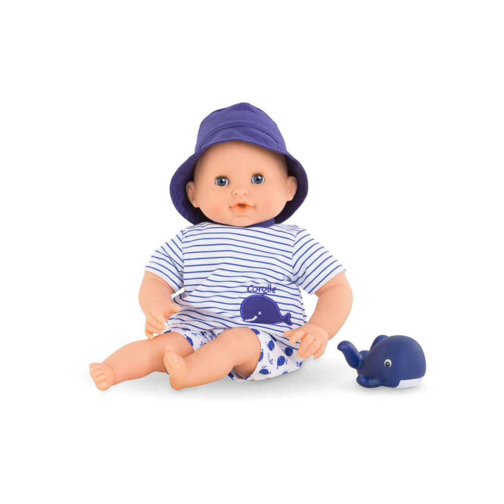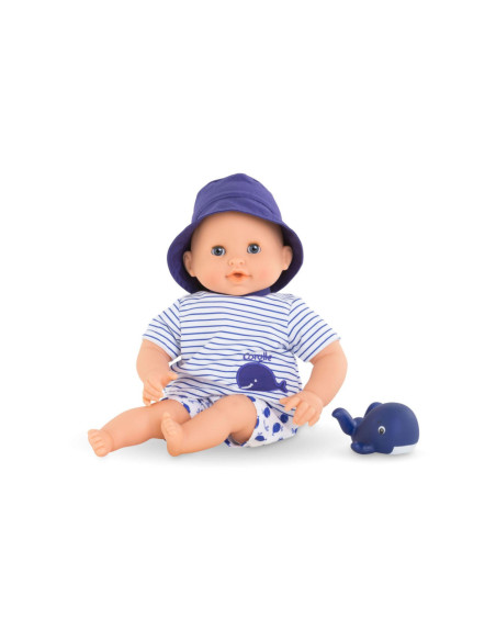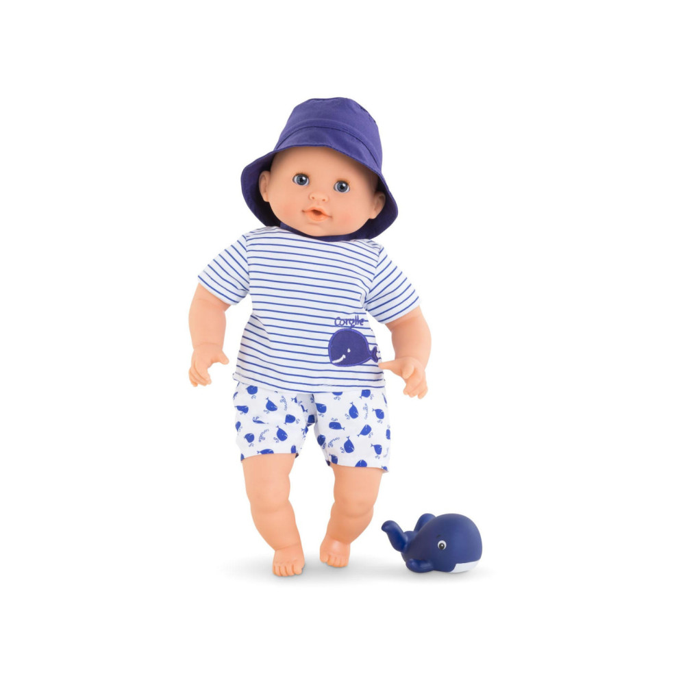 De kleine pop heeft blauwe ogen en is gekleed in een wit en blauw gestreepte blouse, geborduurd met een mooie walvis. Hij draagt een korte broek met walvisprint. Voor nog meer plezier tijdens het badderen, wordt badpop Marin vergezeld door een badwalvis, die water spuwt als je erop drukt nadat je hem hebt ondergedompeld.