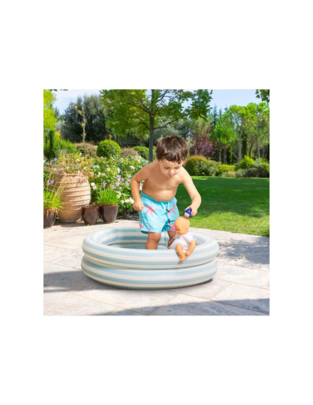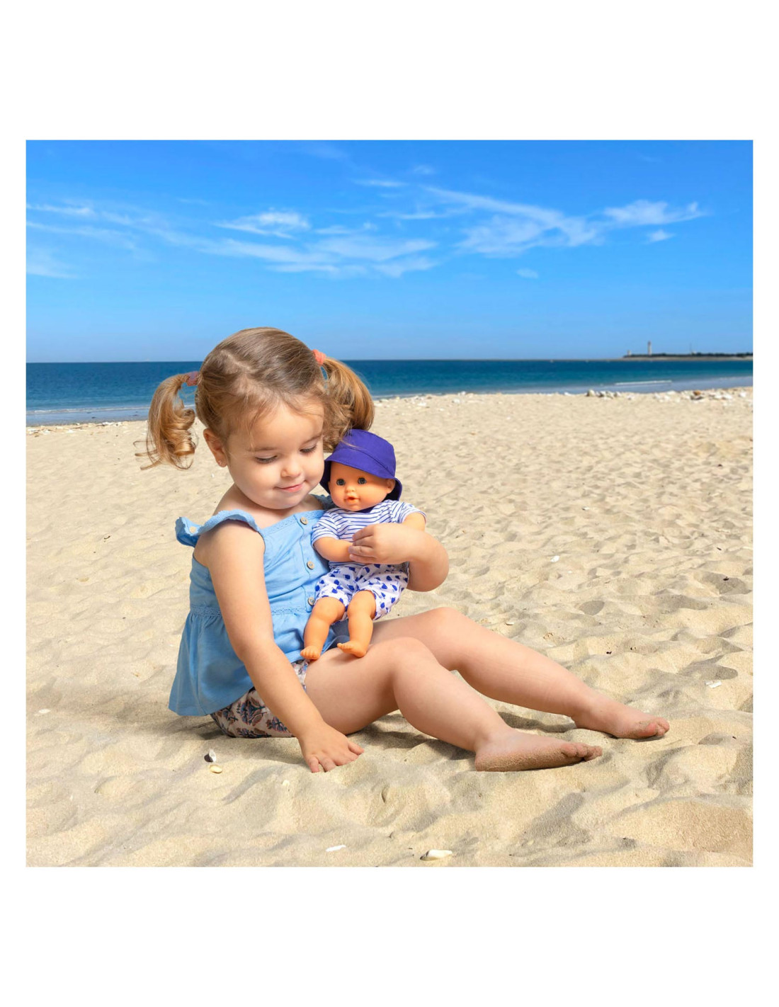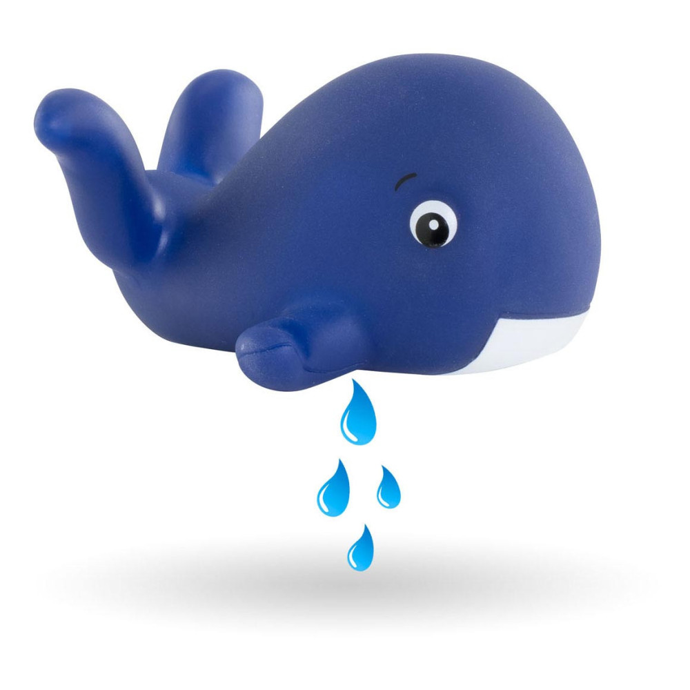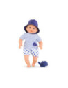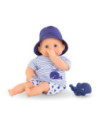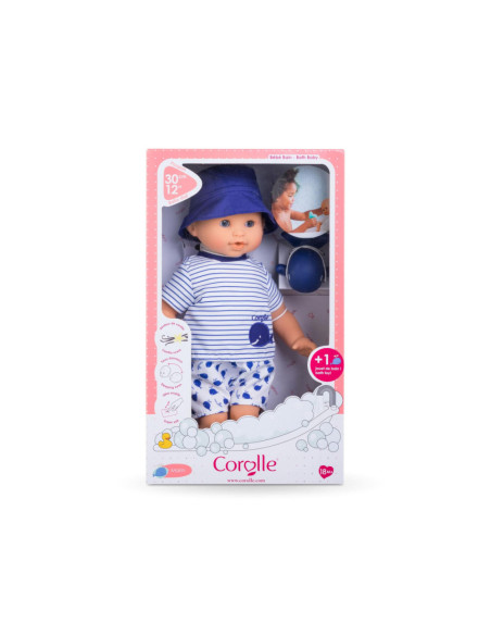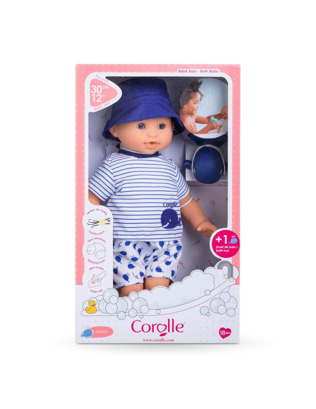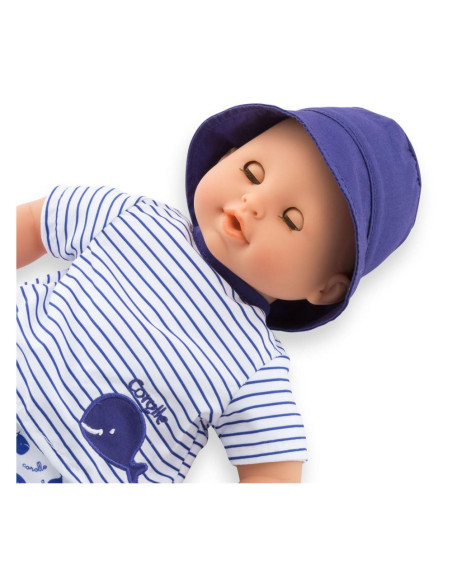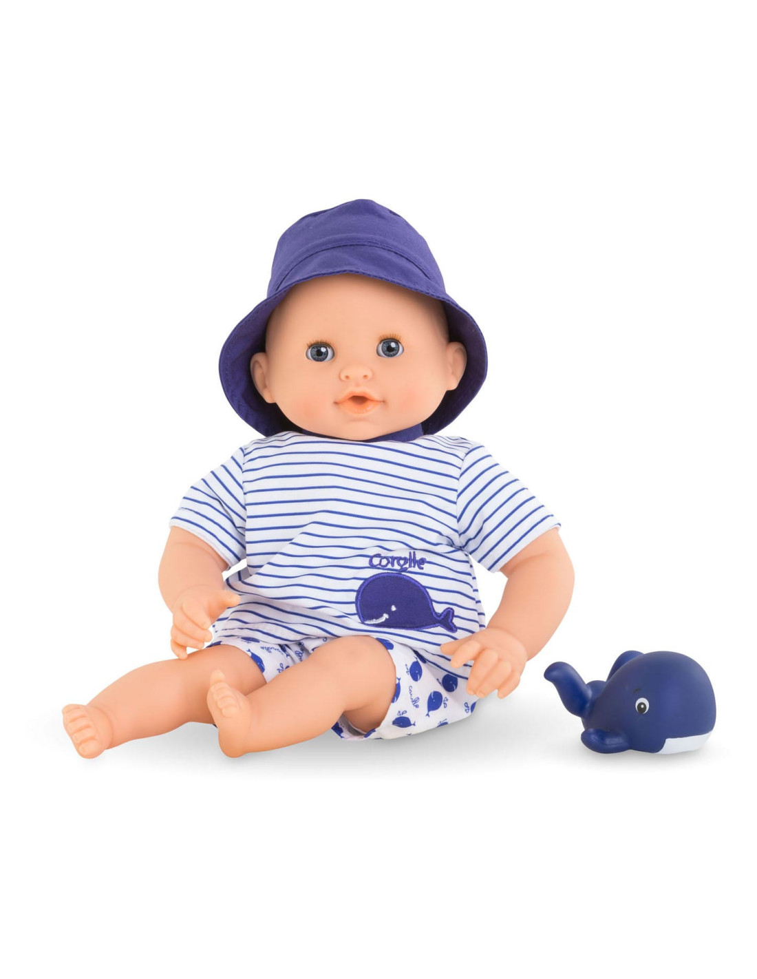De kleine pop heeft blauwe ogen en is gekleed in een wit en blauw gestreepte blouse, geborduurd met een mooie walvis. Hij draagt een korte broek met walvisprint. Voor nog meer plezier tijdens het badderen, wordt badpop Marin vergezeld door een badwalvis, die water spuwt als je erop drukt nadat je hem hebt ondergedompeld.