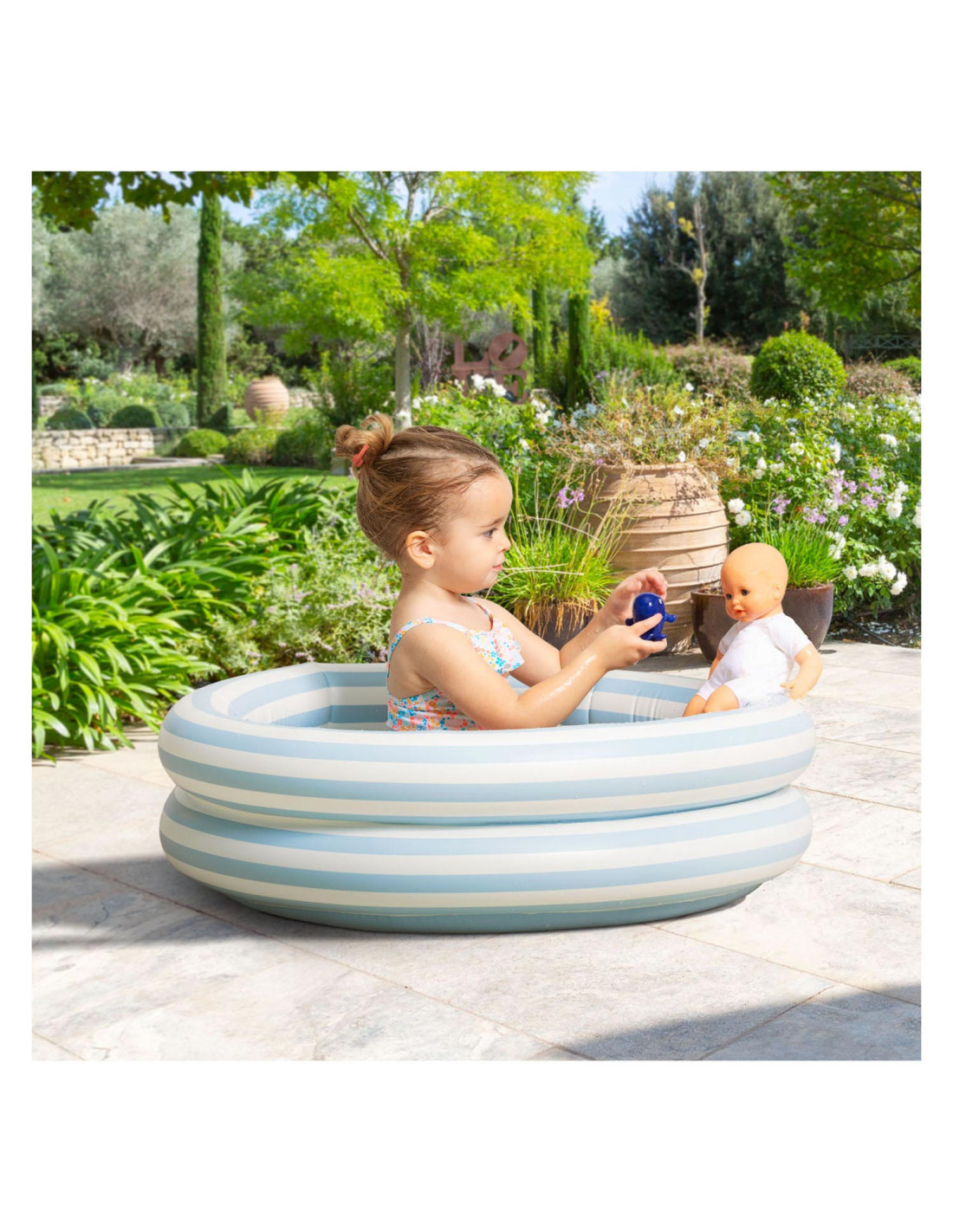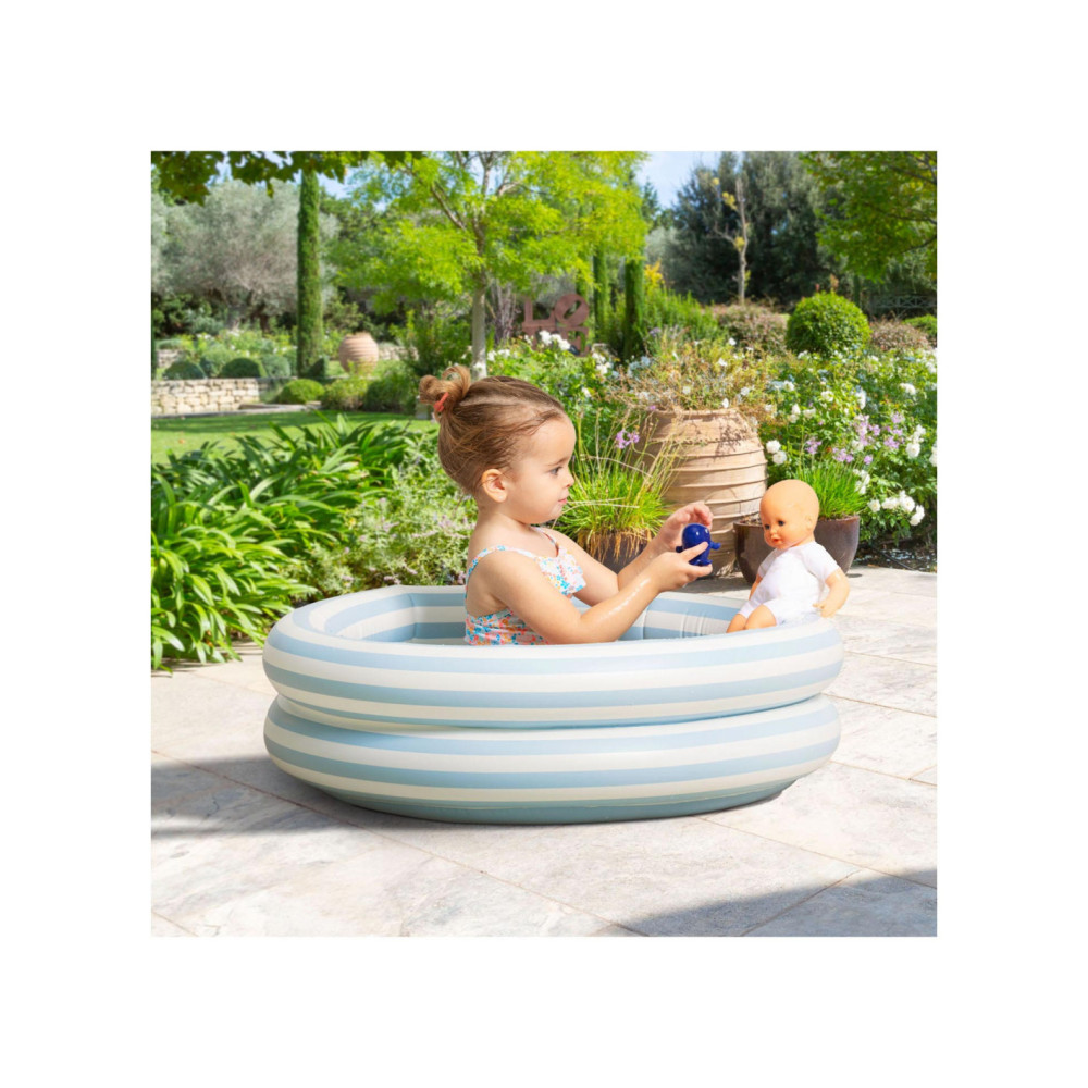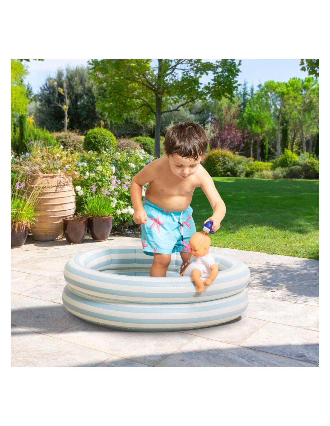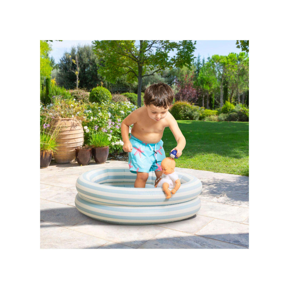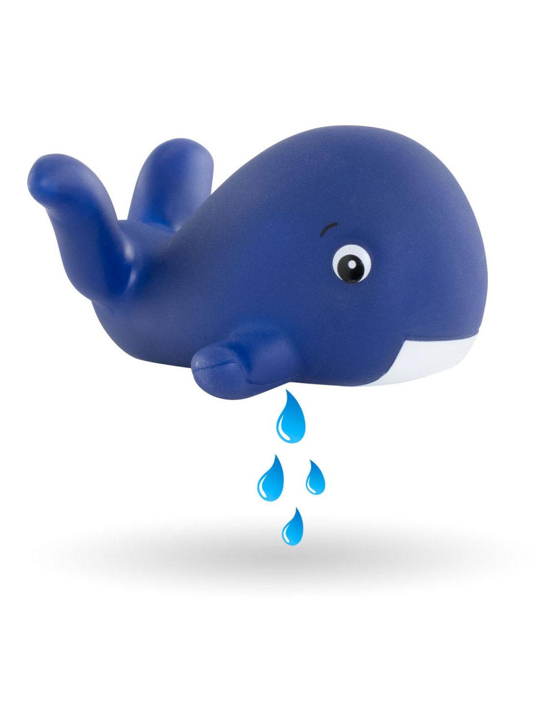 De kleine pop heeft blauwe ogen en is gekleed in een wit en blauw gestreepte blouse, geborduurd met een mooie walvis. Hij draagt een korte broek met walvisprint. Voor nog meer plezier tijdens het badderen, wordt badpop Marin vergezeld door een badwalvis, die water spuwt als je erop drukt nadat je hem hebt ondergedompeld.