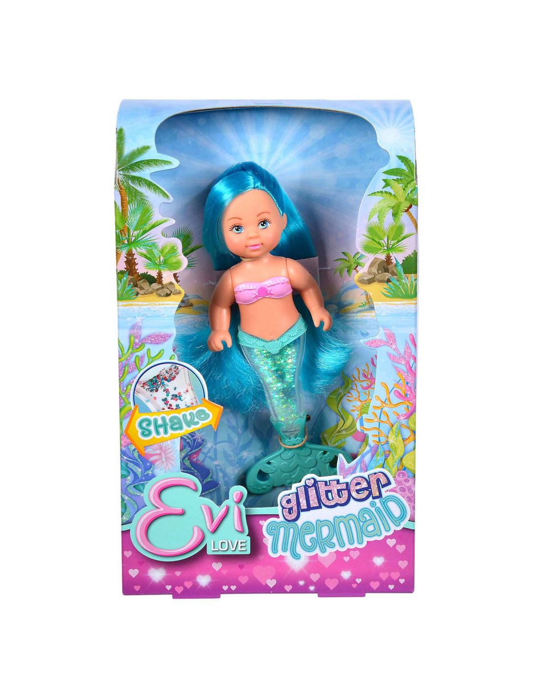 Evi is een zeemeermin geworden en zwemt rond in het water! Ze heeft een mooie beweegbare vin gekregen die gevuld is met glitters. Schud Evi heen en weer en zie de glitters bewegen in haar staart.