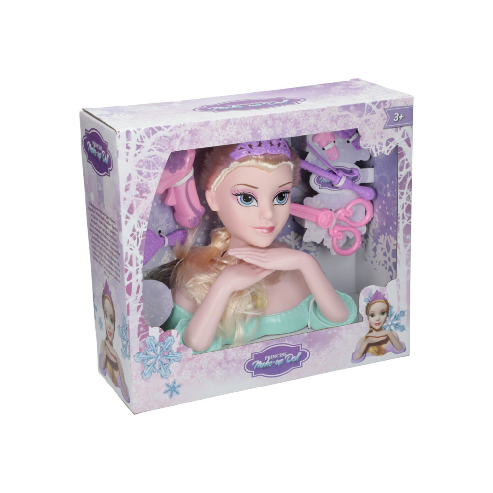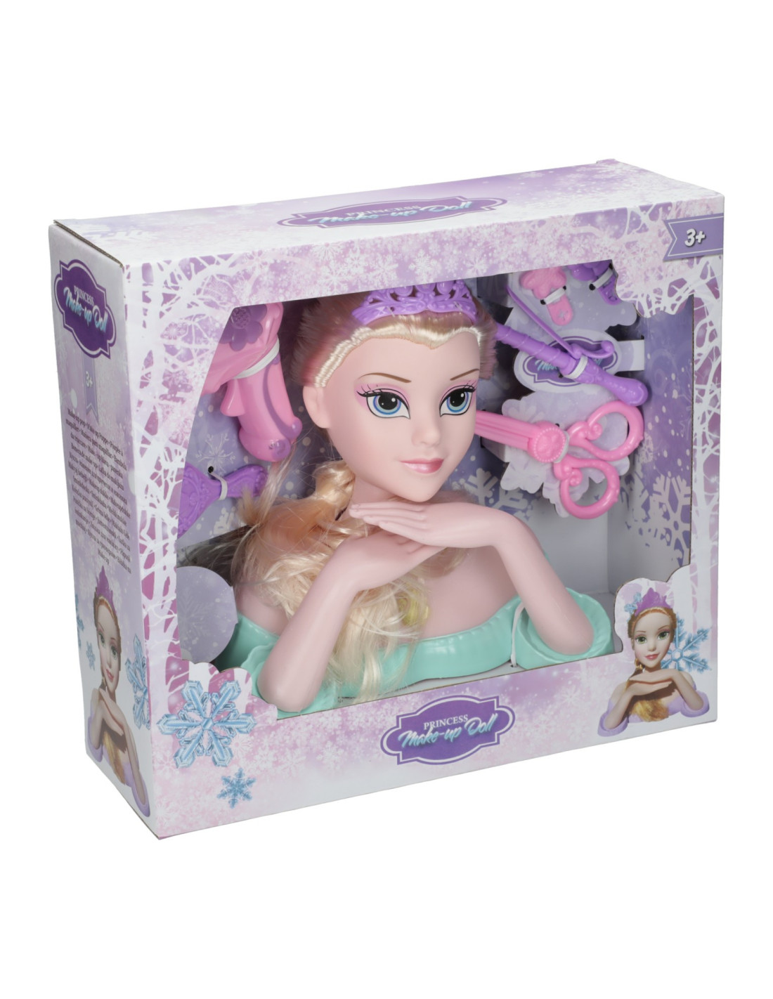 Opmaak pop met accessoires. De verpakking bevat een pop en verschillende accessoires waarmee het haar van de pop onder andere gekamd, geföhnd en versiert kan worden. De pop is 21 cm groot en bevat verschillende accessoires. De pop is geschikt voor kinderen vanaf 3 jaar.