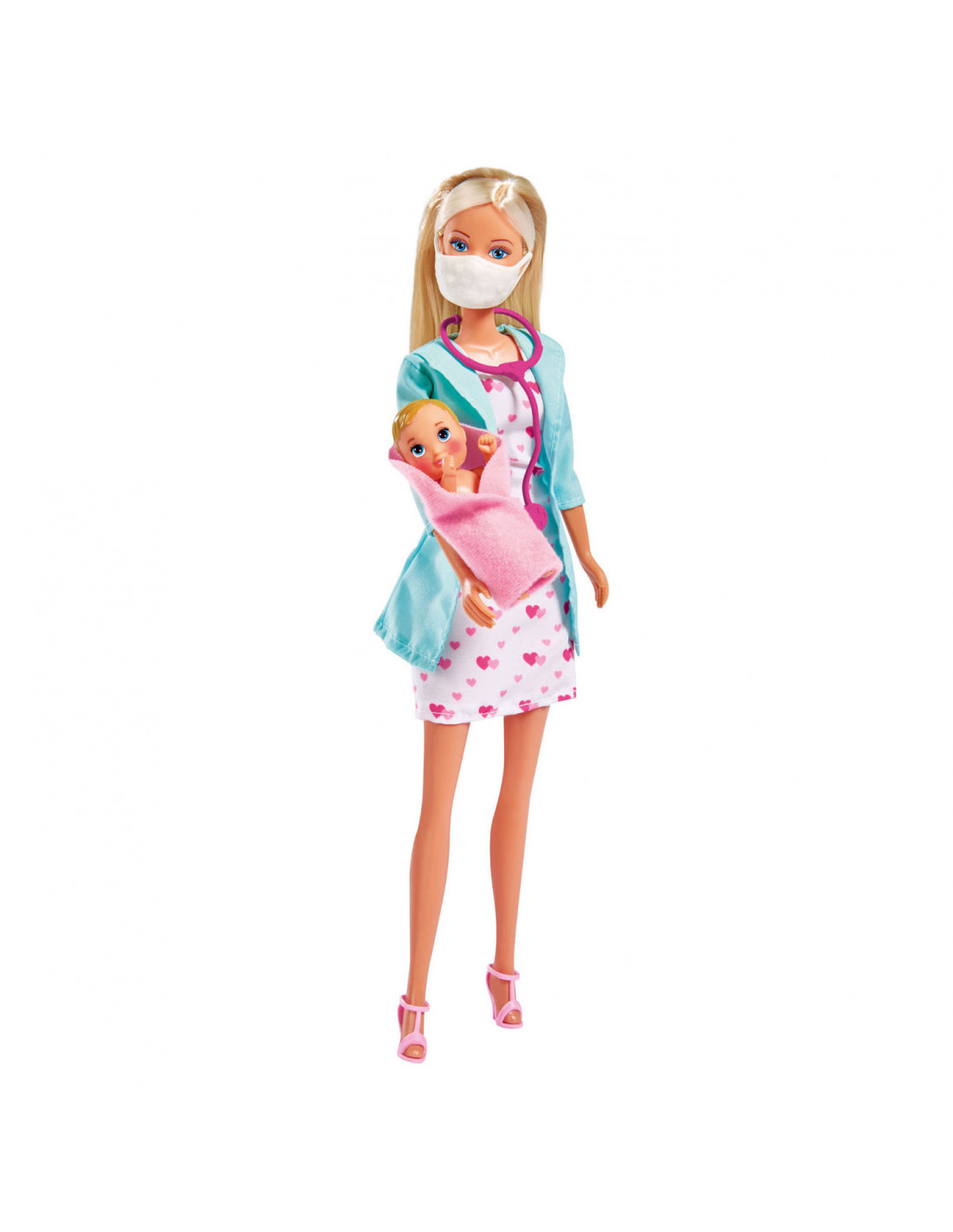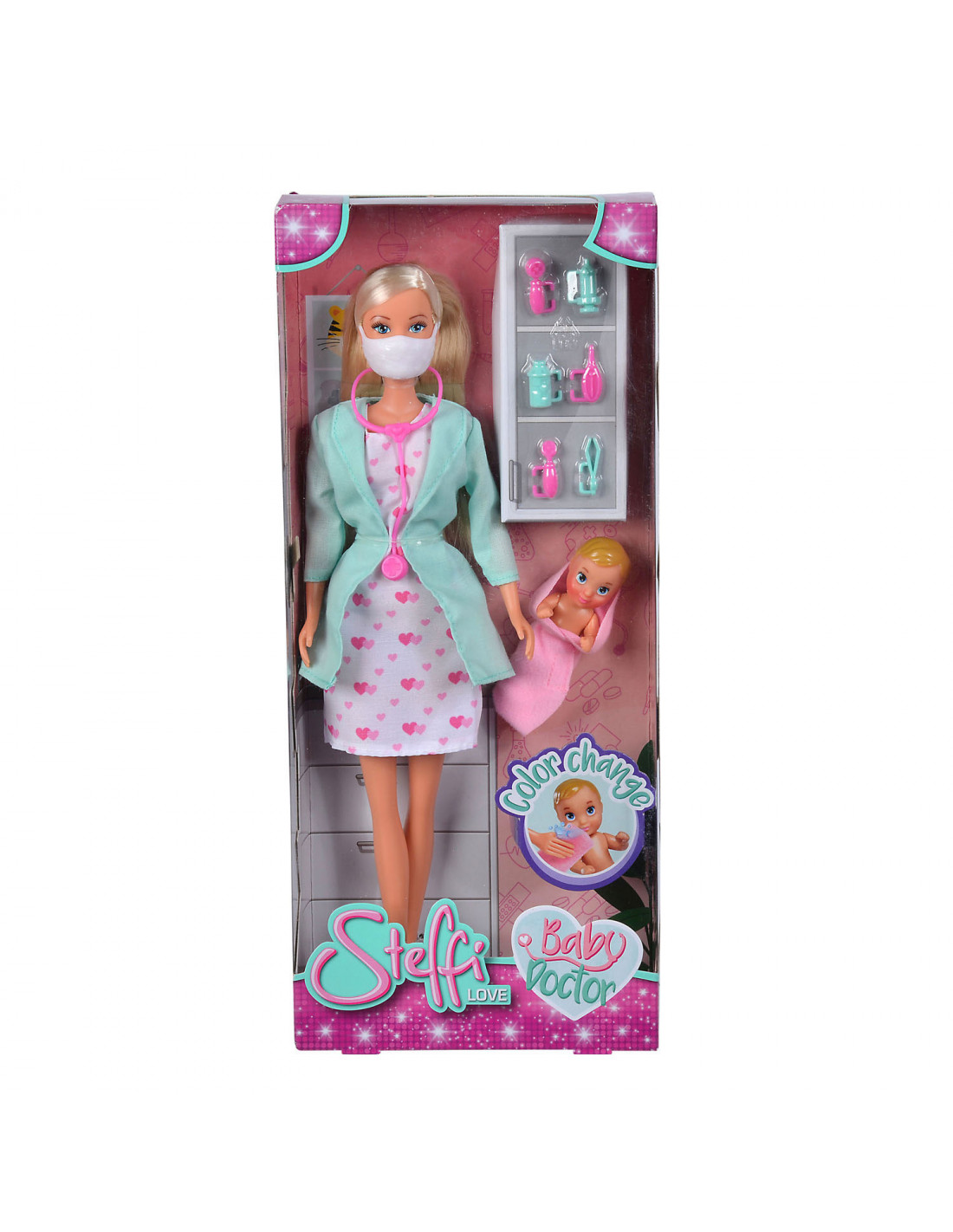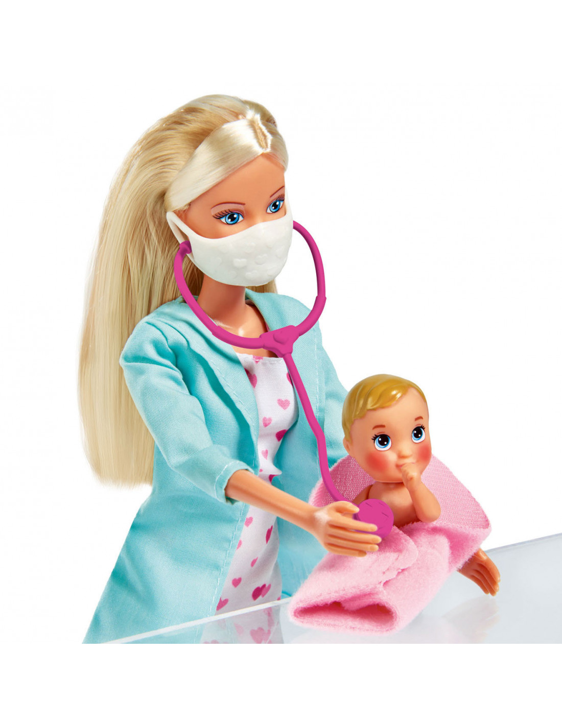 Steffi Love is in deze set een kinderarts. Steffi Love is ongeveer 29 centimeter hoog en ze draagt een doktersjas en mondkapje. De wangetjes van de baby kunnen van kleur veranderen wanneer het koorts heeft. Als je er met water overheen veegt, kan je de baby gezond maken en verdwijnt de roodheid. Geschikt voor kinderen vanaf 3 jaar.