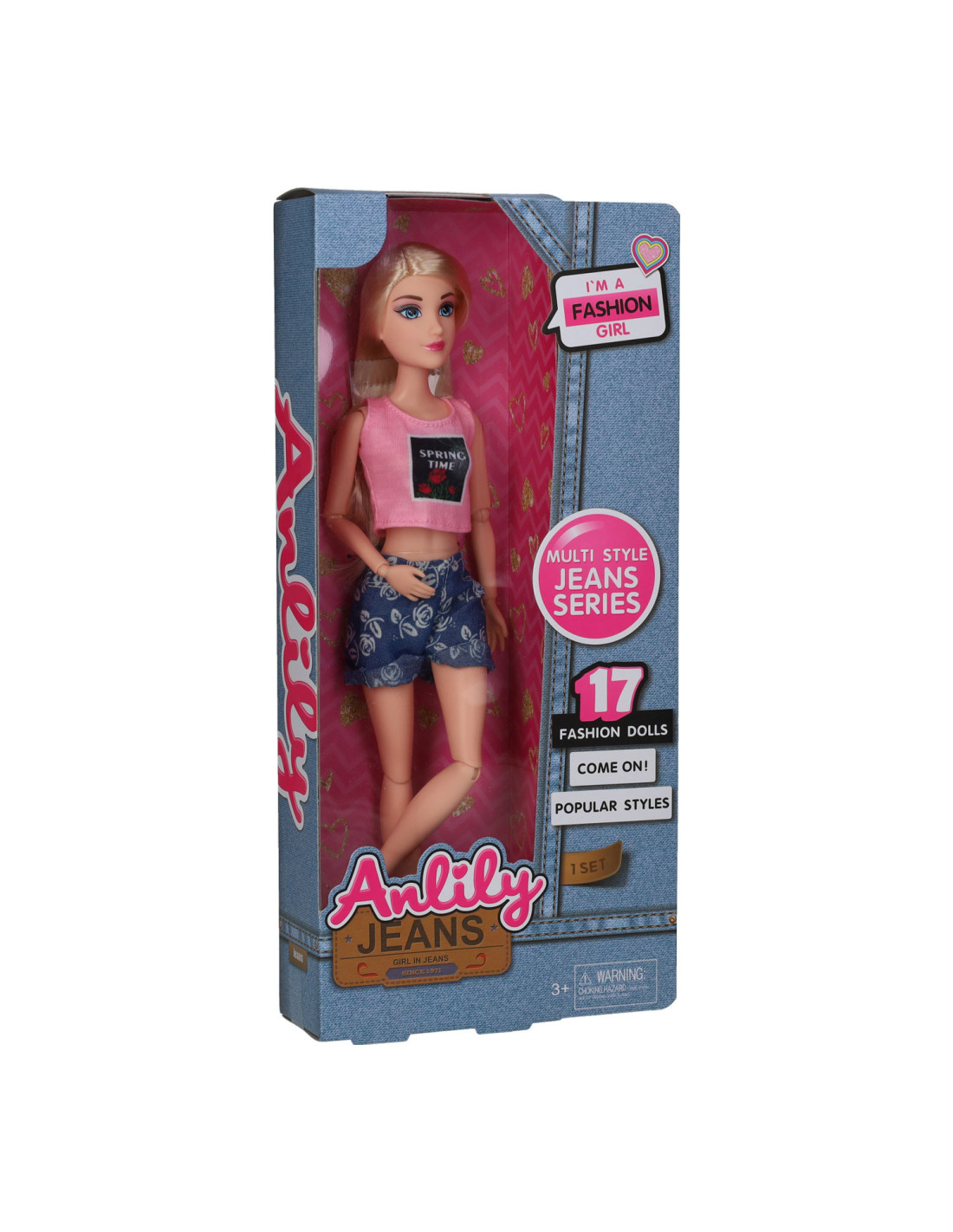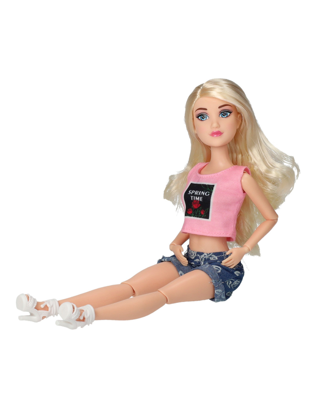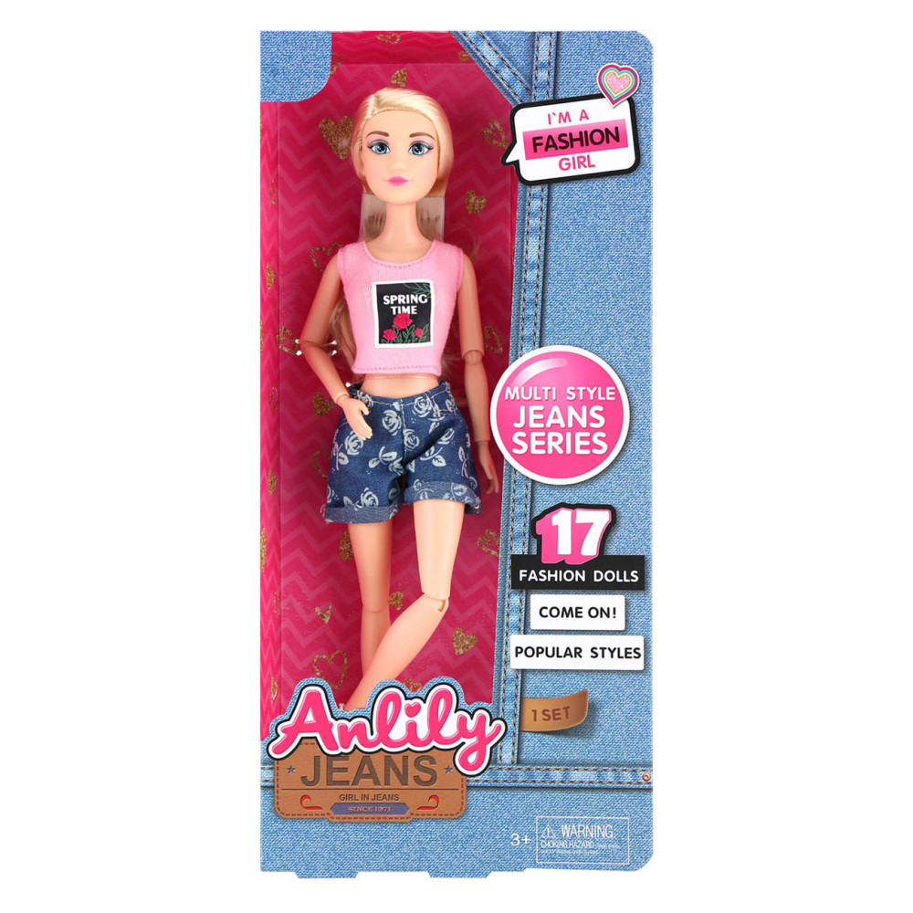 Fashion Doll Modepop Spring Time Jeans met buigbare armen en benen. De pop draagt een lenteachtig hemdje en een korte spijkerbroek. Geschikt voor kinderen van 3 jaar en ouder.