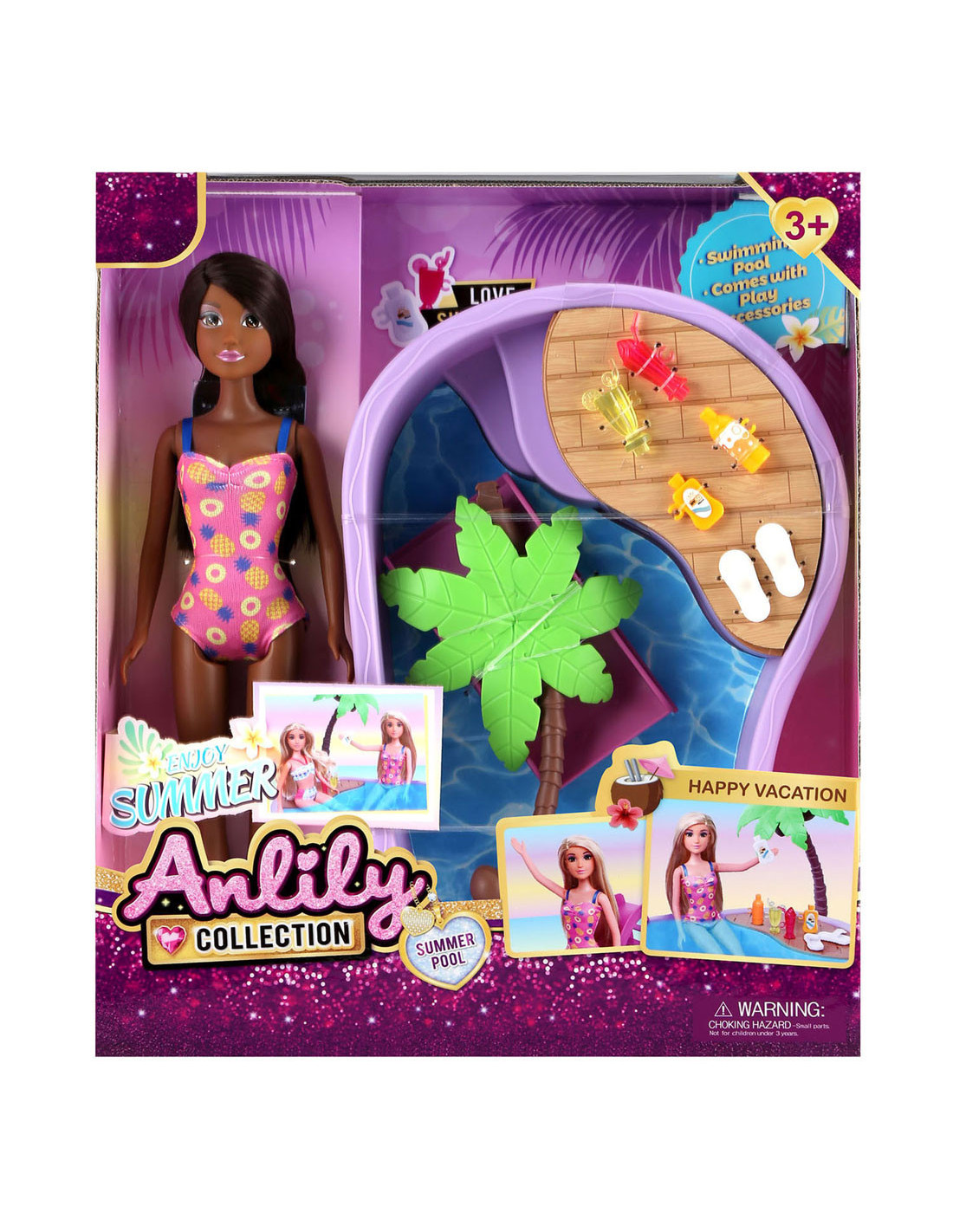 Fashion Doll Modepop Zomerset met Zwembad en Accessoires, zoals drankjes, zonnebrand en een palmboom. Inclusief 1 modepop met lange, bruine haren, een bruine huid en een roze badpak. Geschikt vanaf 3 jaar.