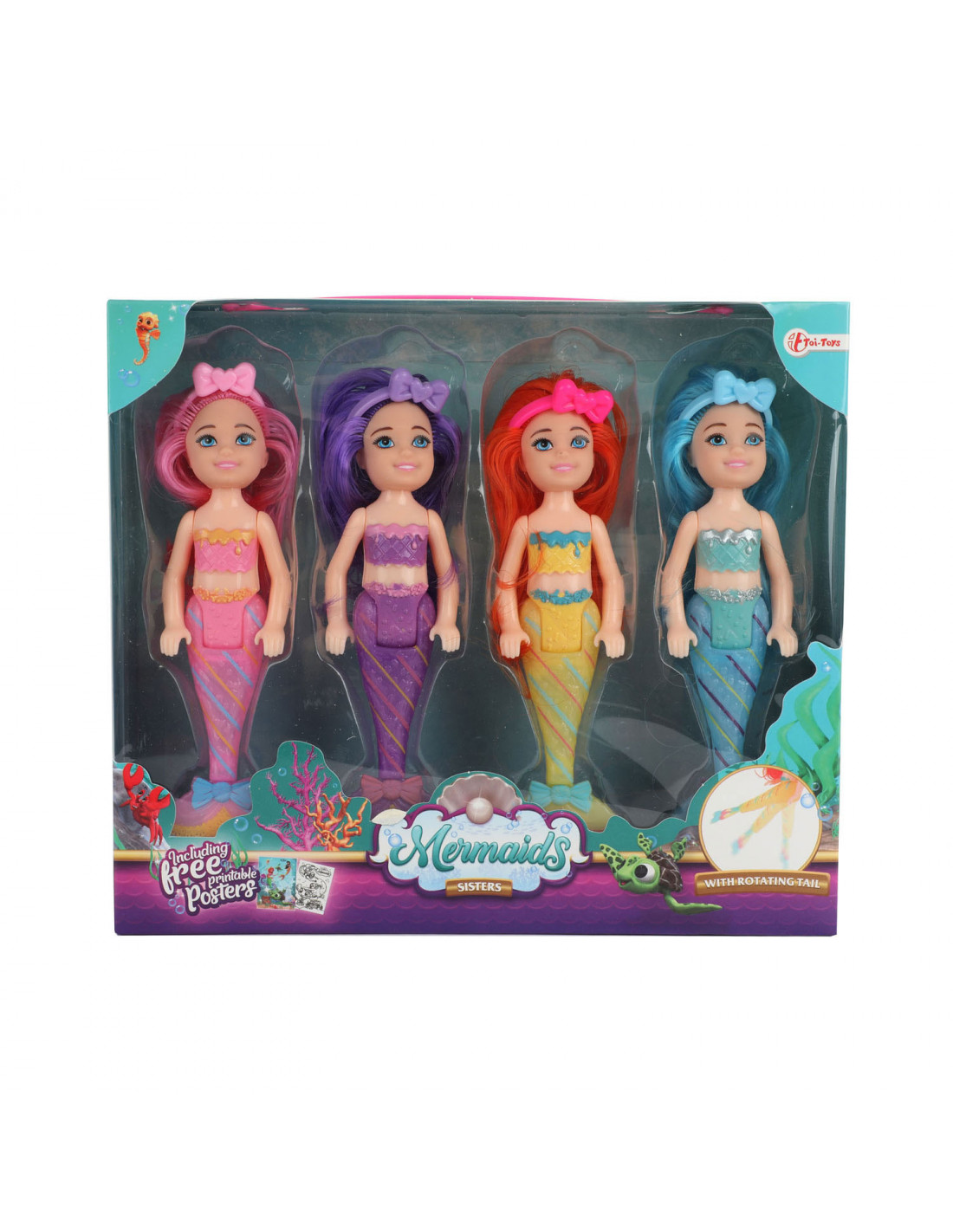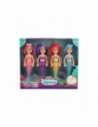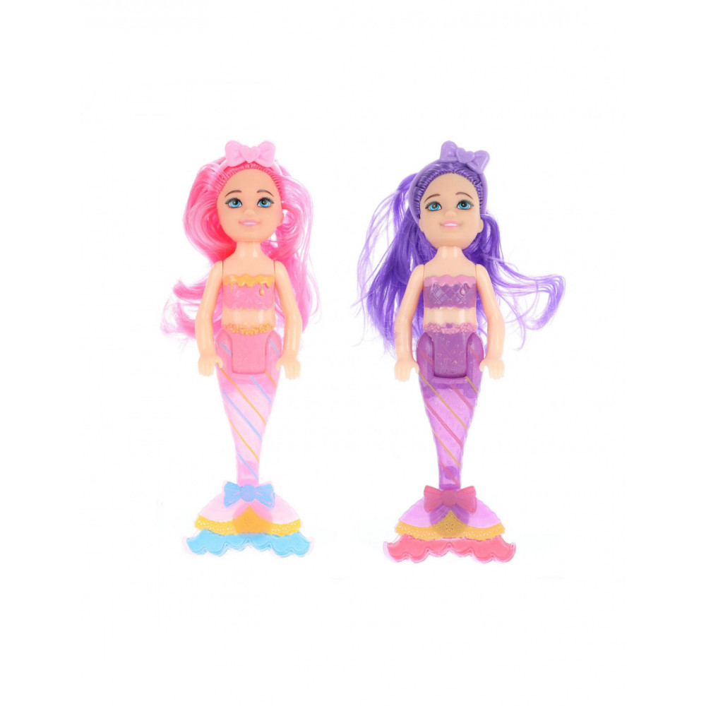 4 vrolijke zeemeerminpoppen van 15cm groot in 4 verschillende kleuren. Dit zijn de zusjes van de zee. Ze hebben allemaal lang haar in een echte knalkleur en hun vissenstaart is te buigen. Zo kunnen ze vlug zwemmen maar ook zitten op het strand.