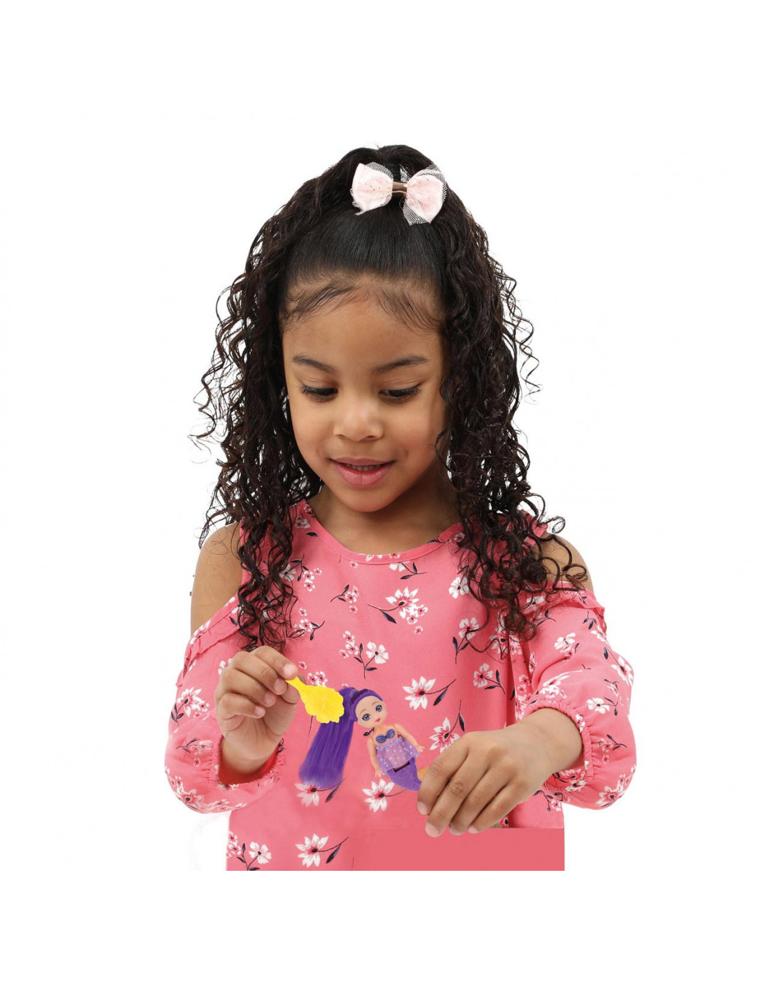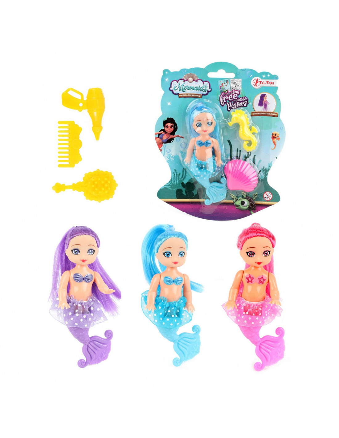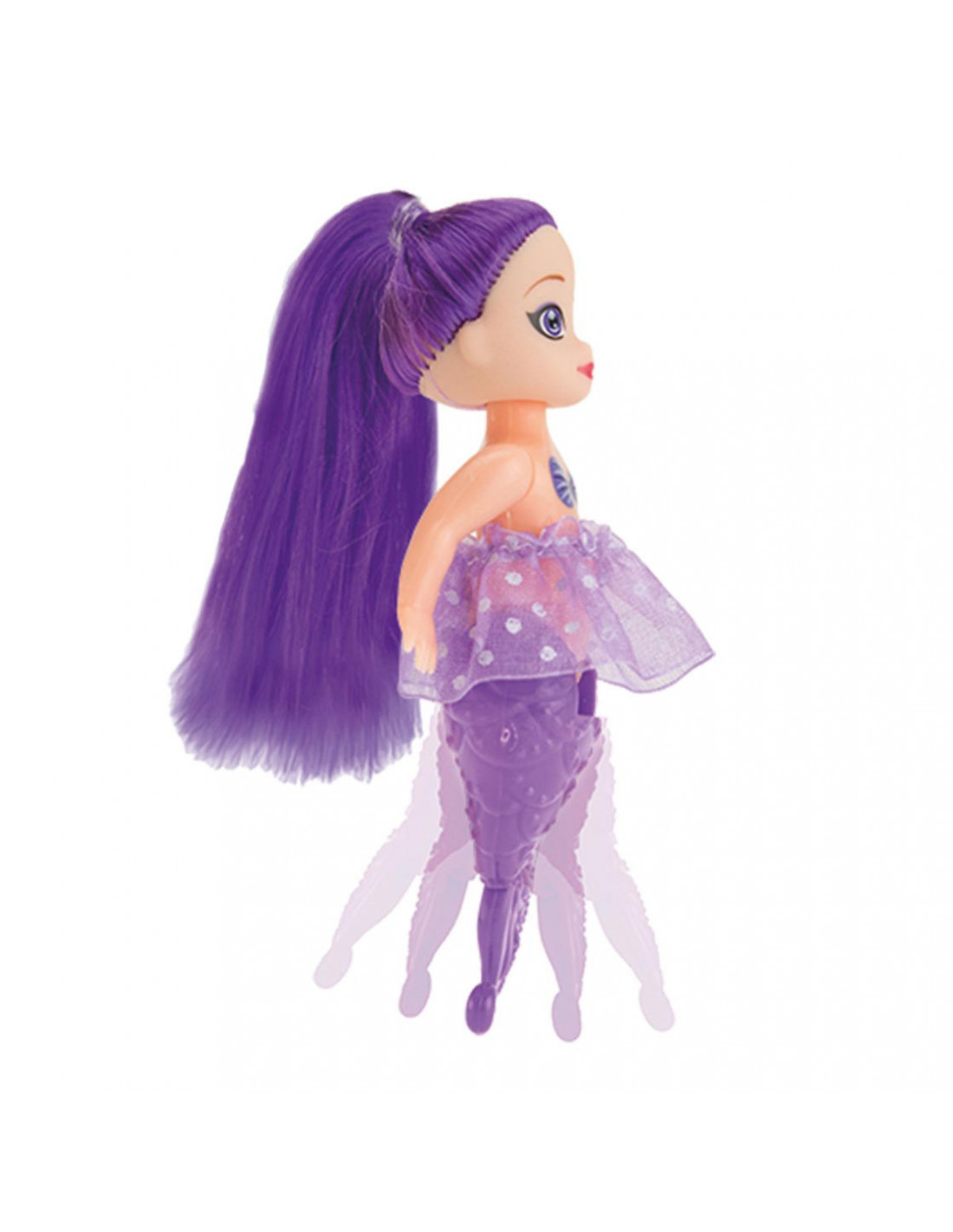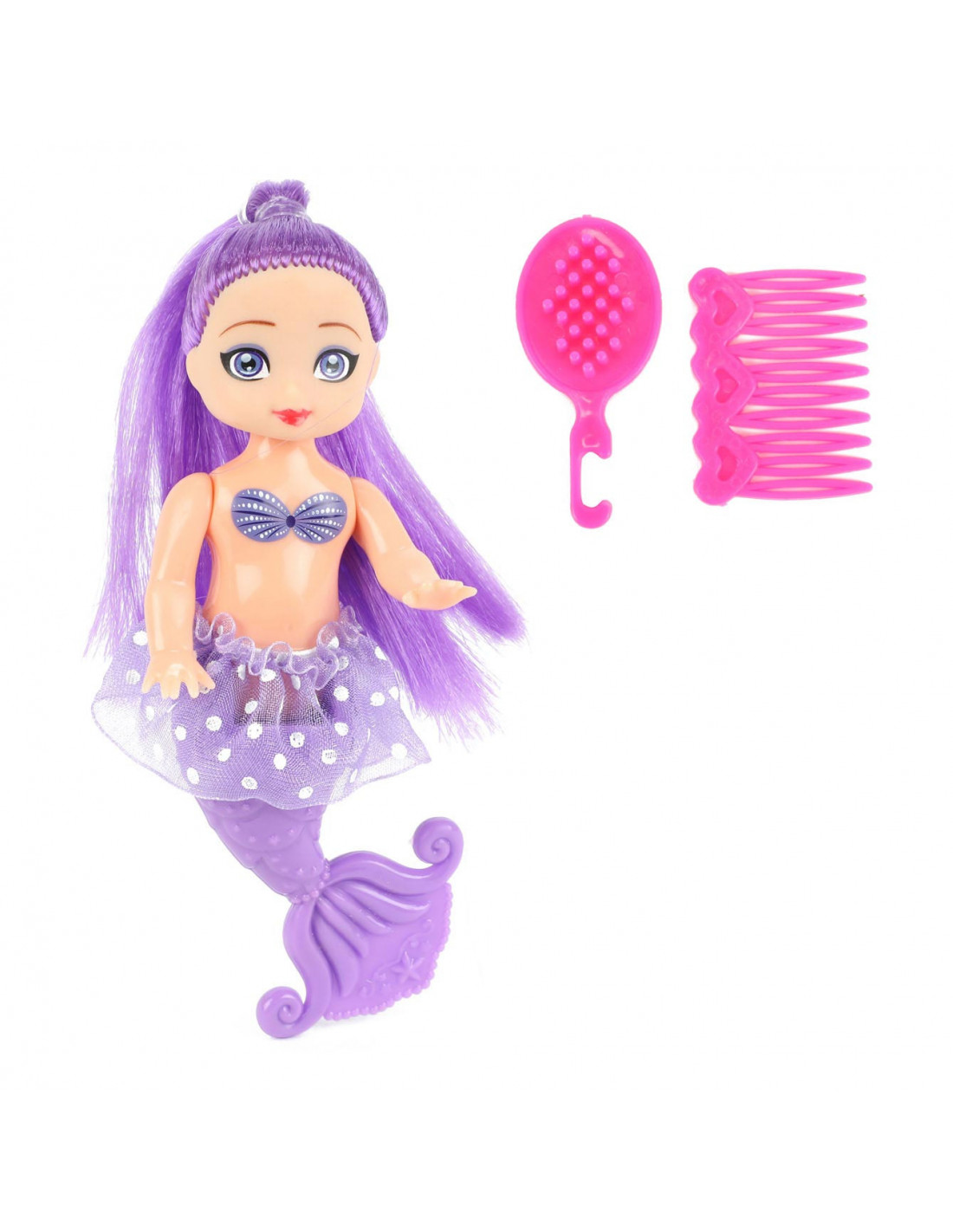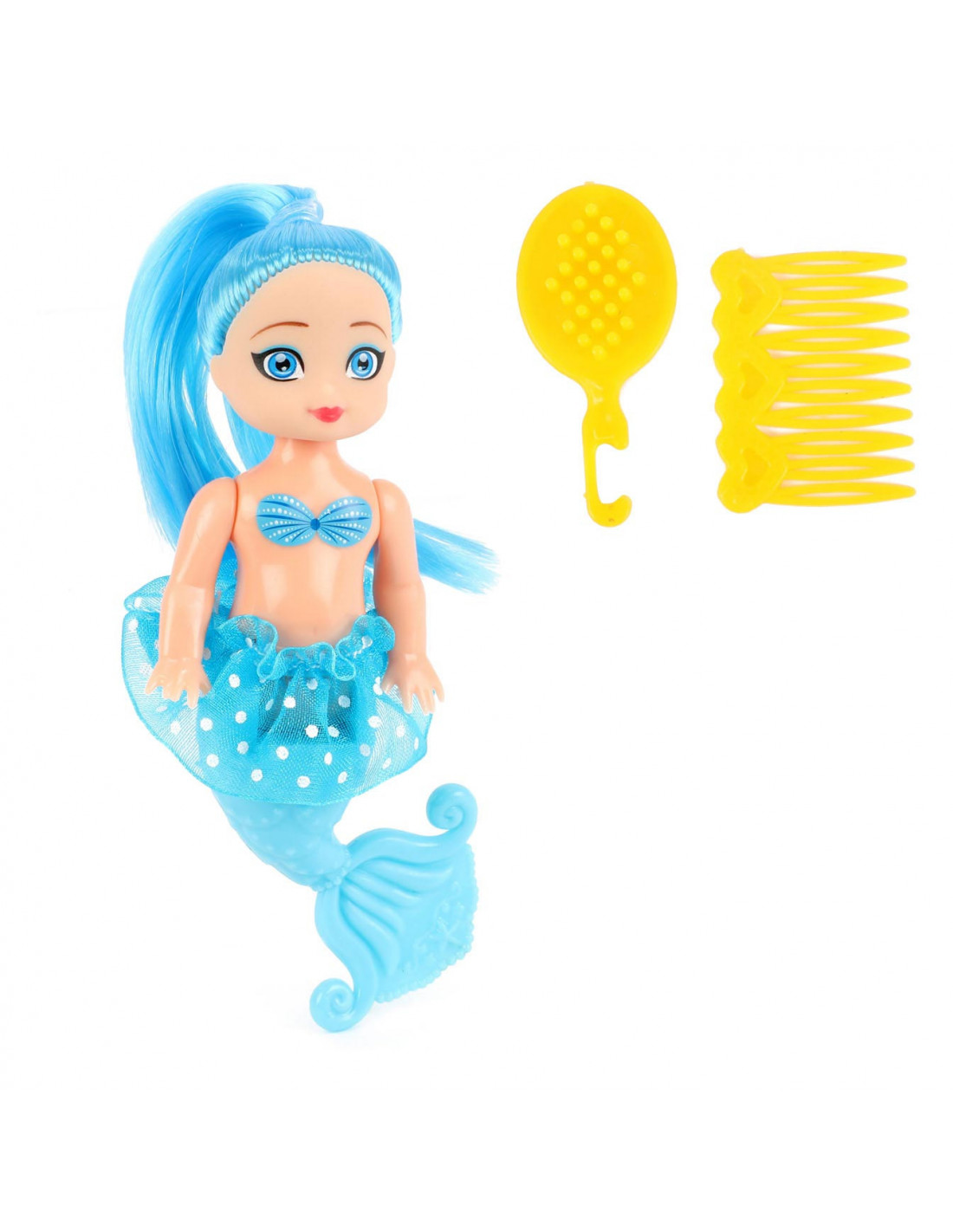 Deze kleine schattige zeemeerminpop is 12cm groot. Ze heeft lang haar in een vrolijke knalkleur en een rokje aan. Doordat haar vissenstaart kan buigen kun je haar laten zitten terwijl je haar haren kamt met de kleine borstel of kam. De onderwaterprinses is in 3 verschillende kleuren te verkrijgen. Weet je al welke jij het mooist vindt?