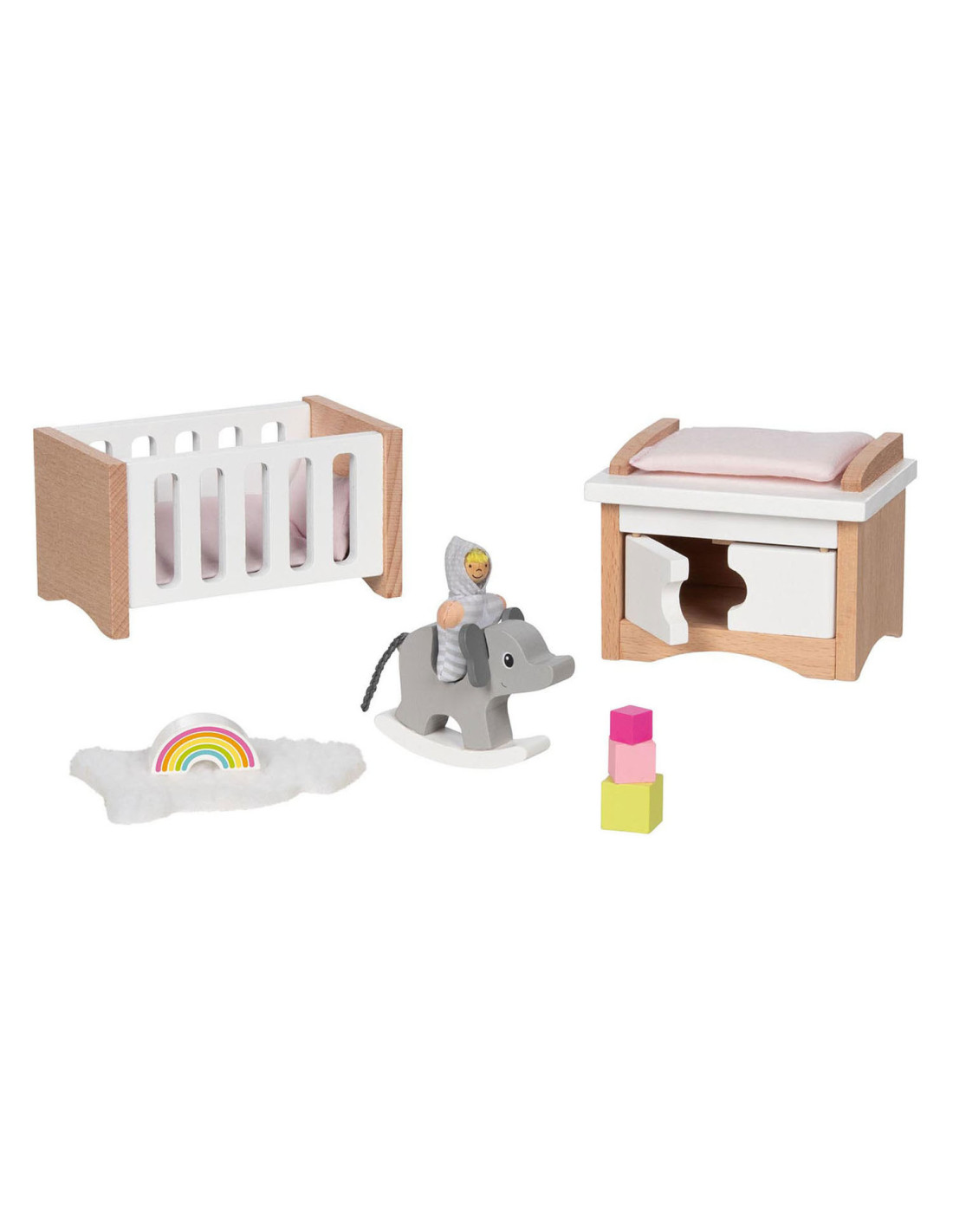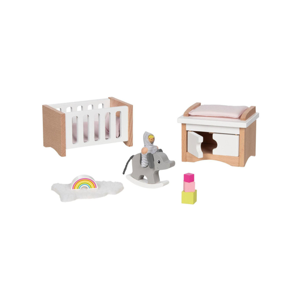 Goki poppenhuismeubels voor de babykamer, 10dlg. Gemaakt van hout en geschikt voor kinderen vanaf 3 jaar oud.