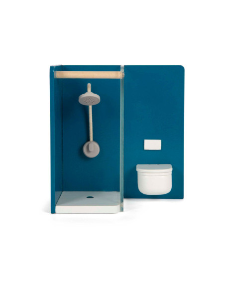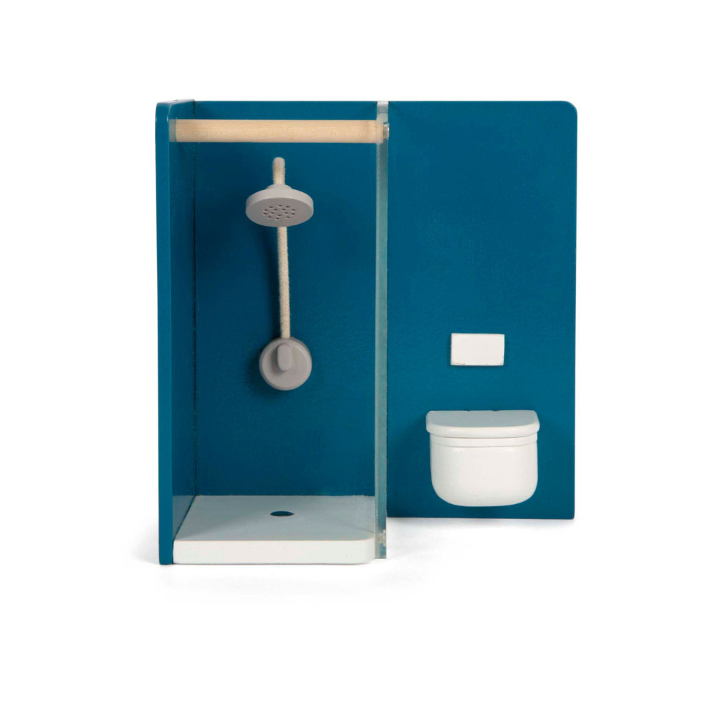 Poppenhuisbadkamer met inloopdouche, wastafel, toilet en accessoires. Geschikt voor kinderen vanaf 3 jaar.
