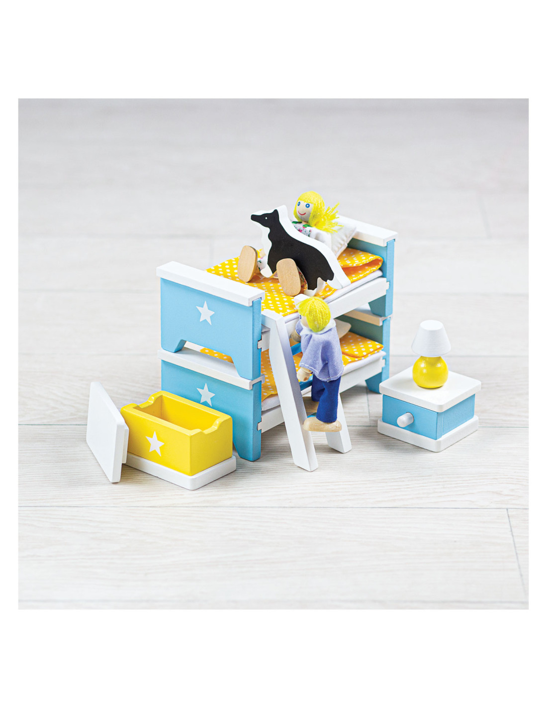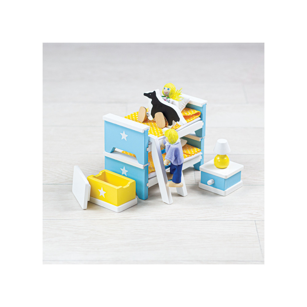- Bestaat uit: twee opgemaakte poppenbedden, ladder, poppennachtkastje met nachtlamp en poppenopbergbak.