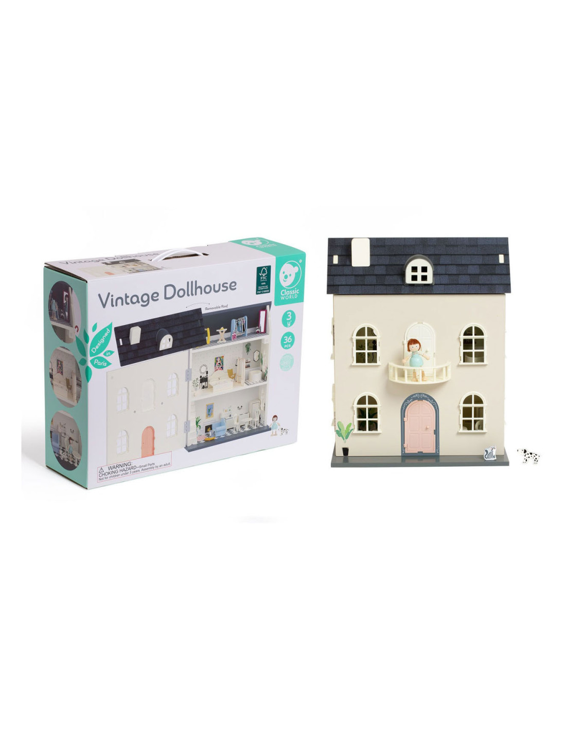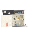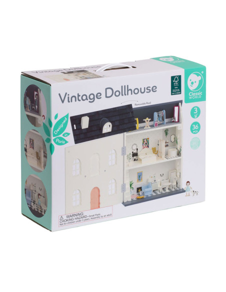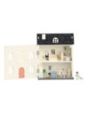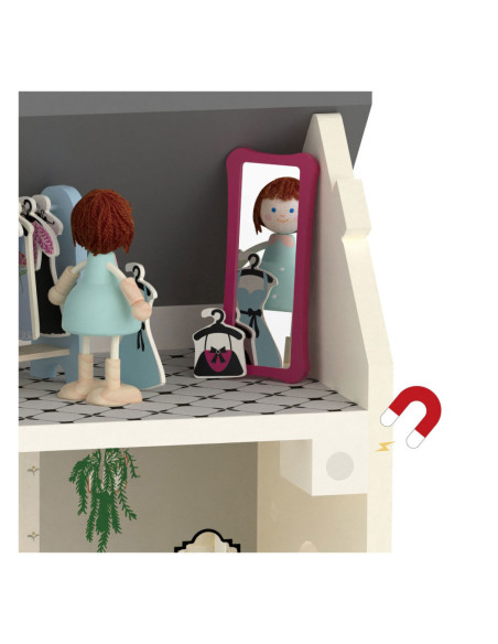 verdiepingen, mooi gedecoreerd met diverse meubels. Open de deuren van het huis om te spelen en sluit ze om alles erin op te bergen en het gemakkelijker te vervoeren. Kinderen kunnen hun eigen wereld creëren en hun eigen verhalen verzinnen! Het huis kan via het dak worden geopend voor betere toegang tot verschillende kamers. Meubels omvatten: accessoires om uw huis te decoreren: een bed met hoezen, badkuip, bank, lamp, tafel, 2 stoelen, een keuken, een koelkast en etc.