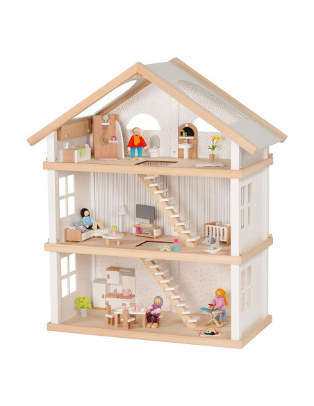 Het grote, speelbare houten poppenhuis biedt eindeloos veel ruimte voor veel meubels en een grote buigbare poppenfamilie. Creativiteit en open spel worden hier gestimuleerd en de verbeelding wordt gestimuleerd tot rollenspel. Sociale interacties worden nagebootst en geoefend met broers en zussen en vrienden door alledaagse huiselijke taferelen na te spelen.