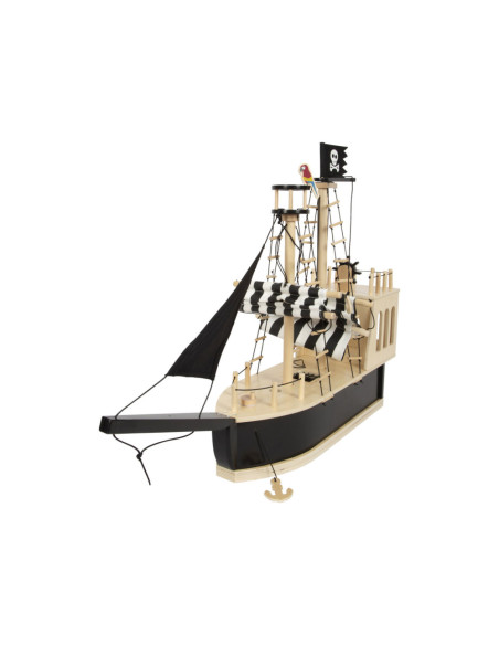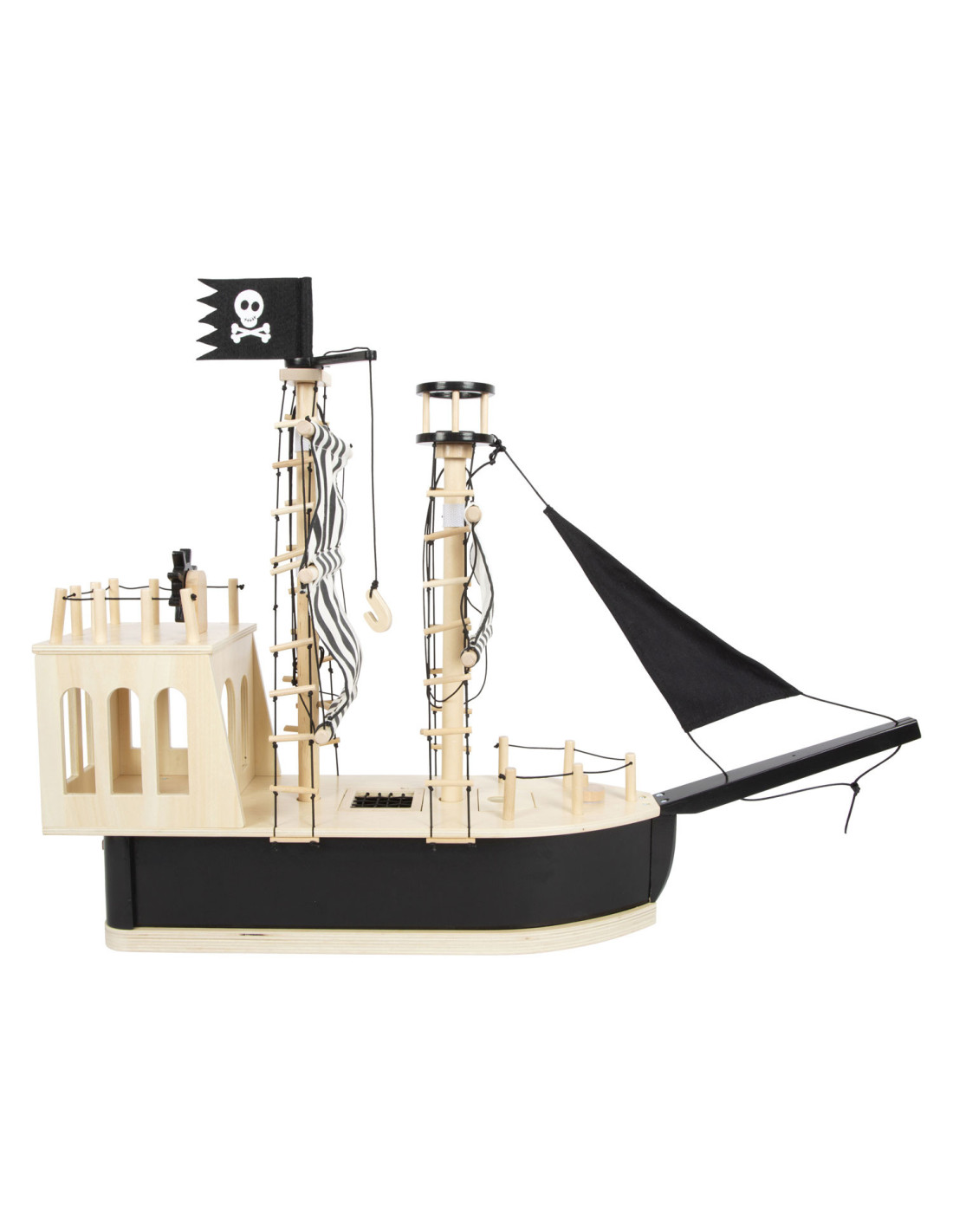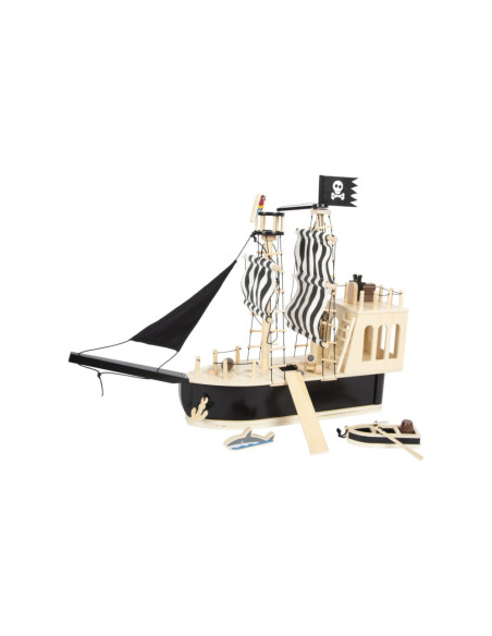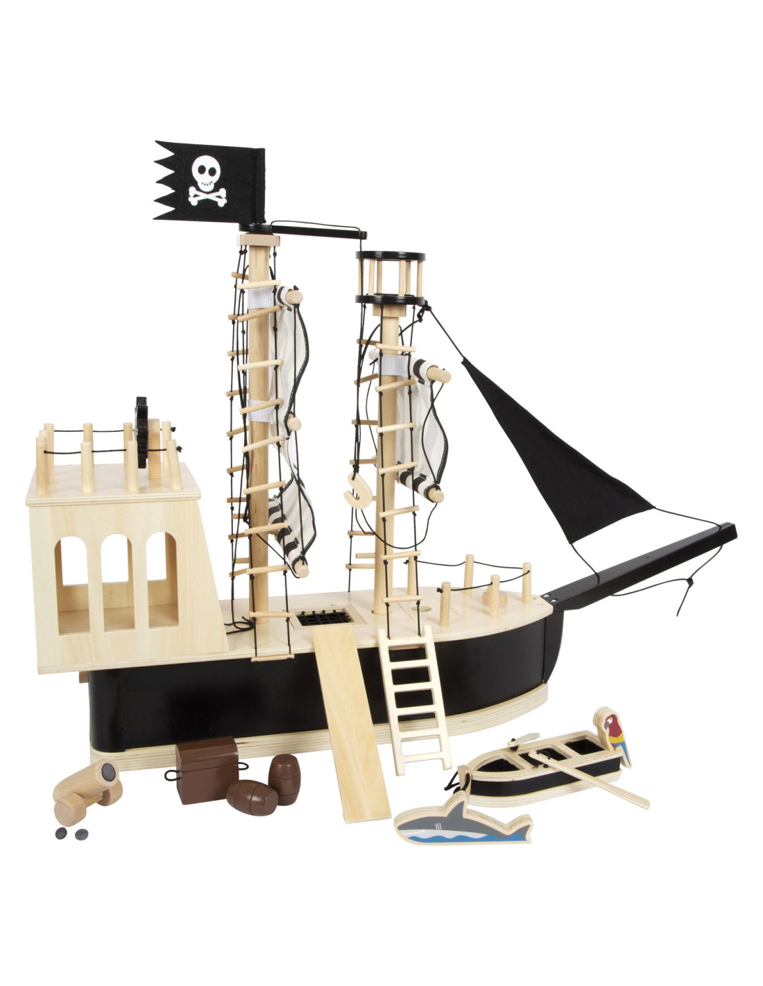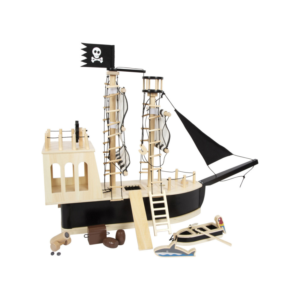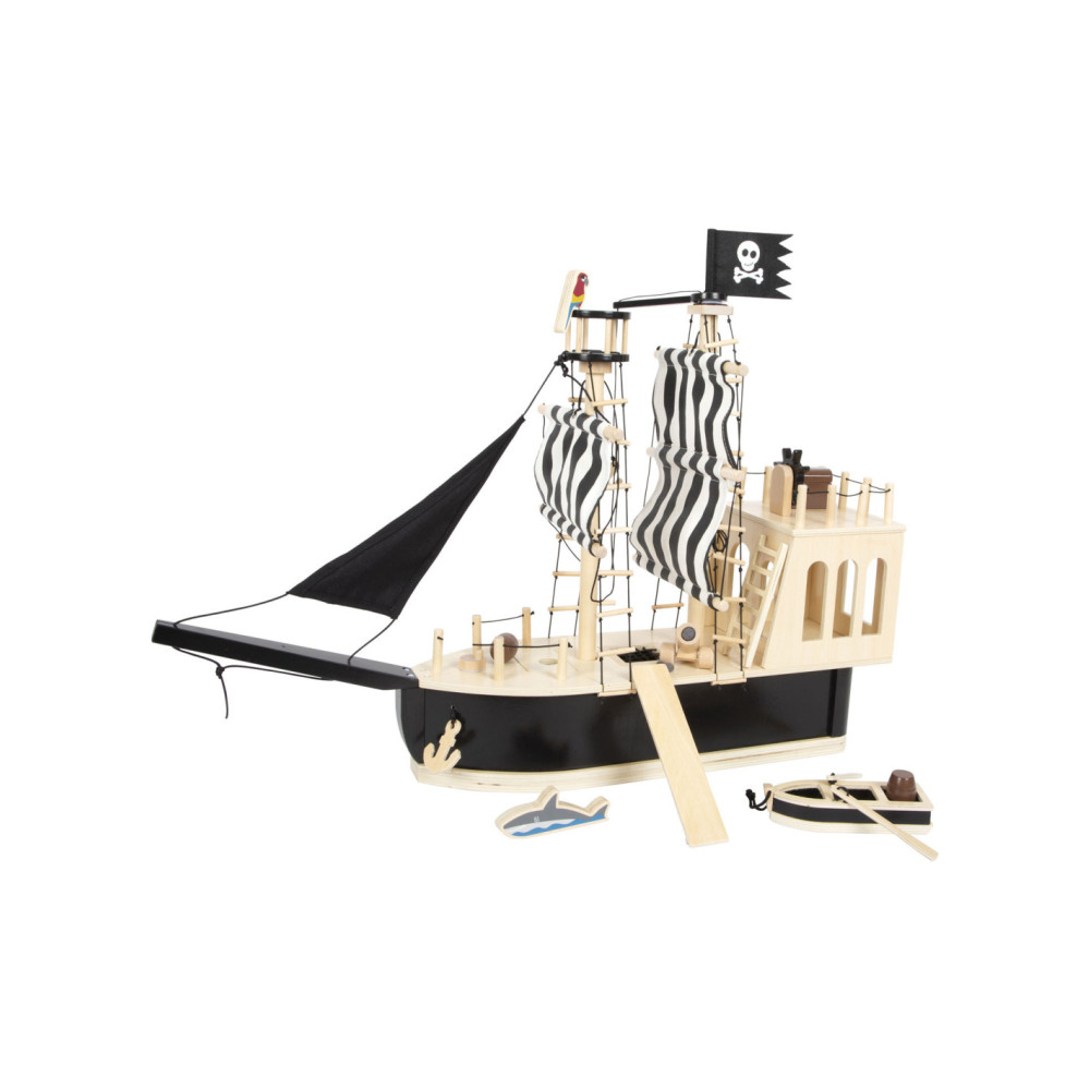 Ahoy piraten! Dit rijk gedetailleerde piratenschip van robuust hout laat wensen uitkomen met tal van authentieke details! Naast het ruime tweemasterschip bevat de uitgebreide speelset ook een rubberboot waarmee twee buigpoppen kunnen roeien, een haai, een papegaai, een schatkist, een kanon, twee tonnen, een plank en natuurlijk een coole piraat vlag. Alle zeilen kunnen met touwen worden gehesen en gehesen, net als op een echt schip. Het kanon dat zijn drie vilten kanonskogels door de lucht schiet, zorgt voor extra speelplezier!