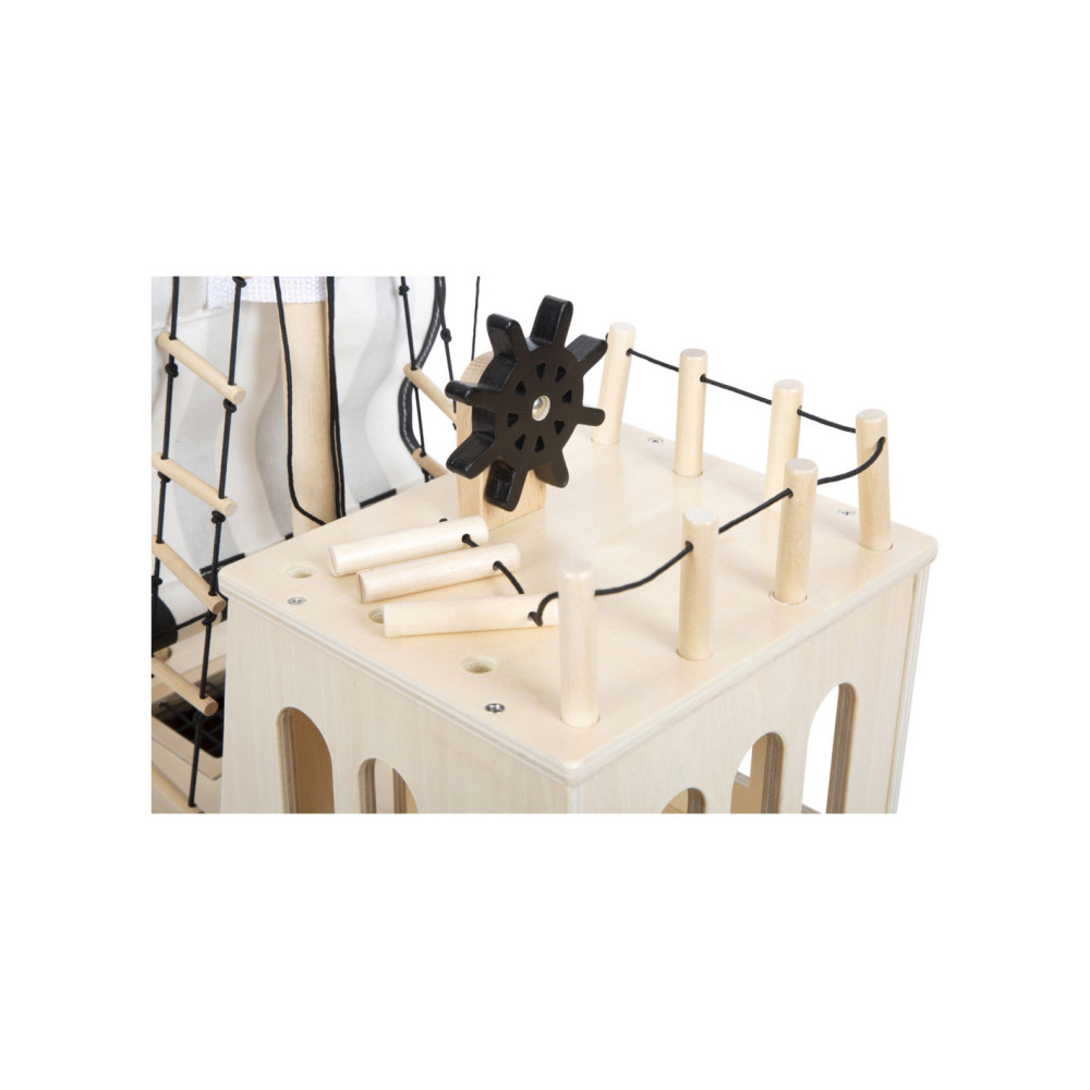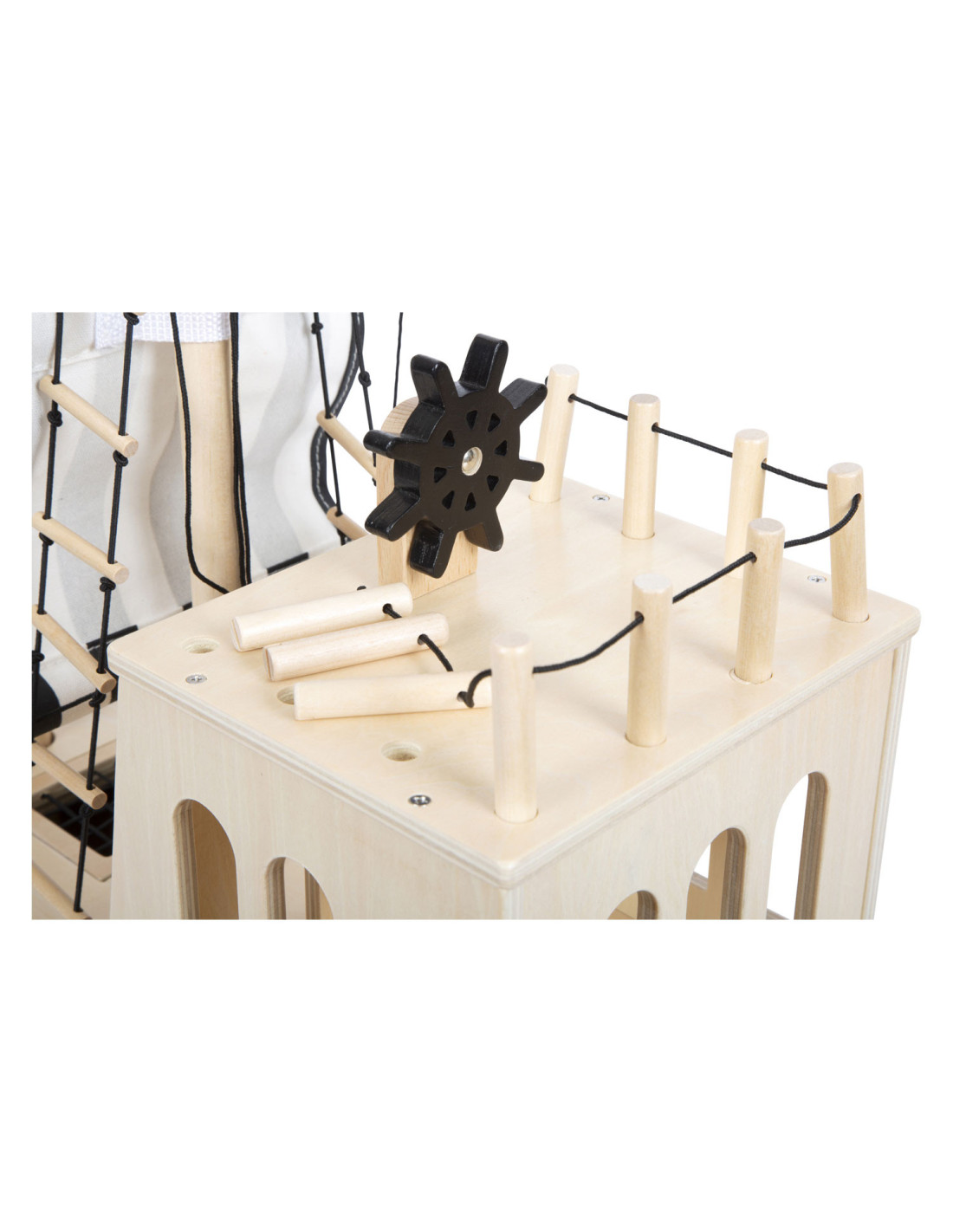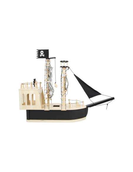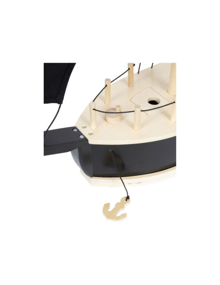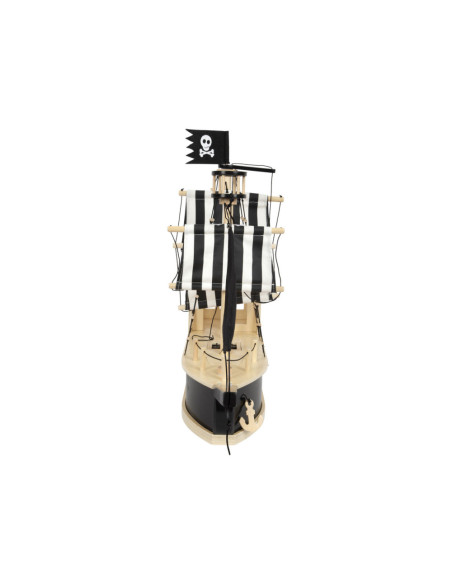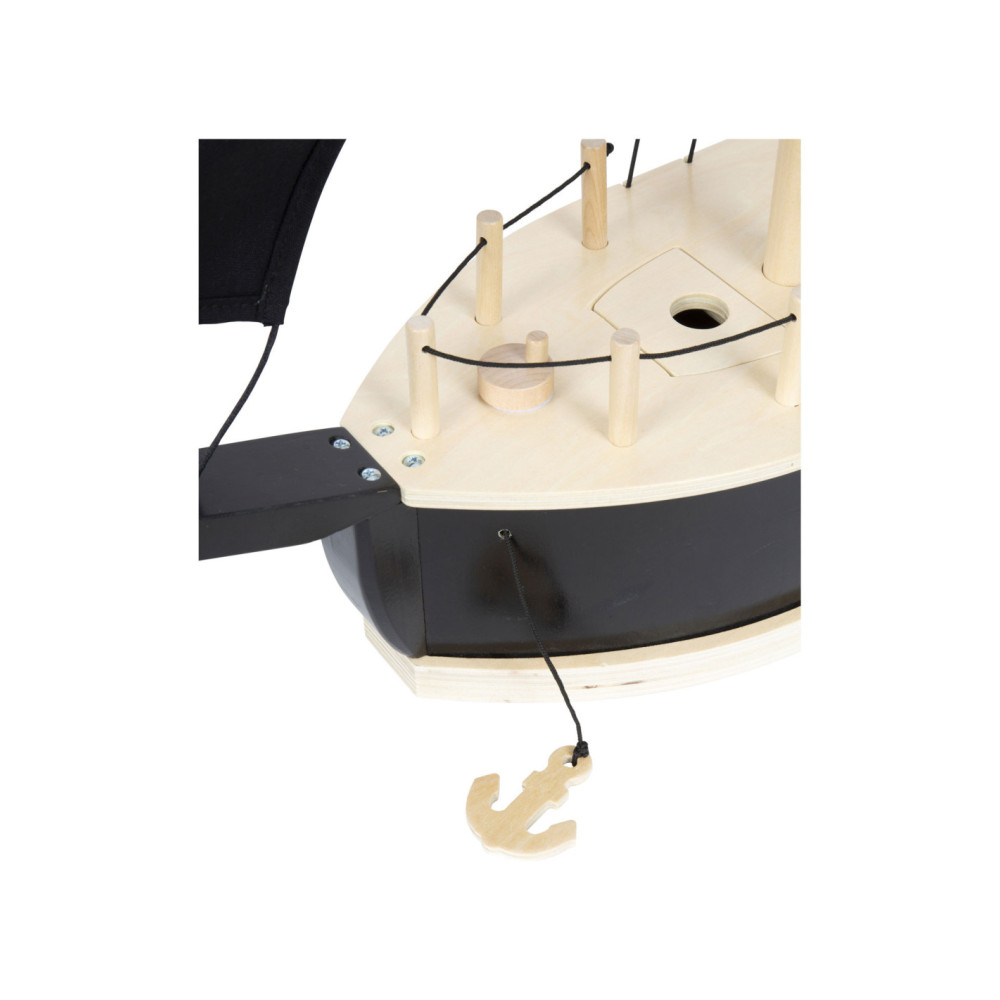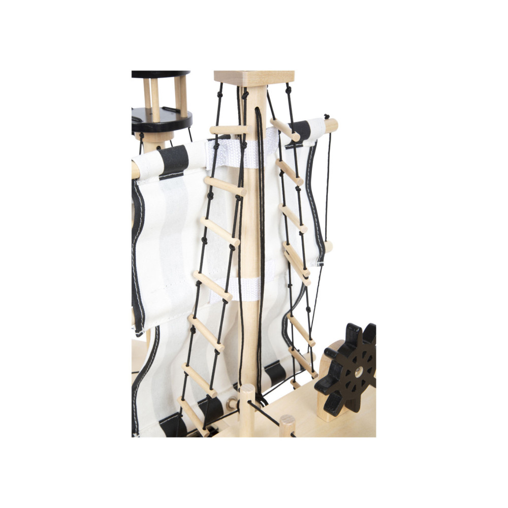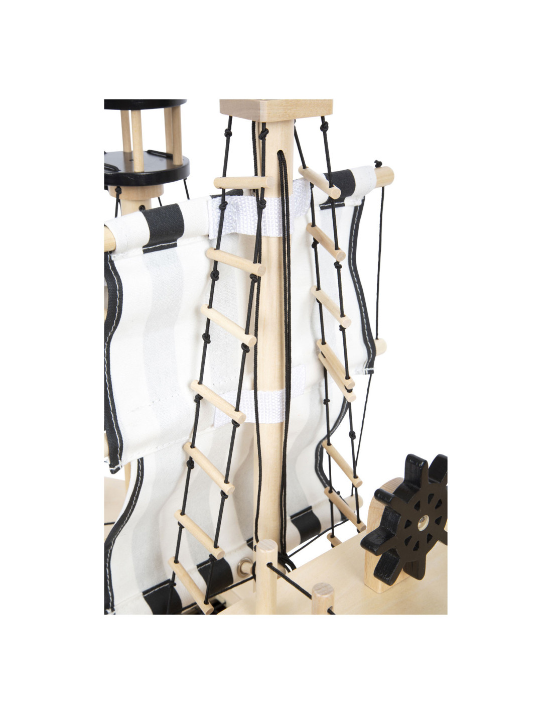 Ahoy piraten! Dit rijk gedetailleerde piratenschip van robuust hout laat wensen uitkomen met tal van authentieke details! Naast het ruime tweemasterschip bevat de uitgebreide speelset ook een rubberboot waarmee twee buigpoppen kunnen roeien, een haai, een papegaai, een schatkist, een kanon, twee tonnen, een plank en natuurlijk een coole piraat vlag. Alle zeilen kunnen met touwen worden gehesen en gehesen, net als op een echt schip. Het kanon dat zijn drie vilten kanonskogels door de lucht schiet, zorgt voor extra speelplezier!