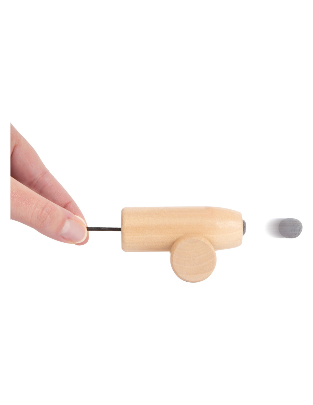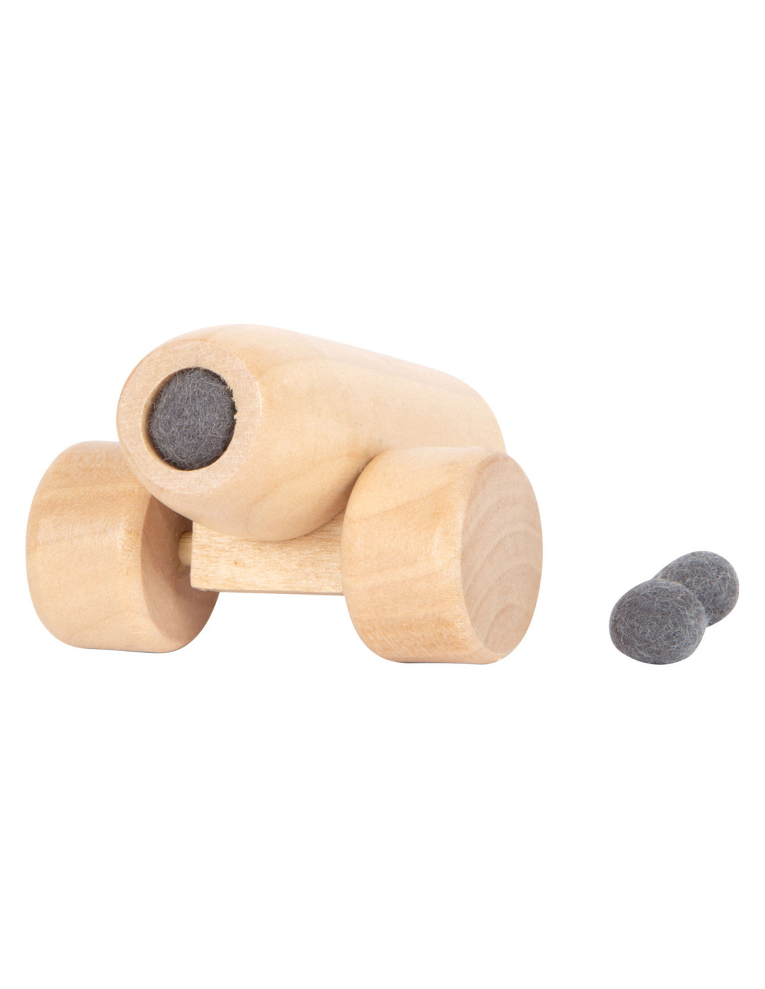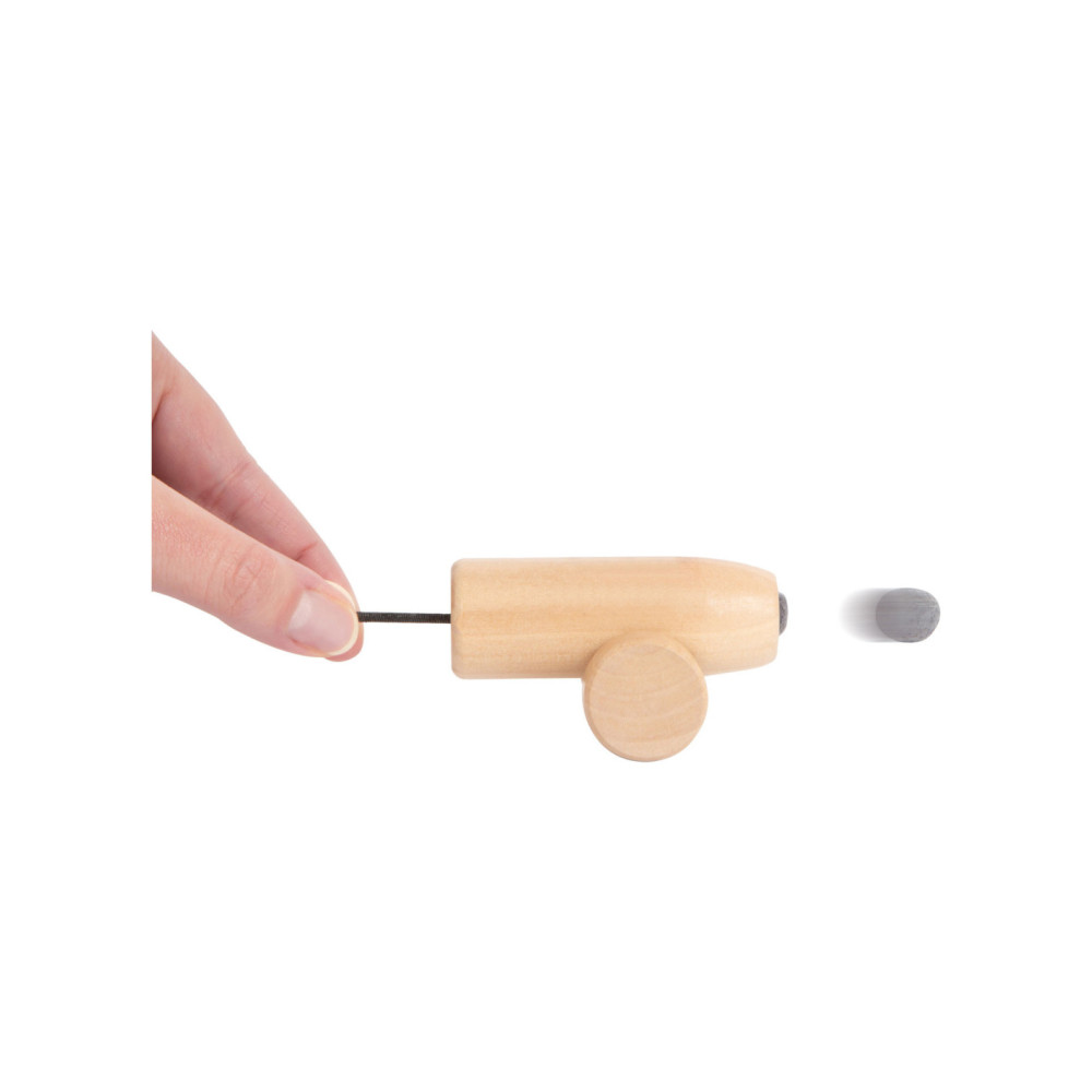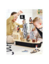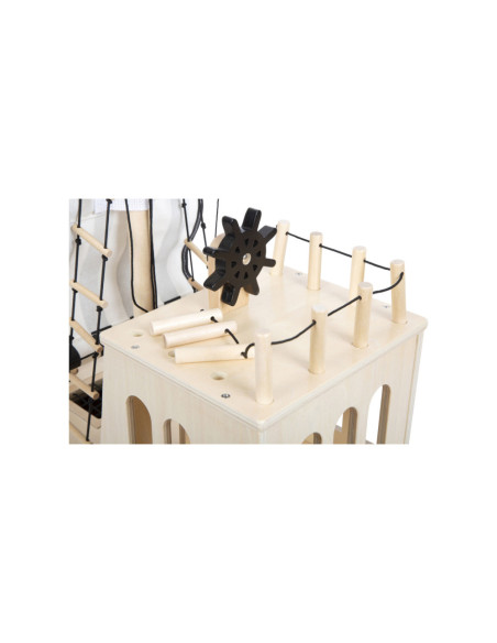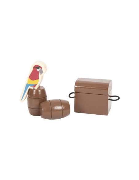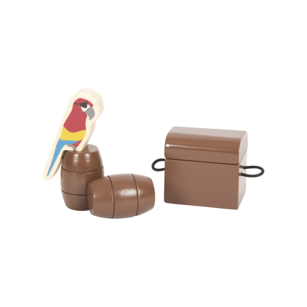 Ahoy piraten! Dit rijk gedetailleerde piratenschip van robuust hout laat wensen uitkomen met tal van authentieke details! Naast het ruime tweemasterschip bevat de uitgebreide speelset ook een rubberboot waarmee twee buigpoppen kunnen roeien, een haai, een papegaai, een schatkist, een kanon, twee tonnen, een plank en natuurlijk een coole piraat vlag. Alle zeilen kunnen met touwen worden gehesen en gehesen, net als op een echt schip. Het kanon dat zijn drie vilten kanonskogels door de lucht schiet, zorgt voor extra speelplezier!