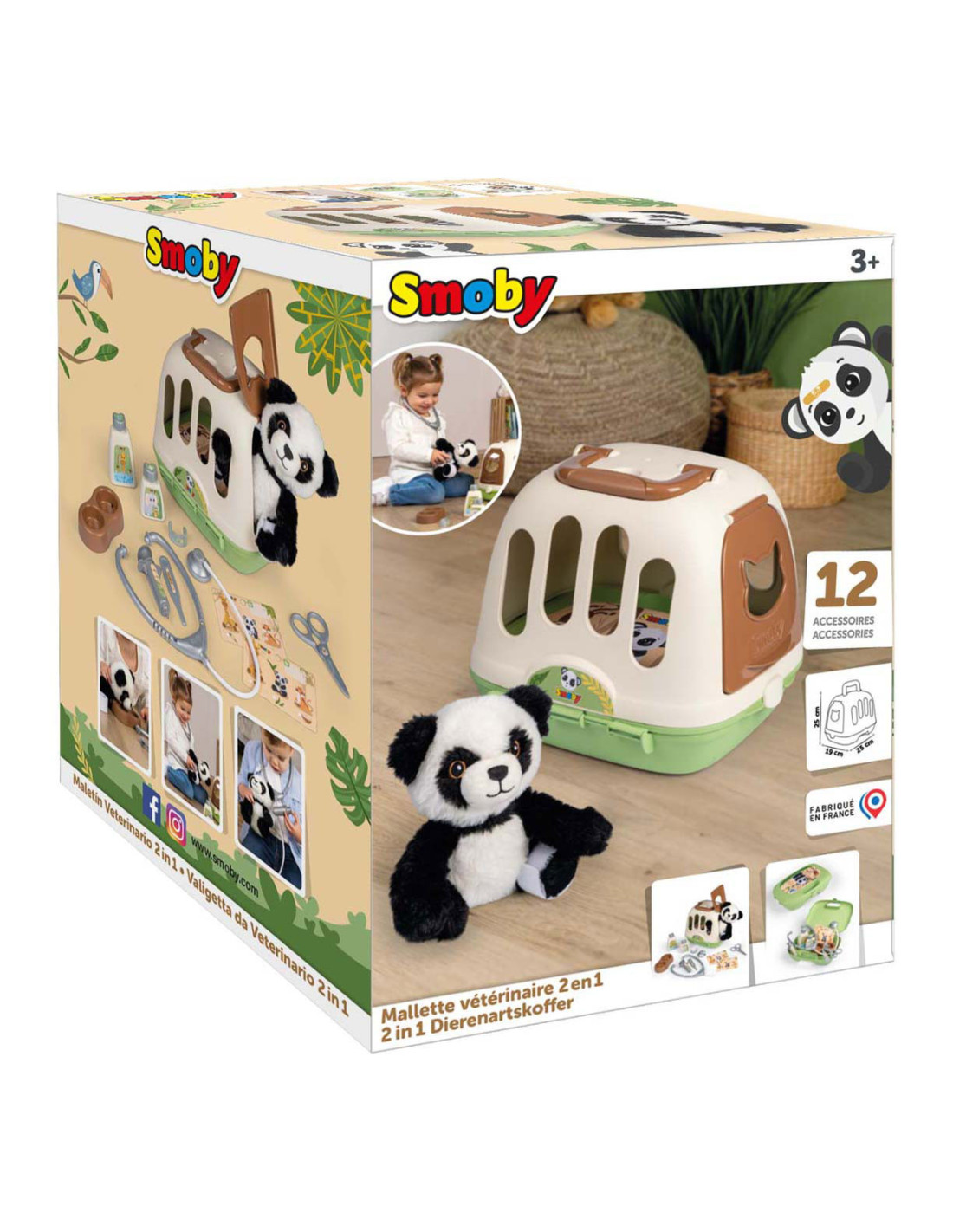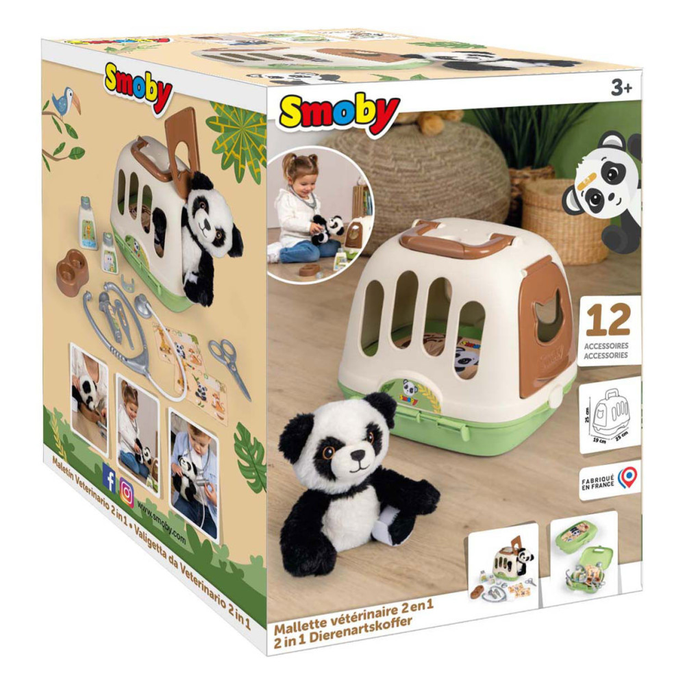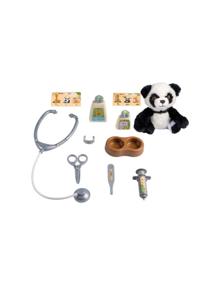 2-in-1 dierenartskoffer inclusief 12 accessoires, zoals een panda, voerbakje, stethoscoop, spuit, thermometer, schaar, twee flesjes en een voetring. Geschikt voor kinderen vanaf 3 jaar.