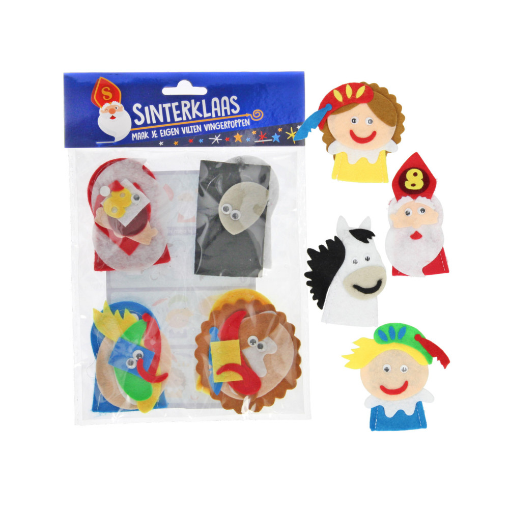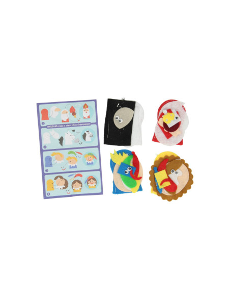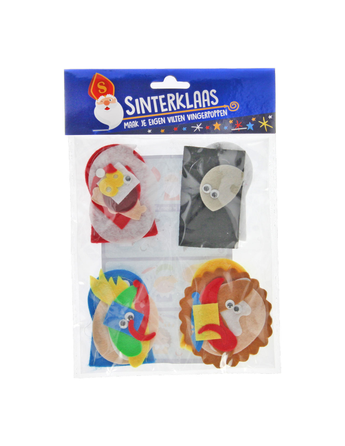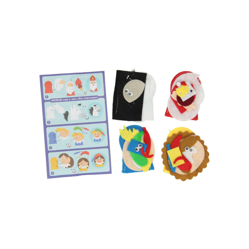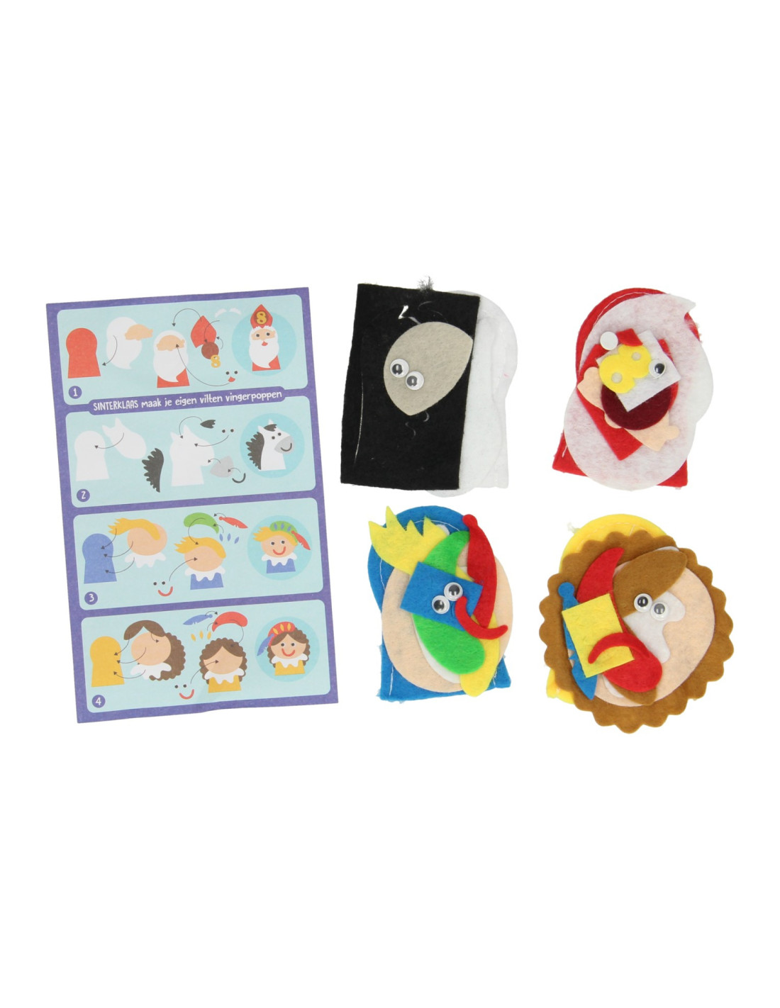 Knutselsetje voor het maken van vilten vingerpopjes in sinterklaasfiguren. Aan de hand van de instructies maak je twee pietjes, Sinterklaas en zijn paard Ozosnel. Plak de verschillende stukken vast met lijm (niet inbegrepen). Gemaakt van vilt. Niet geschikt voor kinderen onder de 3 jaar oud.