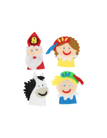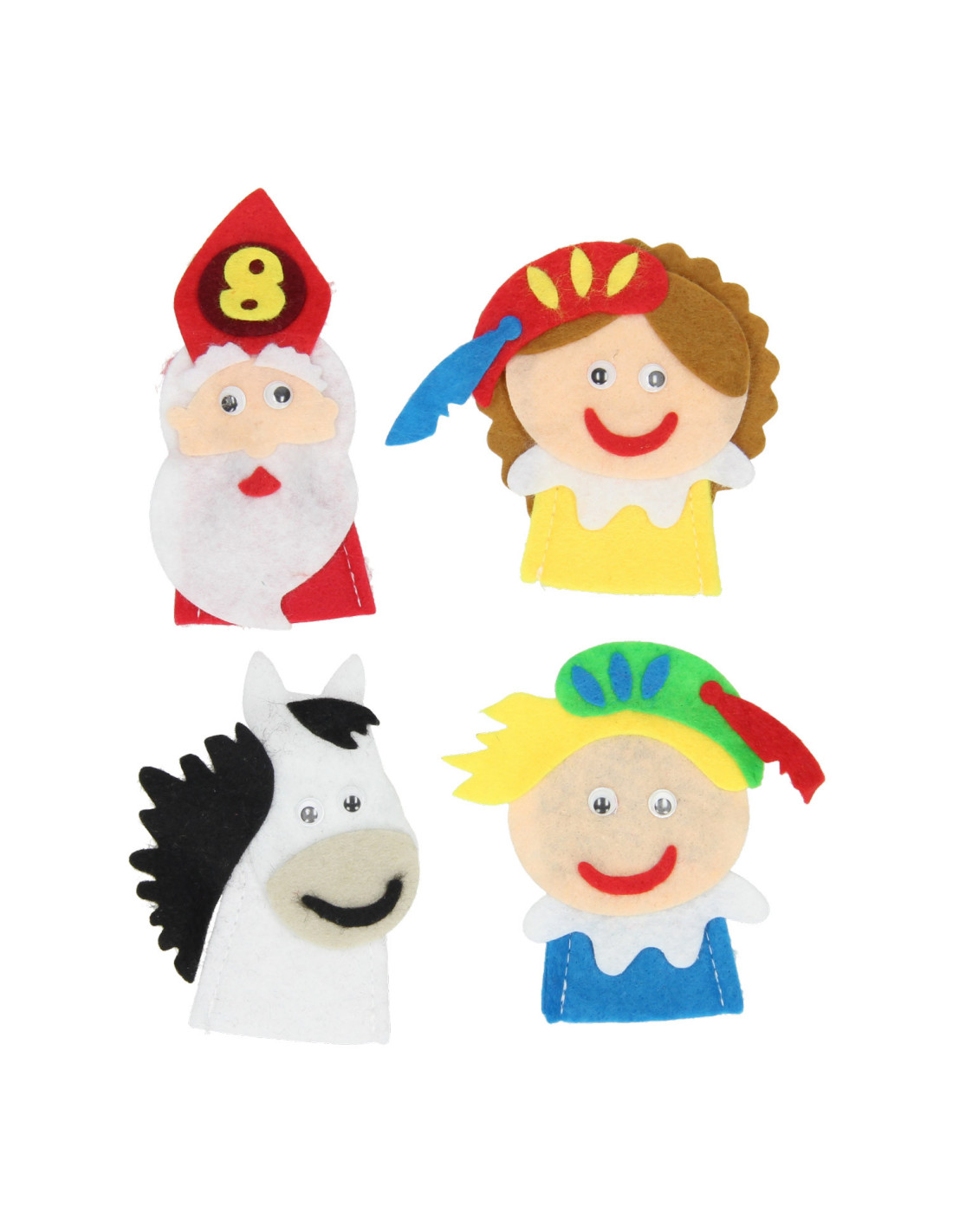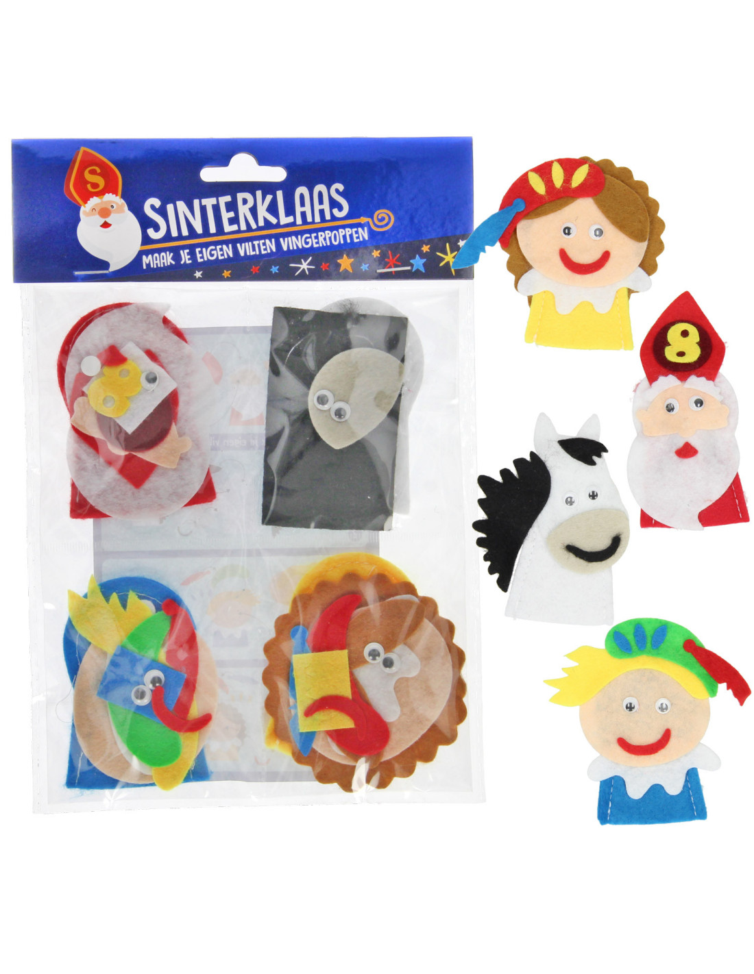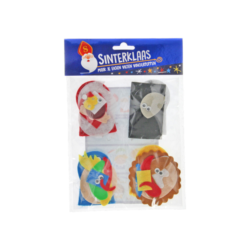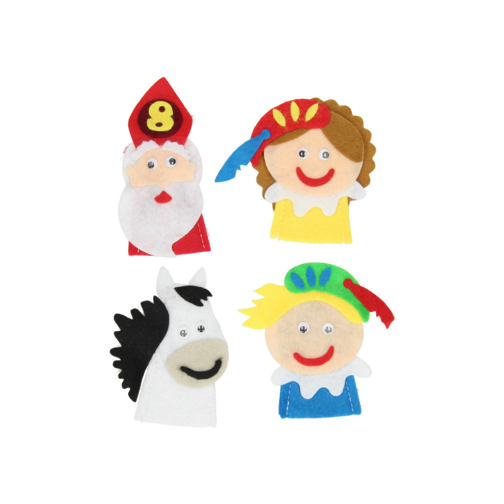 Knutselsetje voor het maken van vilten vingerpopjes in sinterklaasfiguren. Aan de hand van de instructies maak je twee pietjes, Sinterklaas en zijn paard Ozosnel. Plak de verschillende stukken vast met lijm (niet inbegrepen). Gemaakt van vilt. Niet geschikt voor kinderen onder de 3 jaar oud.