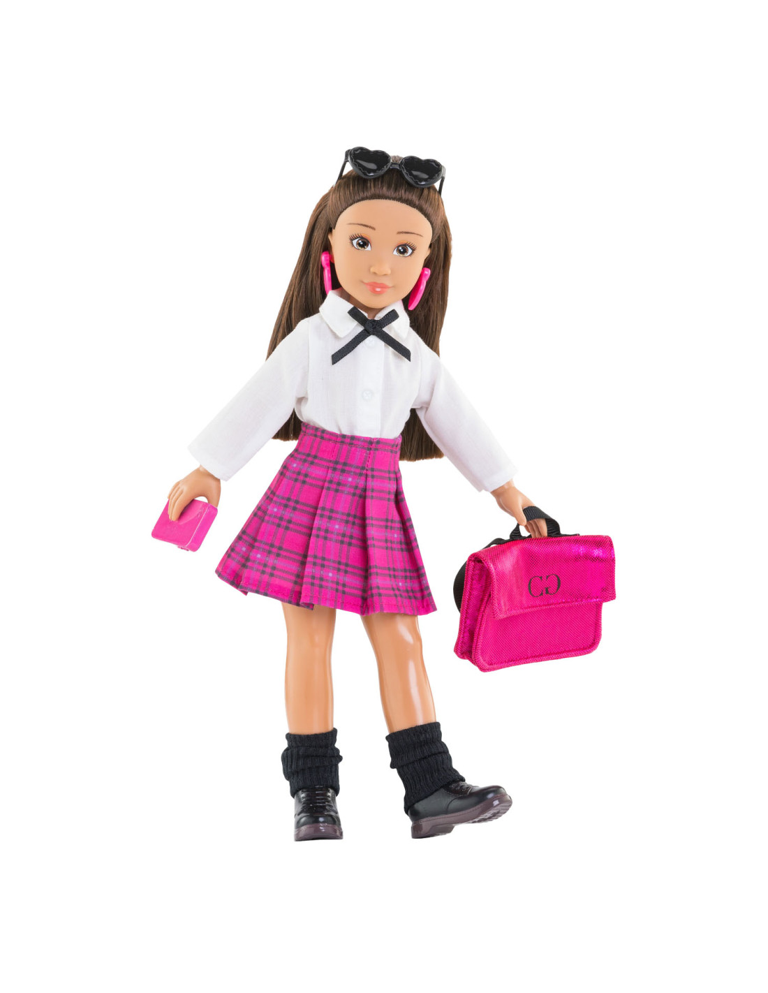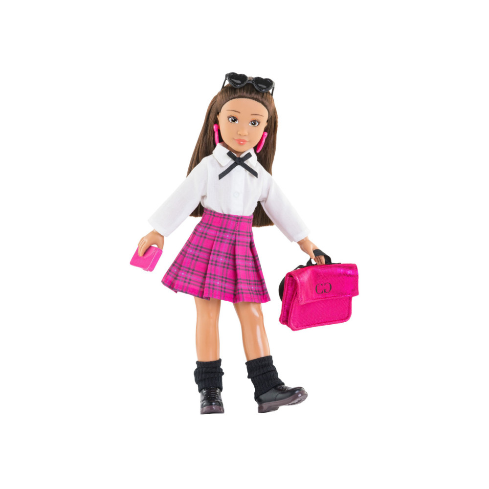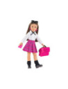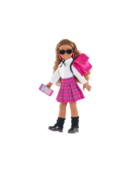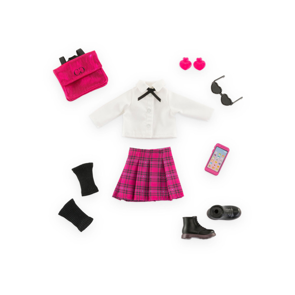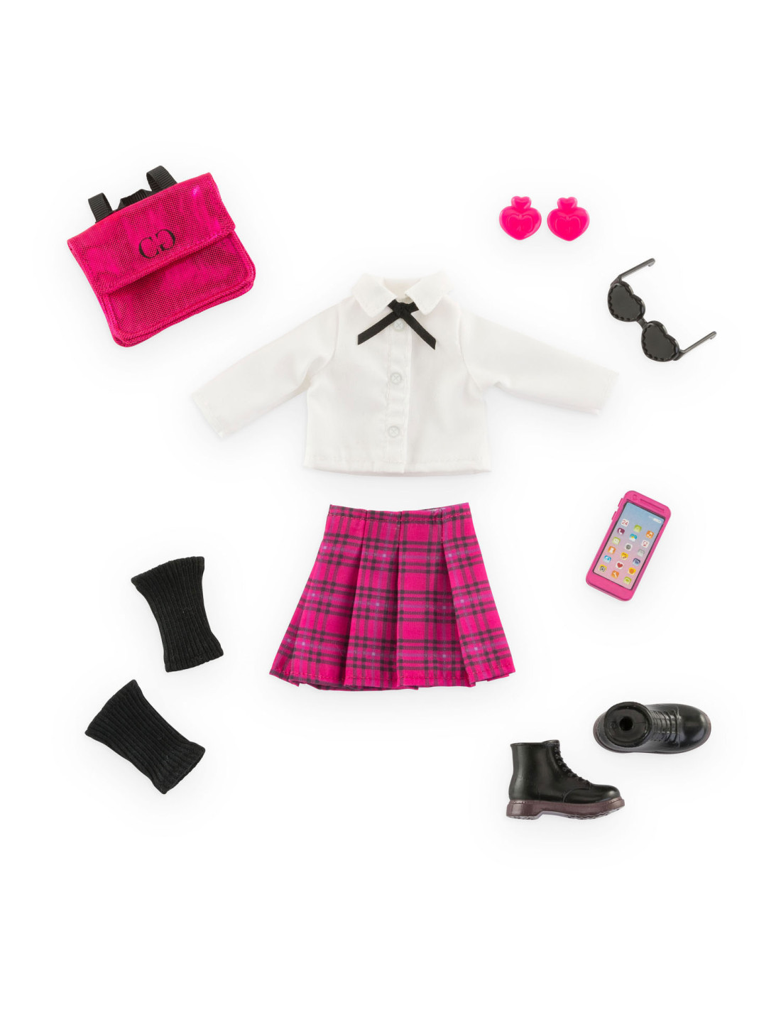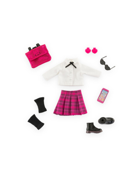 De English College Dressing Room is een complete outfit voor Corolle Girls-modepoppen, bestaande uit 8 ultra-trendy accessoires om eruit te zien als een Engelse student: 1 roze geruite rok, 1 wit overhemd met lange mouwen en een zwarte strik, 1 paar oorbellen oorbellen, 1 zwarte hartvormige zonnebril, 1 roze mobiele telefoon, 1 roze schooltas, 1 paar zwarte beenkappen en 1 paar afneembare zwarte enkellaarzen.