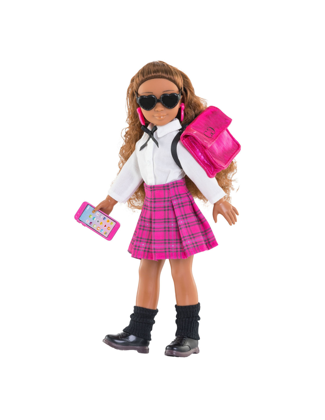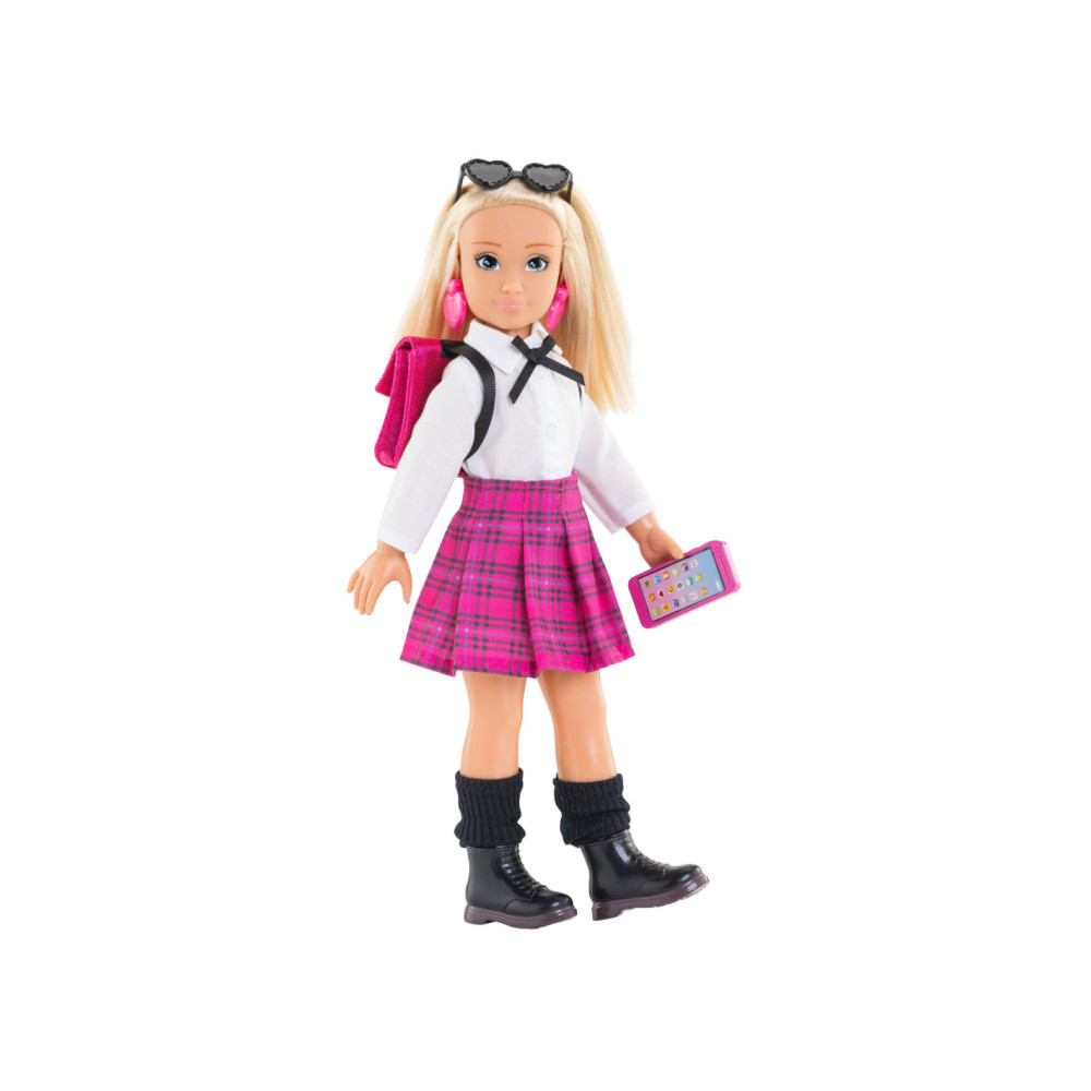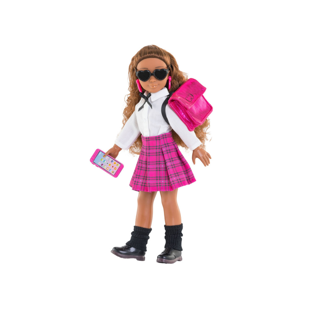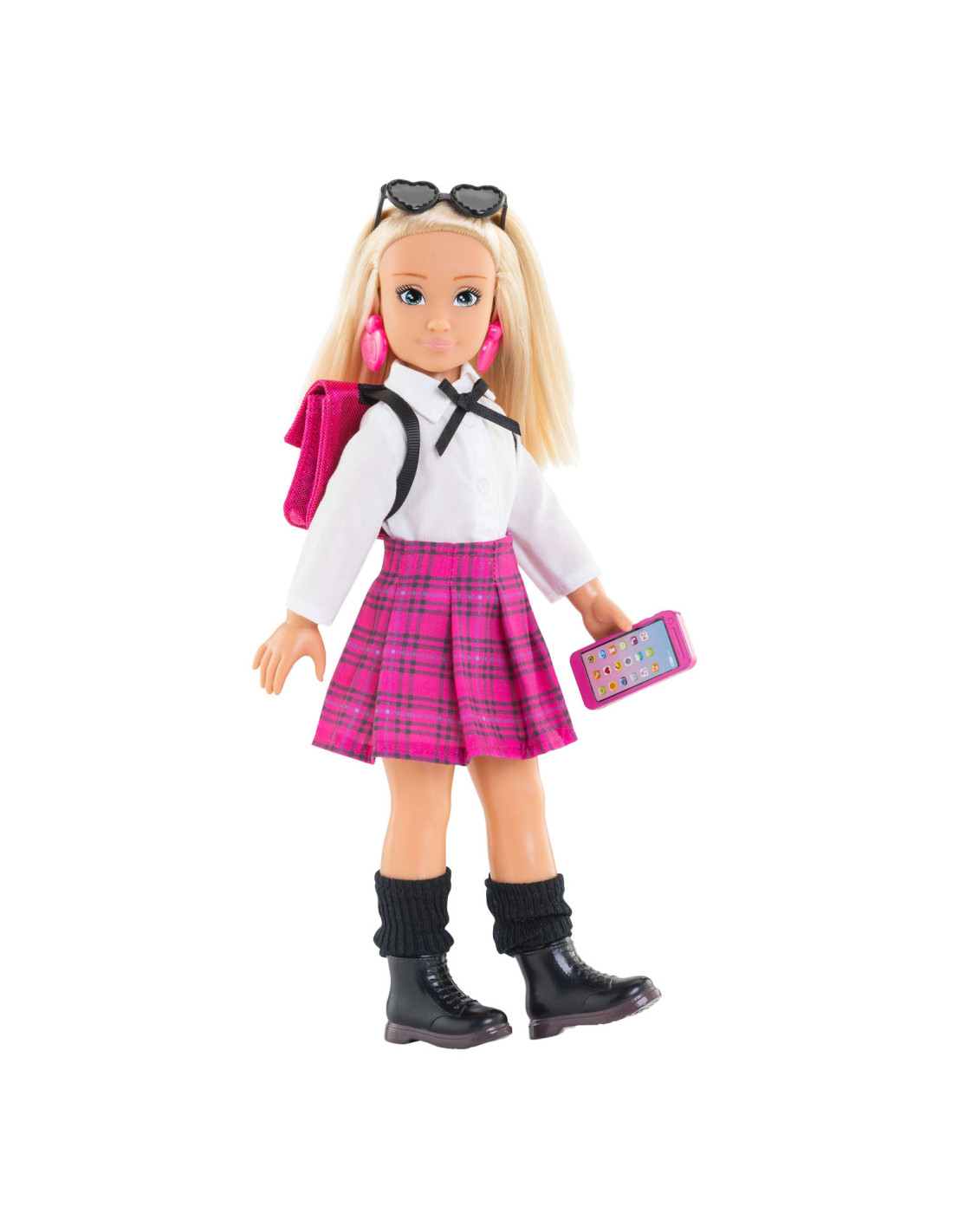 De English College Dressing Room is een complete outfit voor Corolle Girls-modepoppen, bestaande uit 8 ultra-trendy accessoires om eruit te zien als een Engelse student: 1 roze geruite rok, 1 wit overhemd met lange mouwen en een zwarte strik, 1 paar oorbellen oorbellen, 1 zwarte hartvormige zonnebril, 1 roze mobiele telefoon, 1 roze schooltas, 1 paar zwarte beenkappen en 1 paar afneembare zwarte enkellaarzen.
