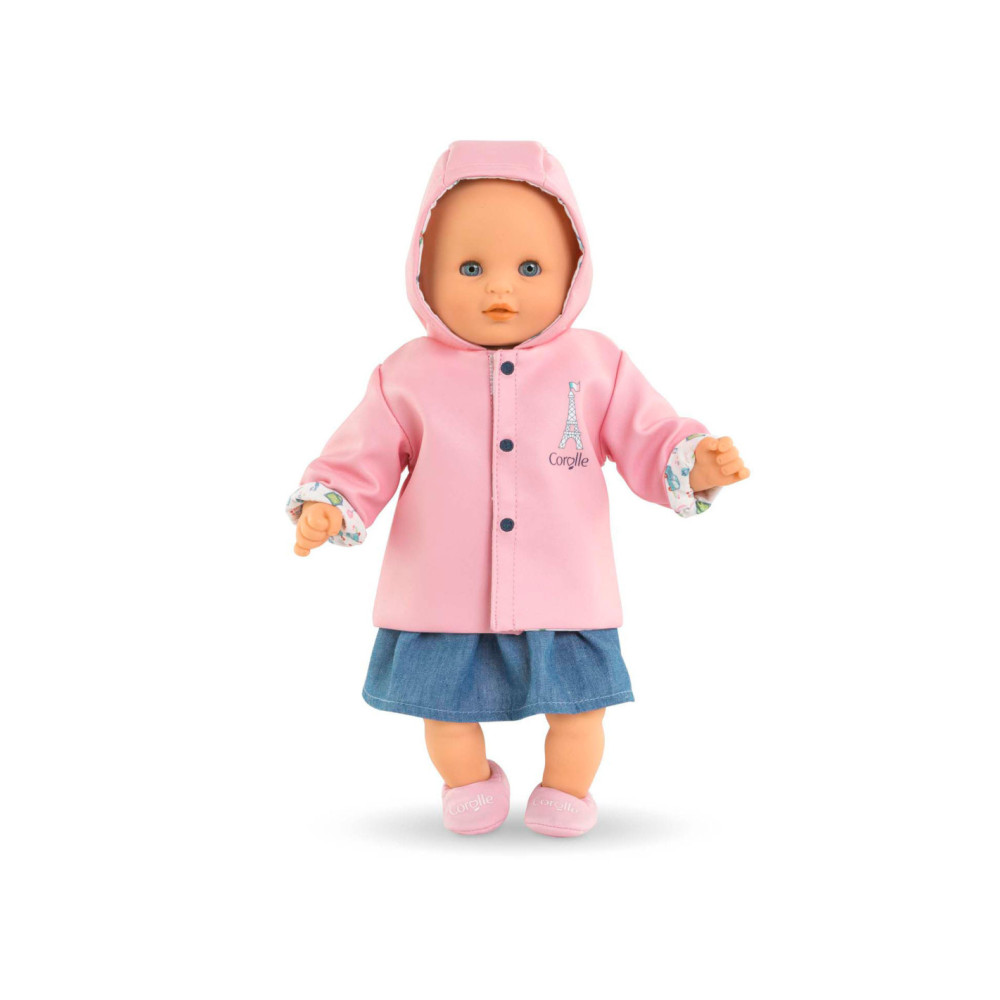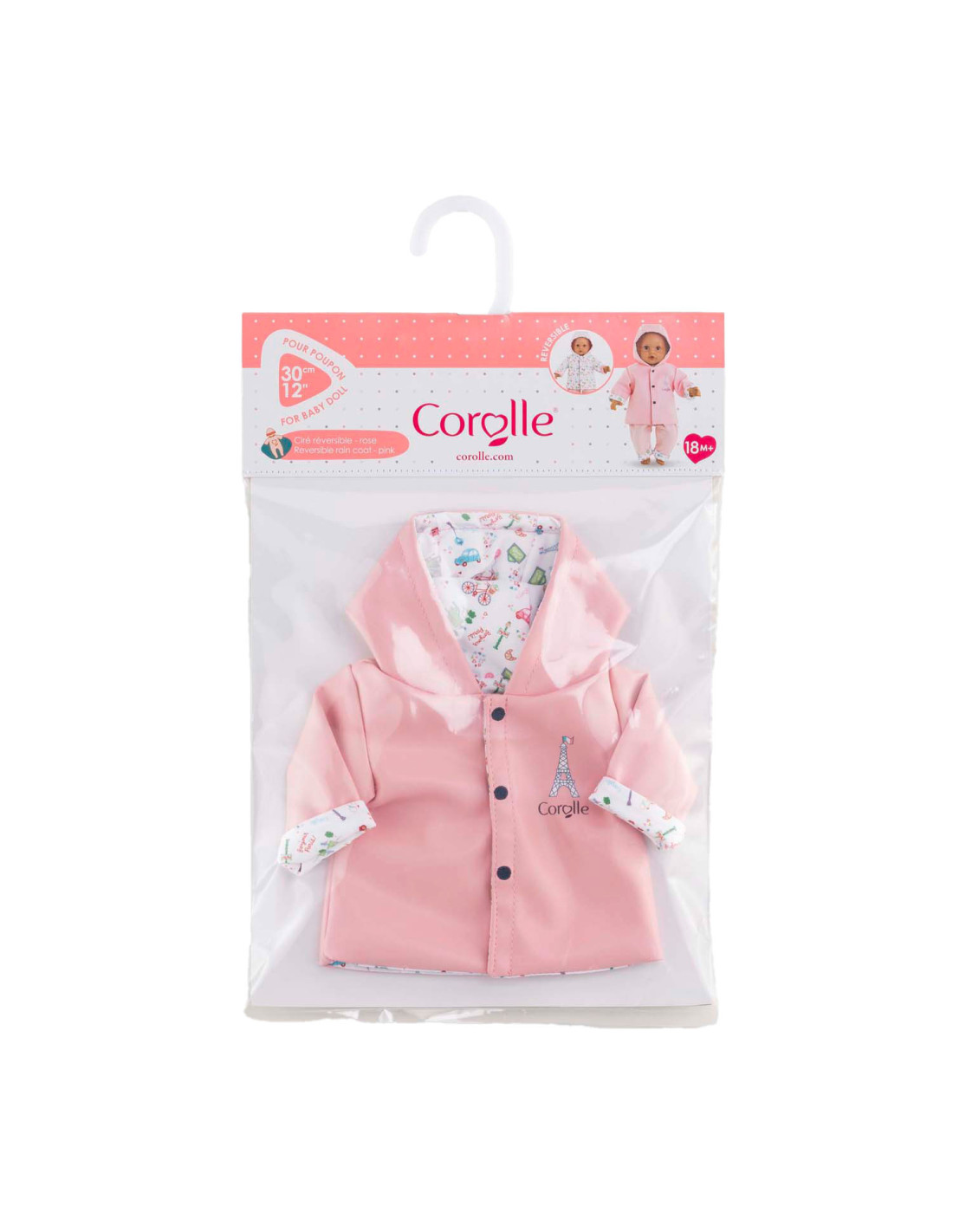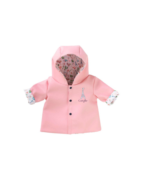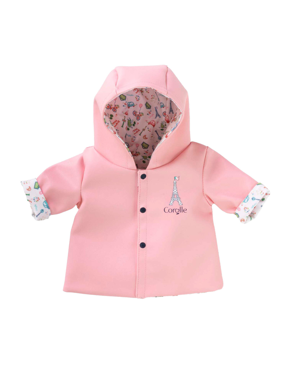 De regenjas is volledig omkeerbaar: jouw pop kan kiezen tussen een roze kant met Eiffeltorenprint of een kant met de exclusieve stof uit de Week-end à Paris-collectie.