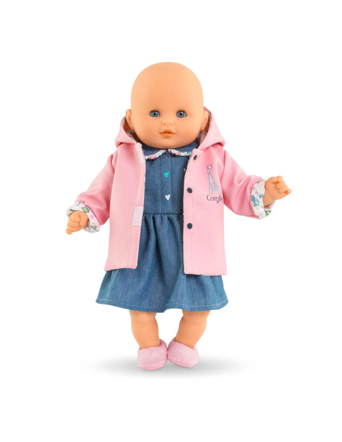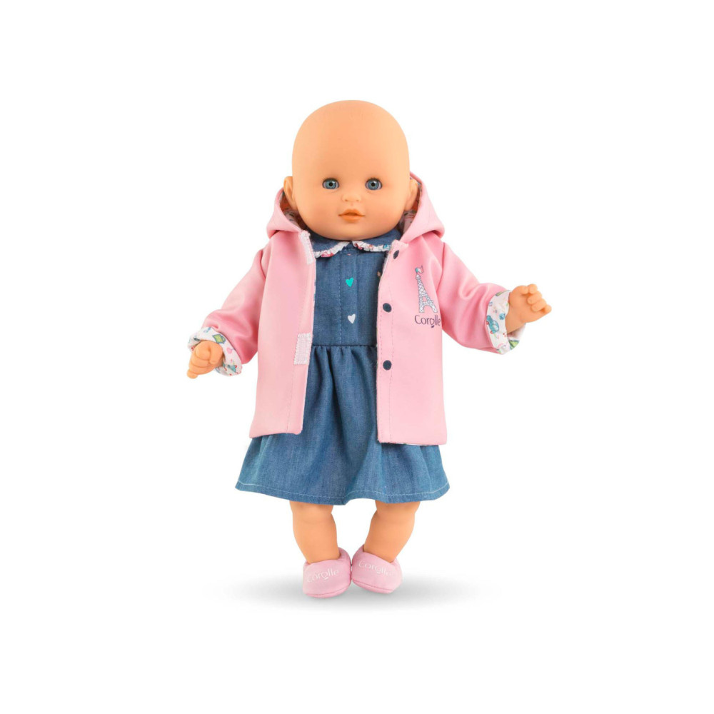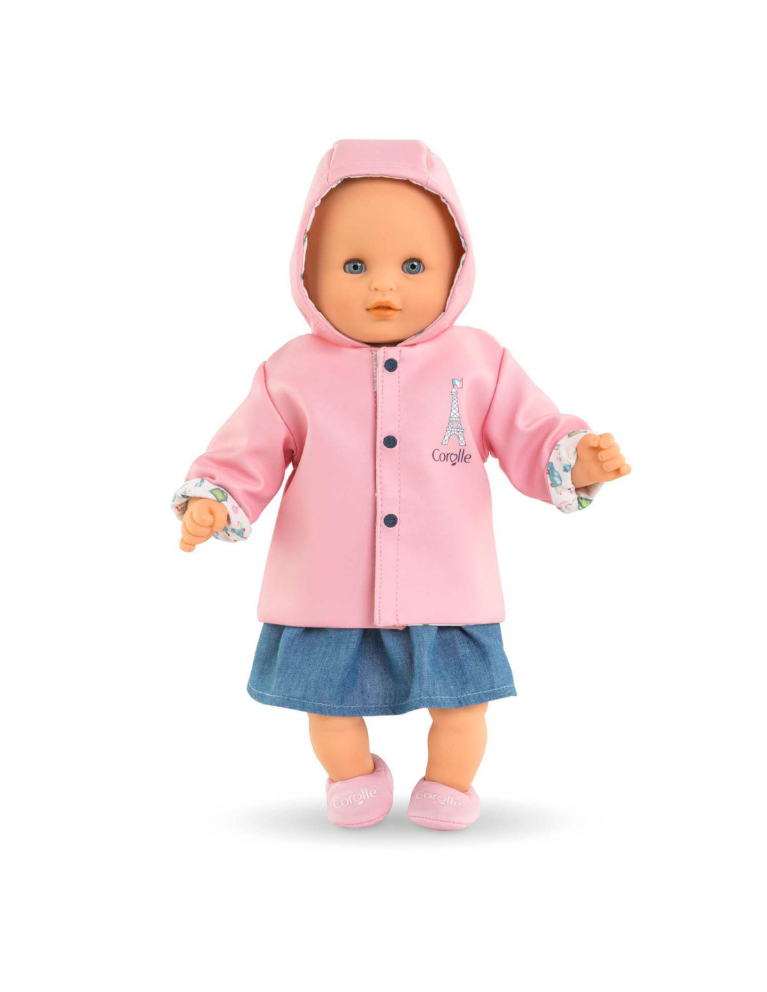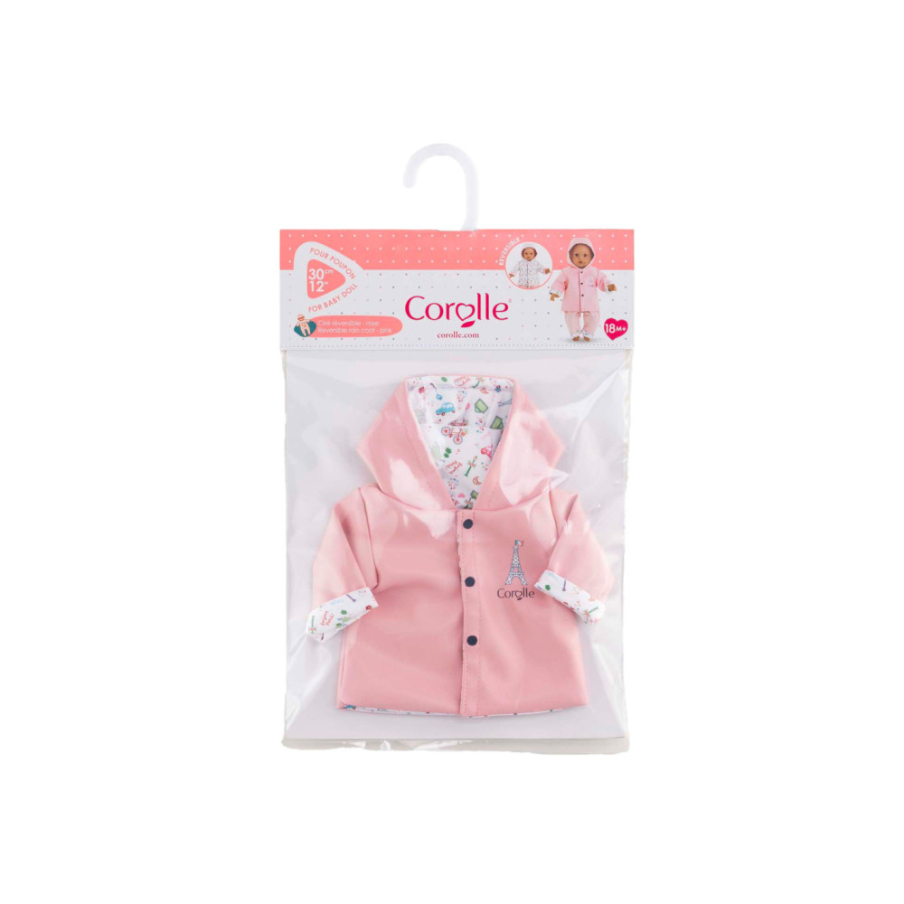 De regenjas is volledig omkeerbaar: jouw pop kan kiezen tussen een roze kant met Eiffeltorenprint of een kant met de exclusieve stof uit de Week-end à Paris-collectie.