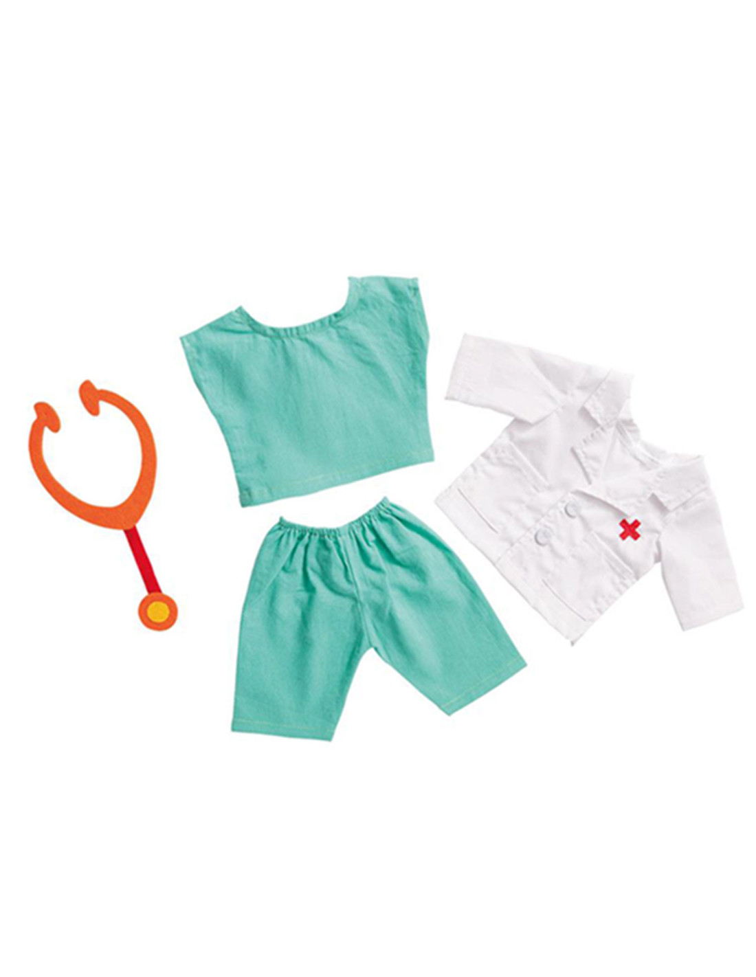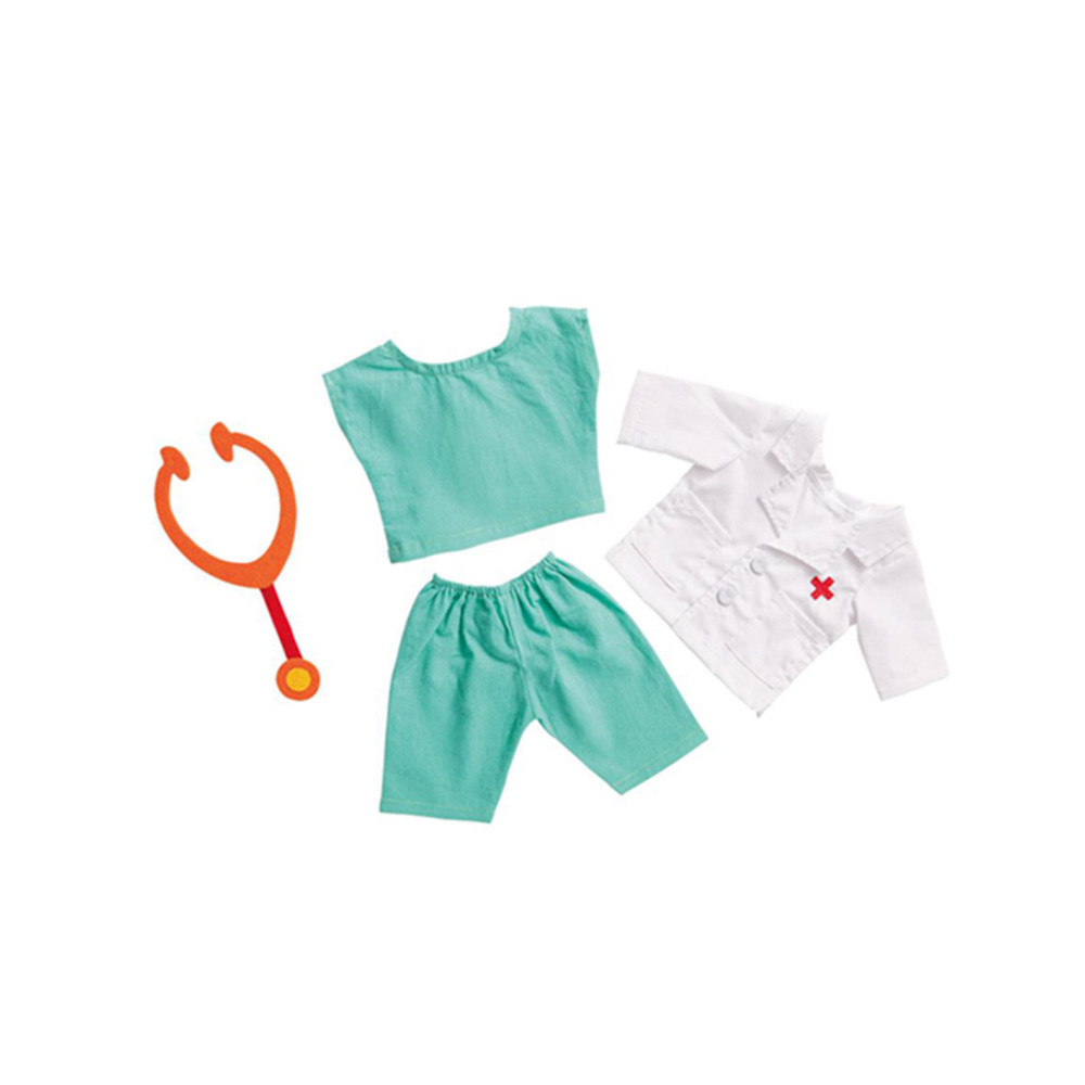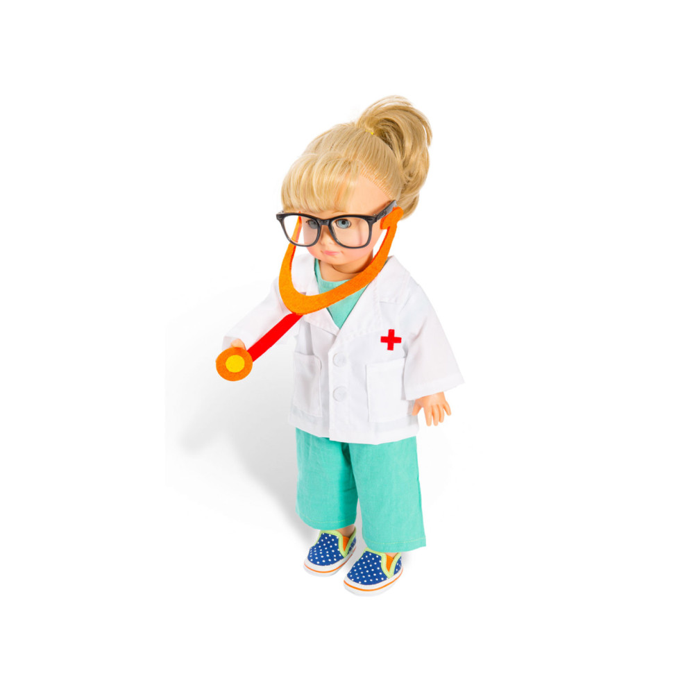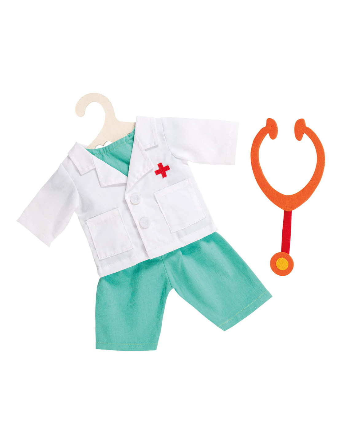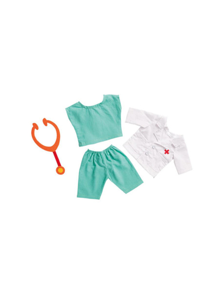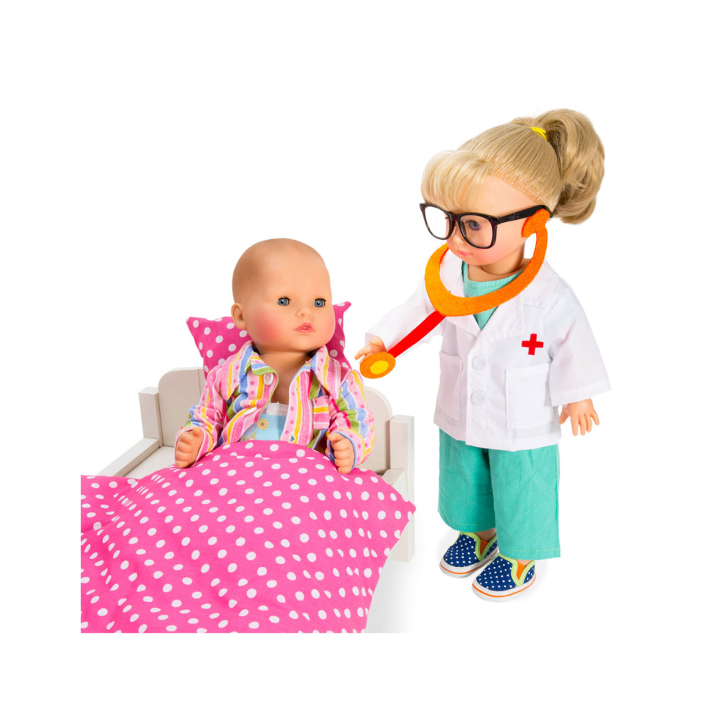 Complete dokters verkleedset voor poppen. De set bestaat uit een broek met shirt, witte doktersjas en stethoscoop. Geschikt voor poppen van 28 tot 35 cm.