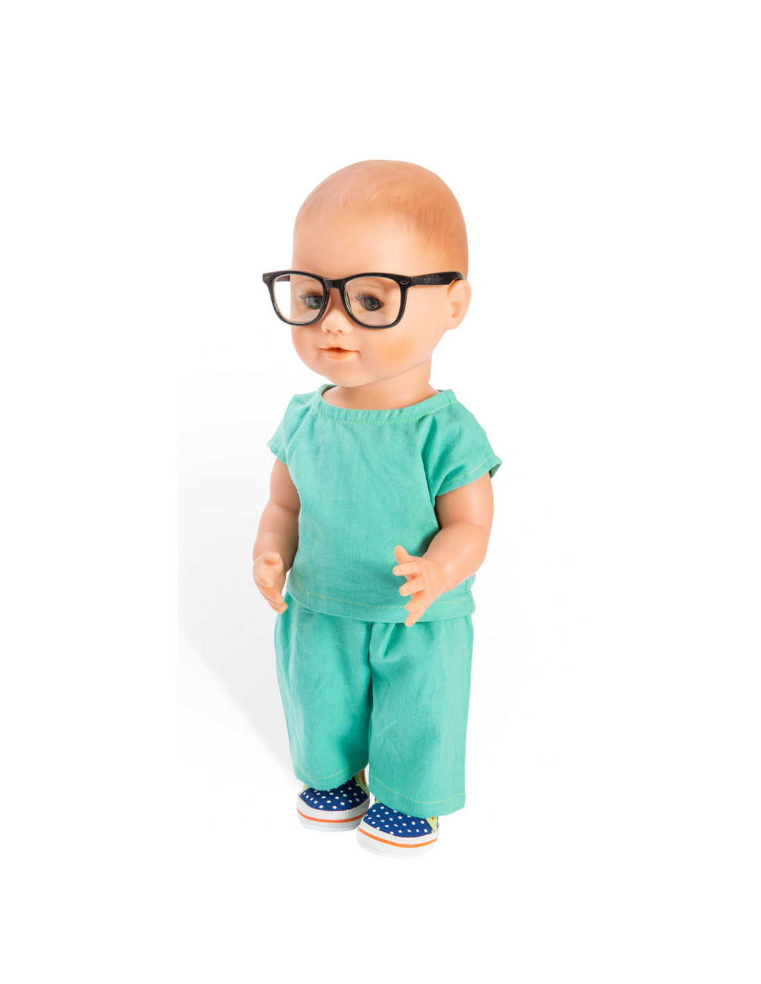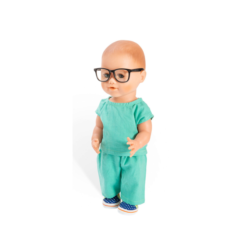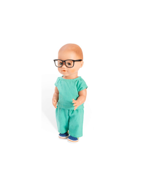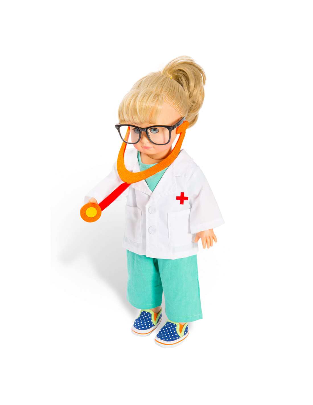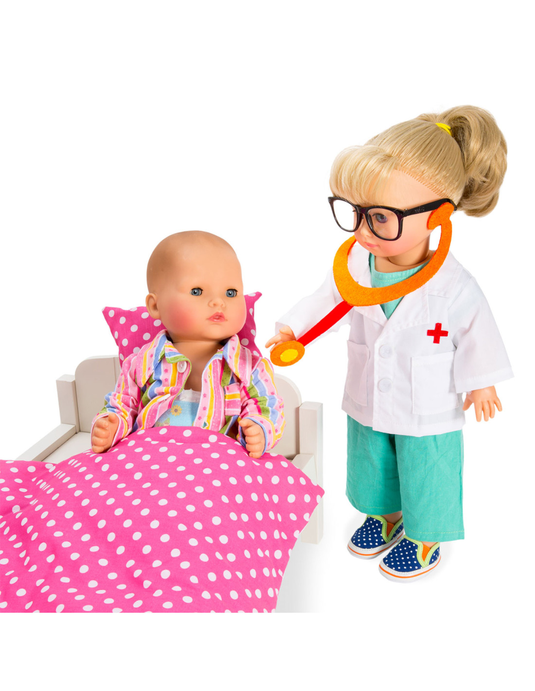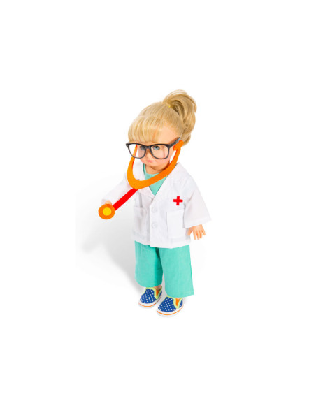 Complete dokters verkleedset voor poppen. De set bestaat uit een broek met shirt, witte doktersjas en stethoscoop. Geschikt voor poppen van 28 tot 35 cm.