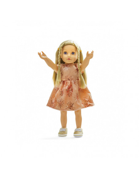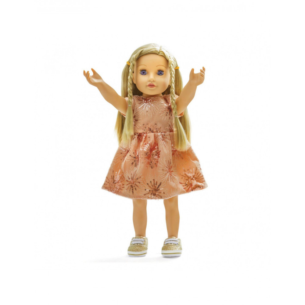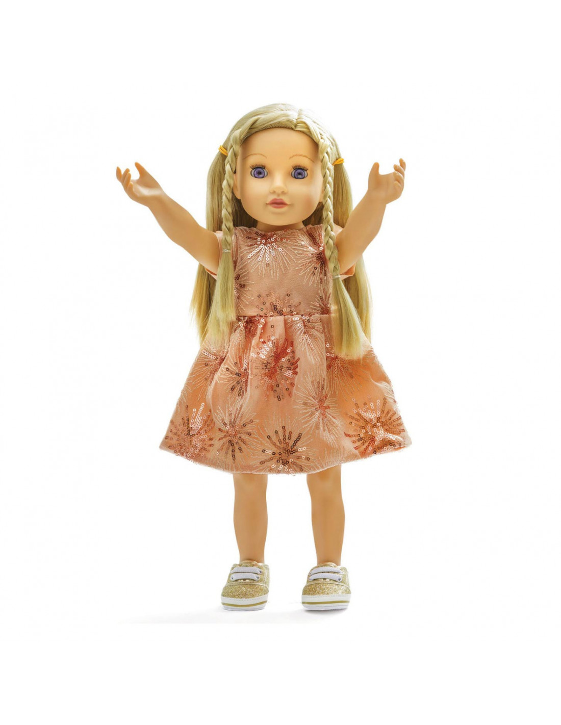 Schitterende rosegouden poppenjurk met pailletten. Met klittenbandsluiting. Geschikt voor poppen in maat 28-35 cm en kinderen vanaf 3 jaar.