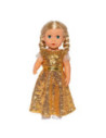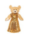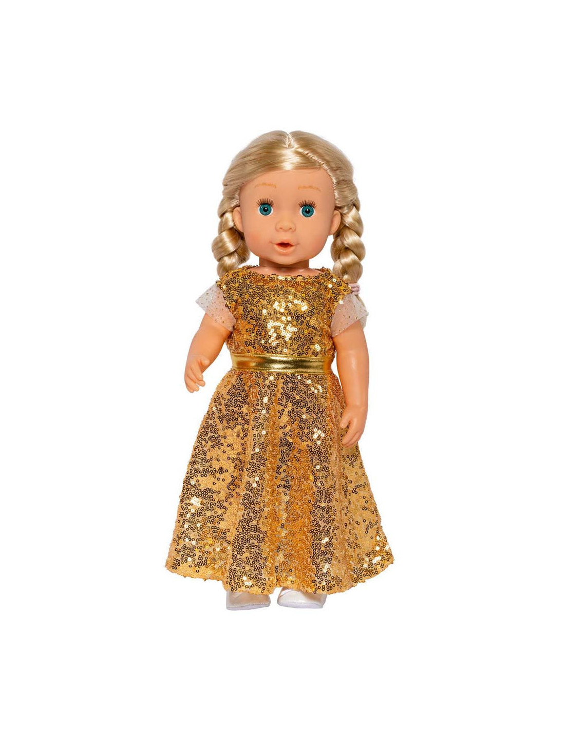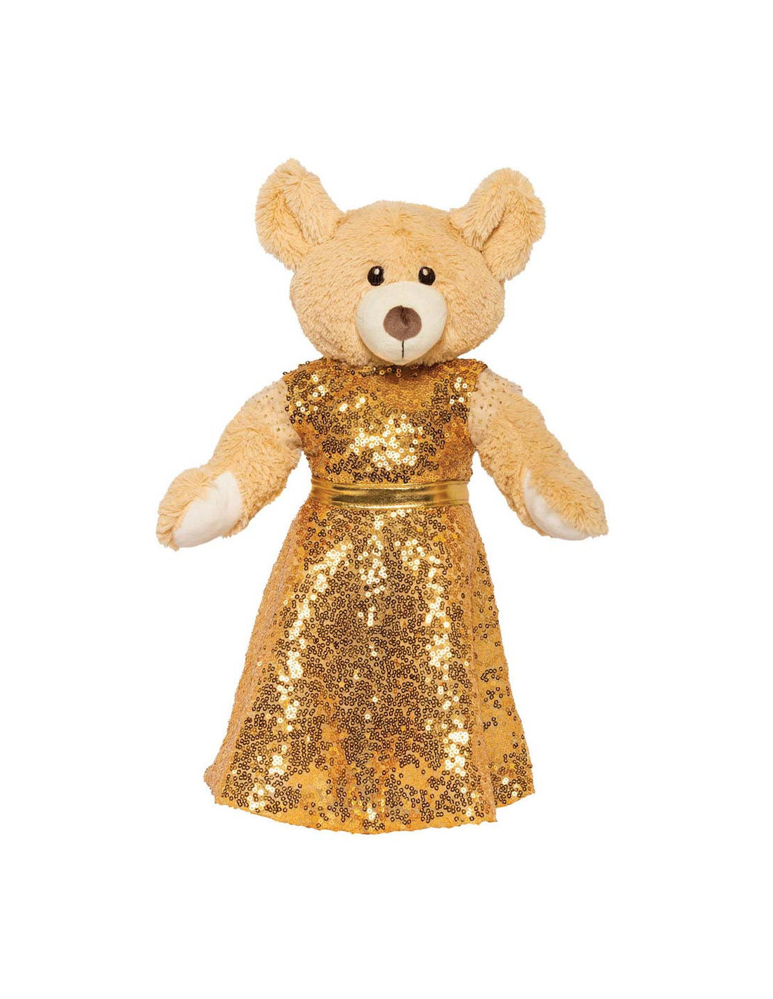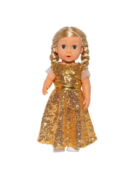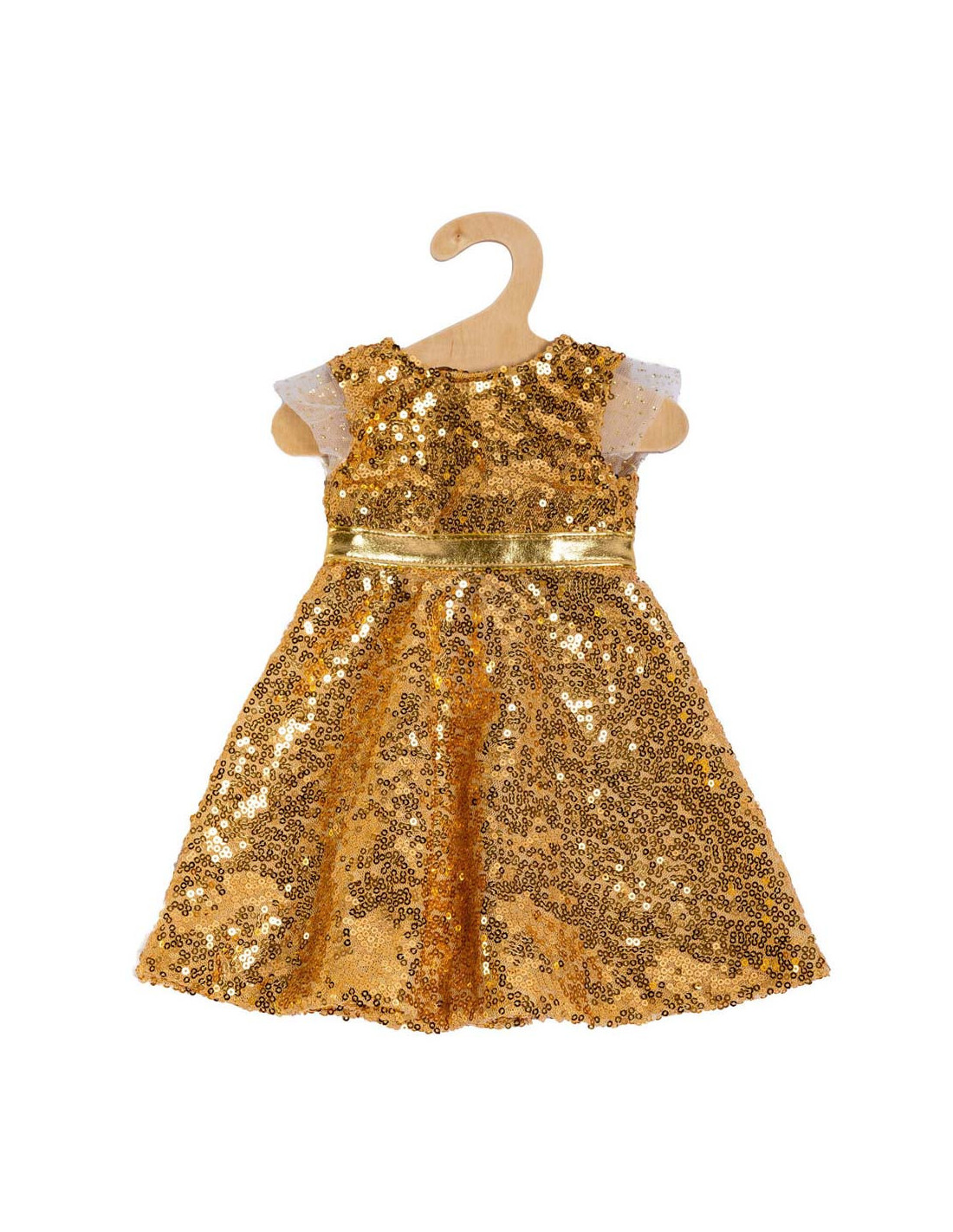 Laat een beetje sprankeling achter, waar je ook gaat! De poppenjurk "Golden Star" van Heless voegt een extra dosis glitter en glamour toe. De elegante jurk met lange rok is bedekt met prachtige glinsterende gouden pailletten. Een glitterriem en ruches van tule op de schouders met fonkelende stippen maken de droom in goud gewoon perfect. De klittenbandsluiting aan de achterkant zorgt ervoor dat de poppenjurk heel makkelijk aan en uit te trekken is. Een bijzonder sierlijke poppenjurk voor grandioze poppenvoorstellingen. Deze jurk is geschikt voor de meeste verkoopbare poppen van maat 28-35 cm. Het is ook verkrijgbaar in een andere versie voor poppenmaat 35-45 cm (artikel 1520394). Het artikel wordt geleverd op een houten hanger.