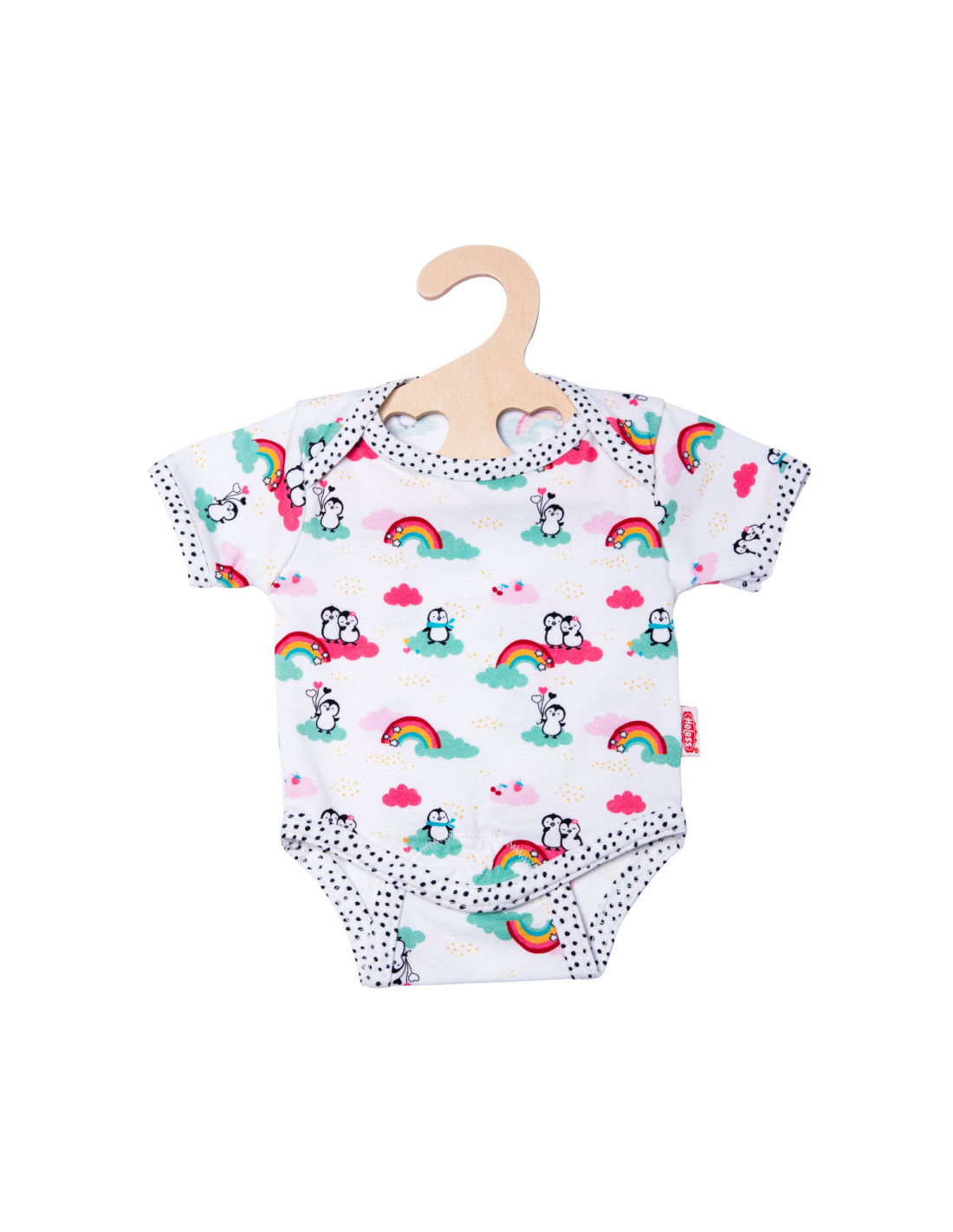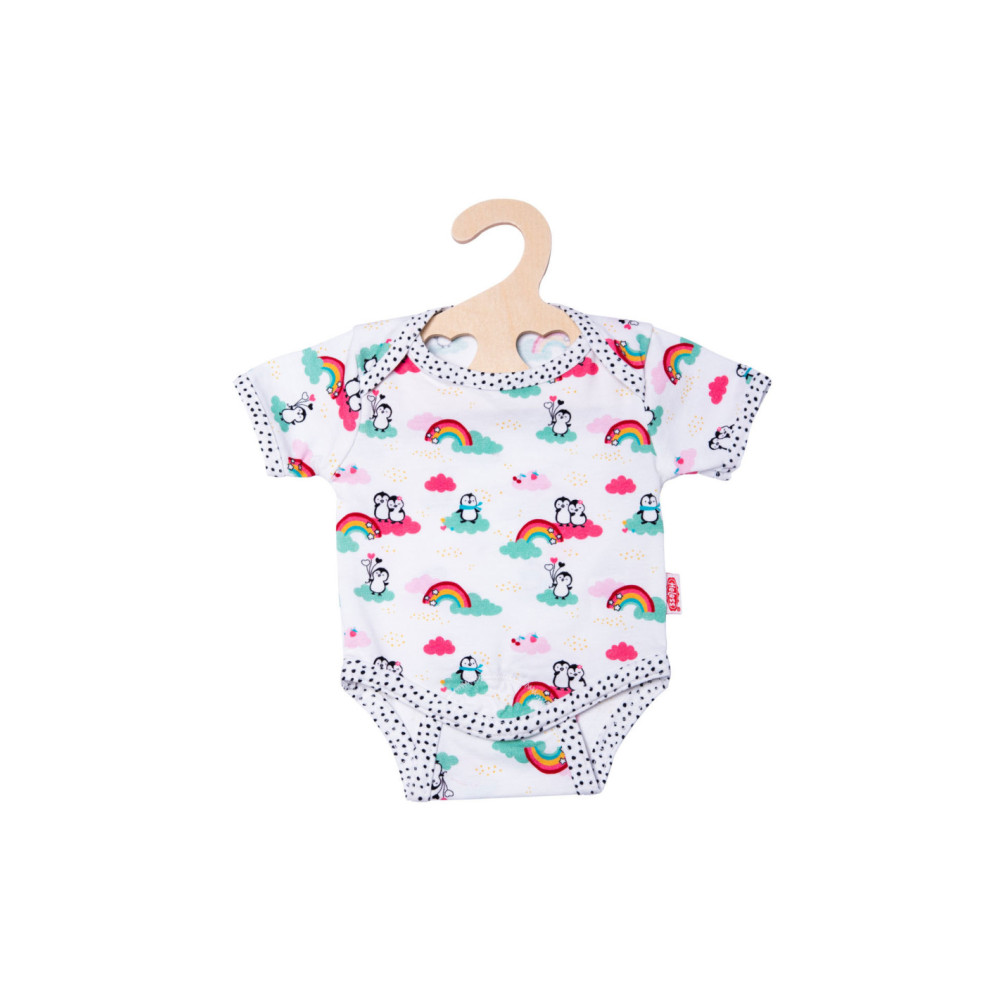 Vrolijke romper met afbeeldingen van regenbogen en pinguïns. Geschikt voor poppen van 35 tot 45 cm.