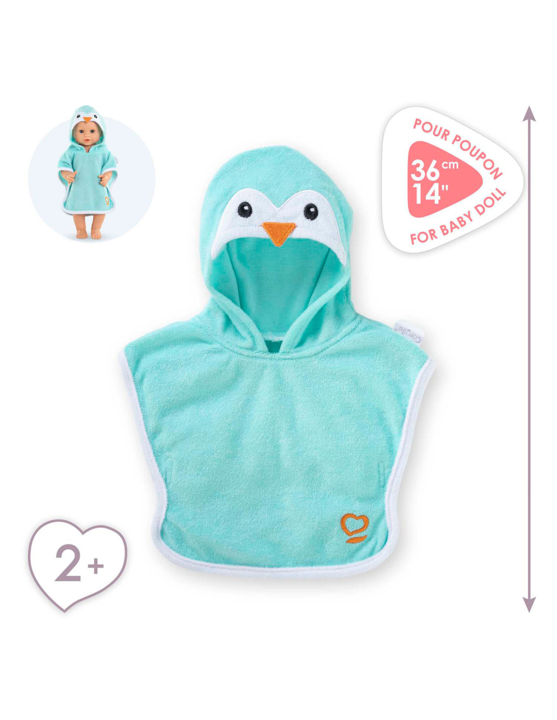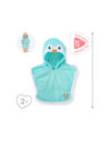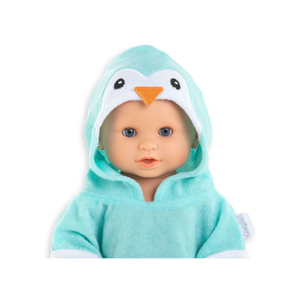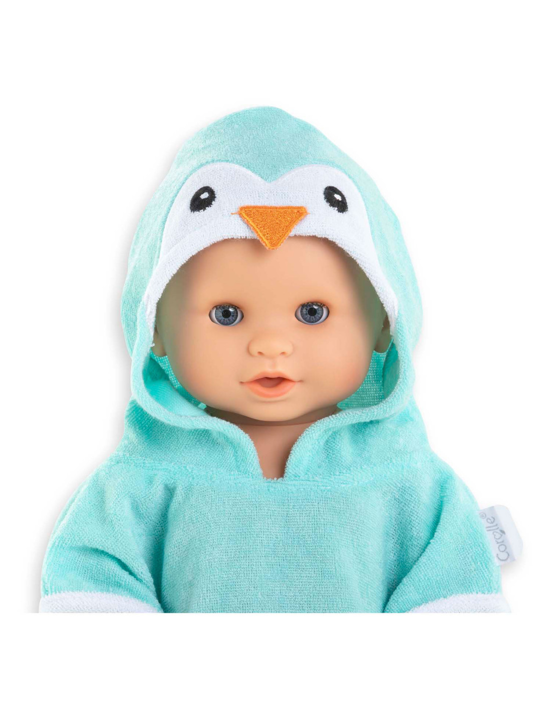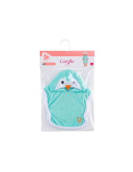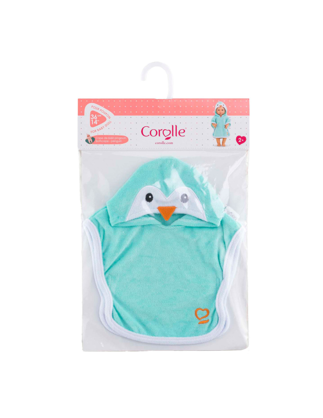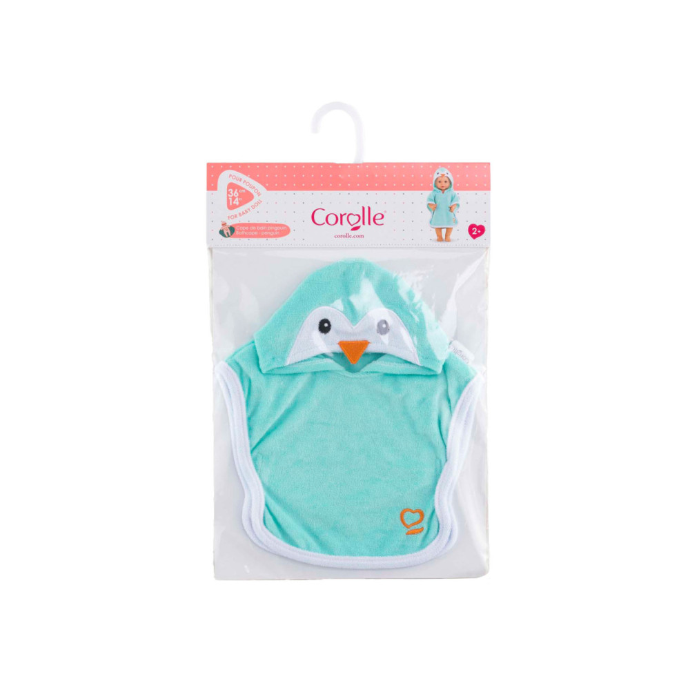 Deze leuke badcape met capuchon in de vorm van een pinguïnkop droogt en verwarmt de kleine 36 cm grote Corolle Badpoppen en Corolle Bébé Calin poppen na het badderen.