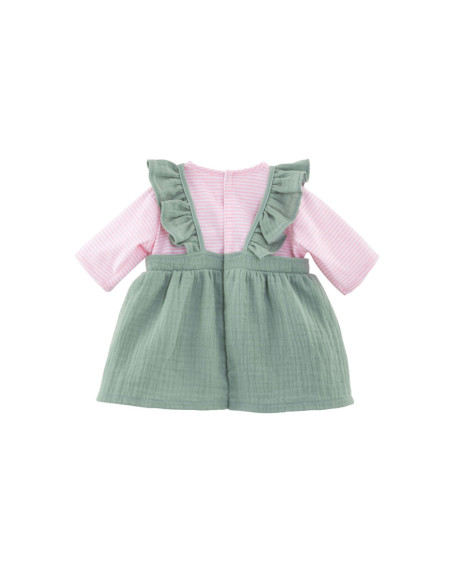 Deze 2-in-1-outfit bestaat uit een saliegroene jurk van katoen en een roze gestreept T-shirt met lange mouwen, aan de jurk genaaid.
