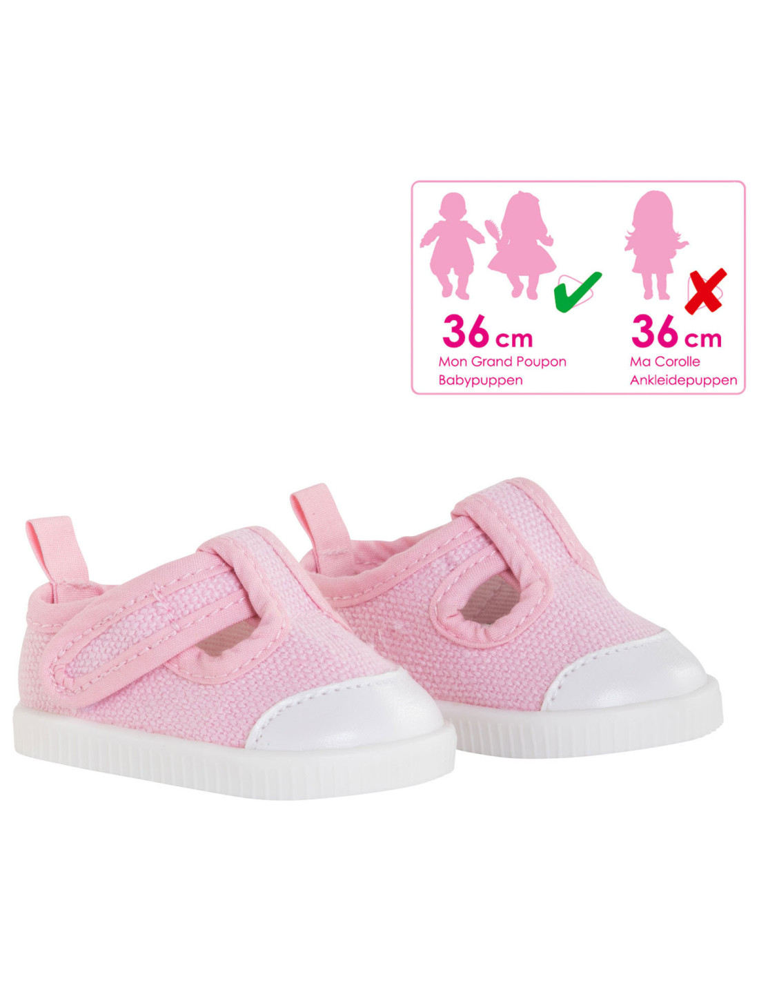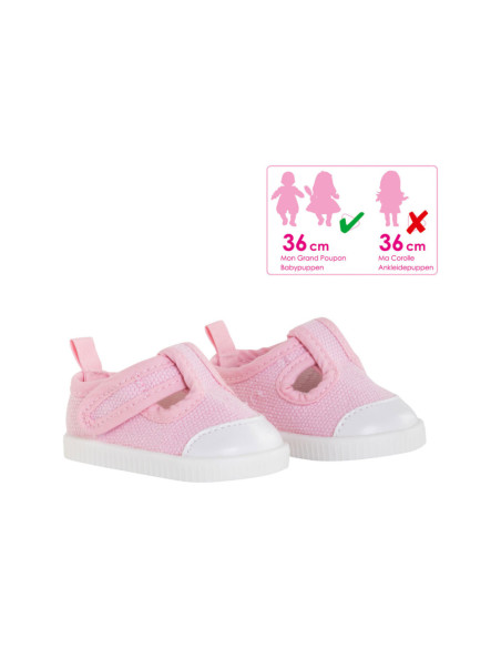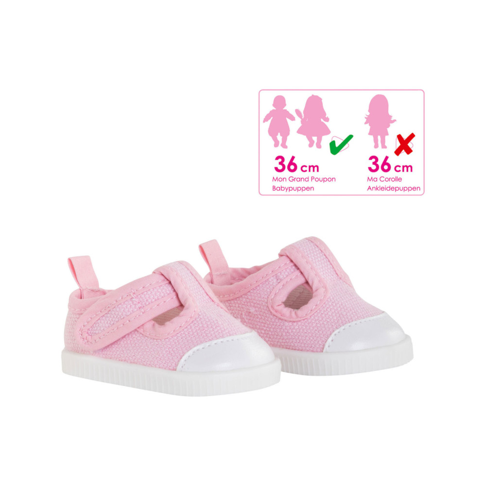 Grote babypoppen van 36 cm hebben hun schoenen gevonden met dit paar roze sneakers. Deze babyschoentjes sluiten met klittenband. Deze gympen zijn geschikt voor grote poppen van 36 cm. Geschikt voor kinderen vanaf 2 jaar oud.