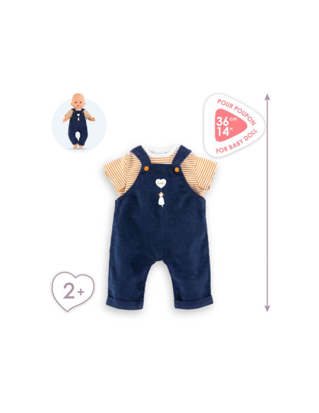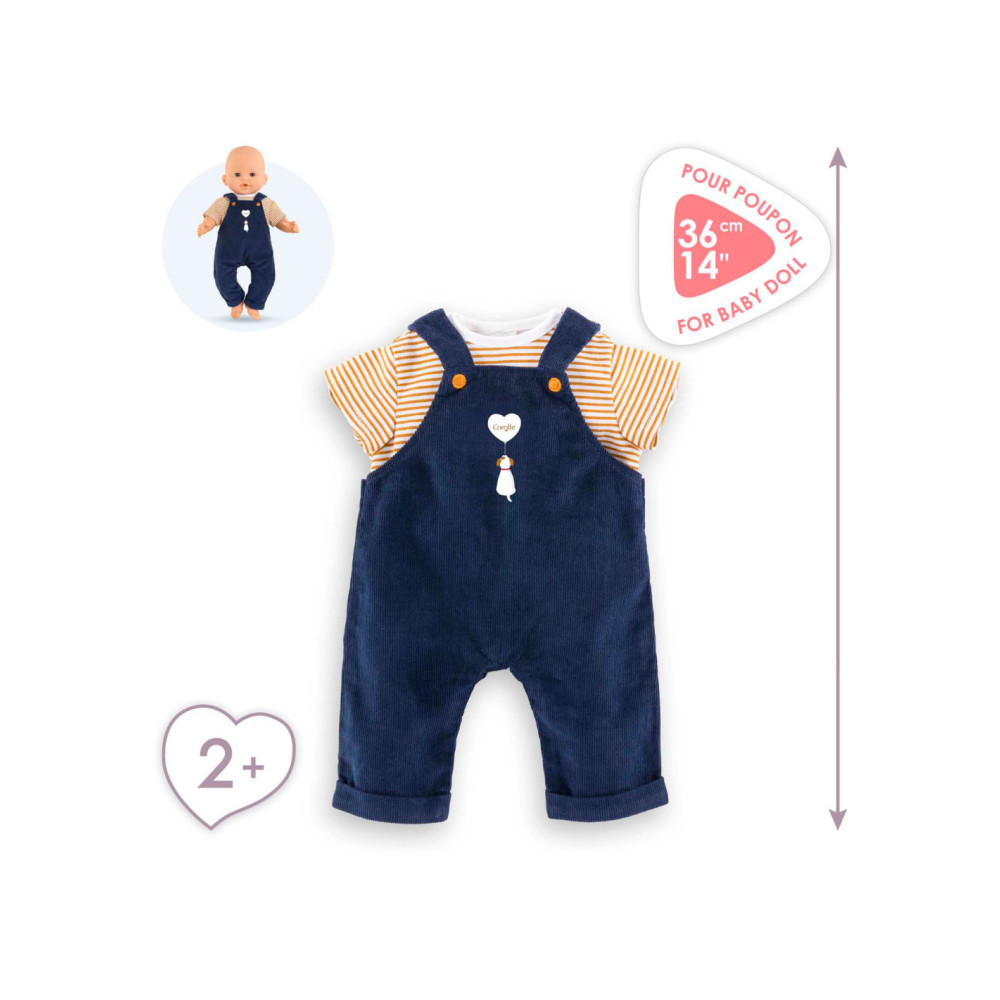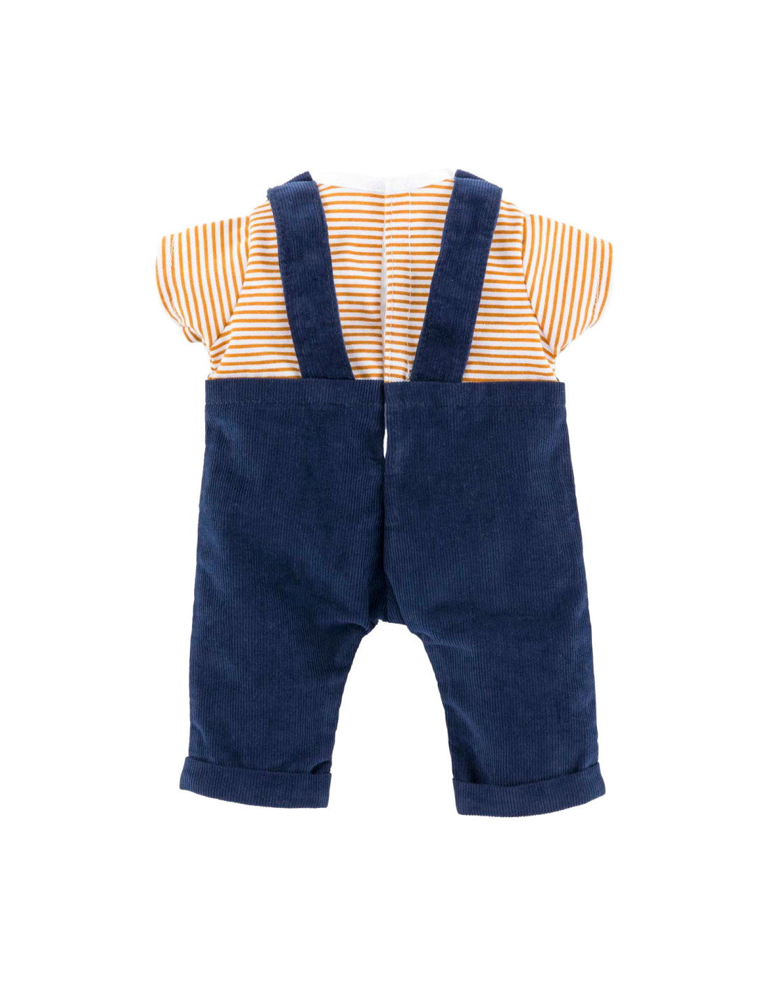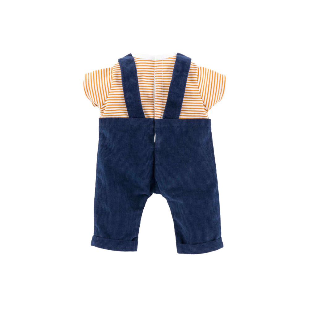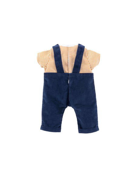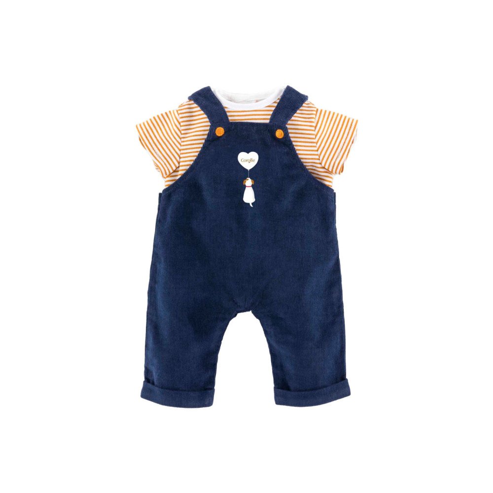 Corolle outfit set. Donkerblauwe tuinbroek en geel-wit gestreept T-shirt.