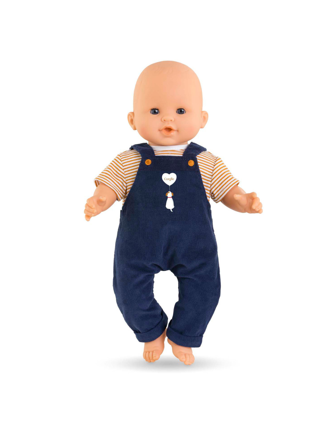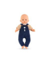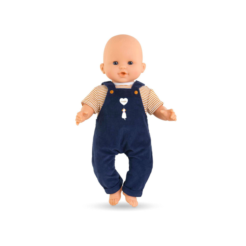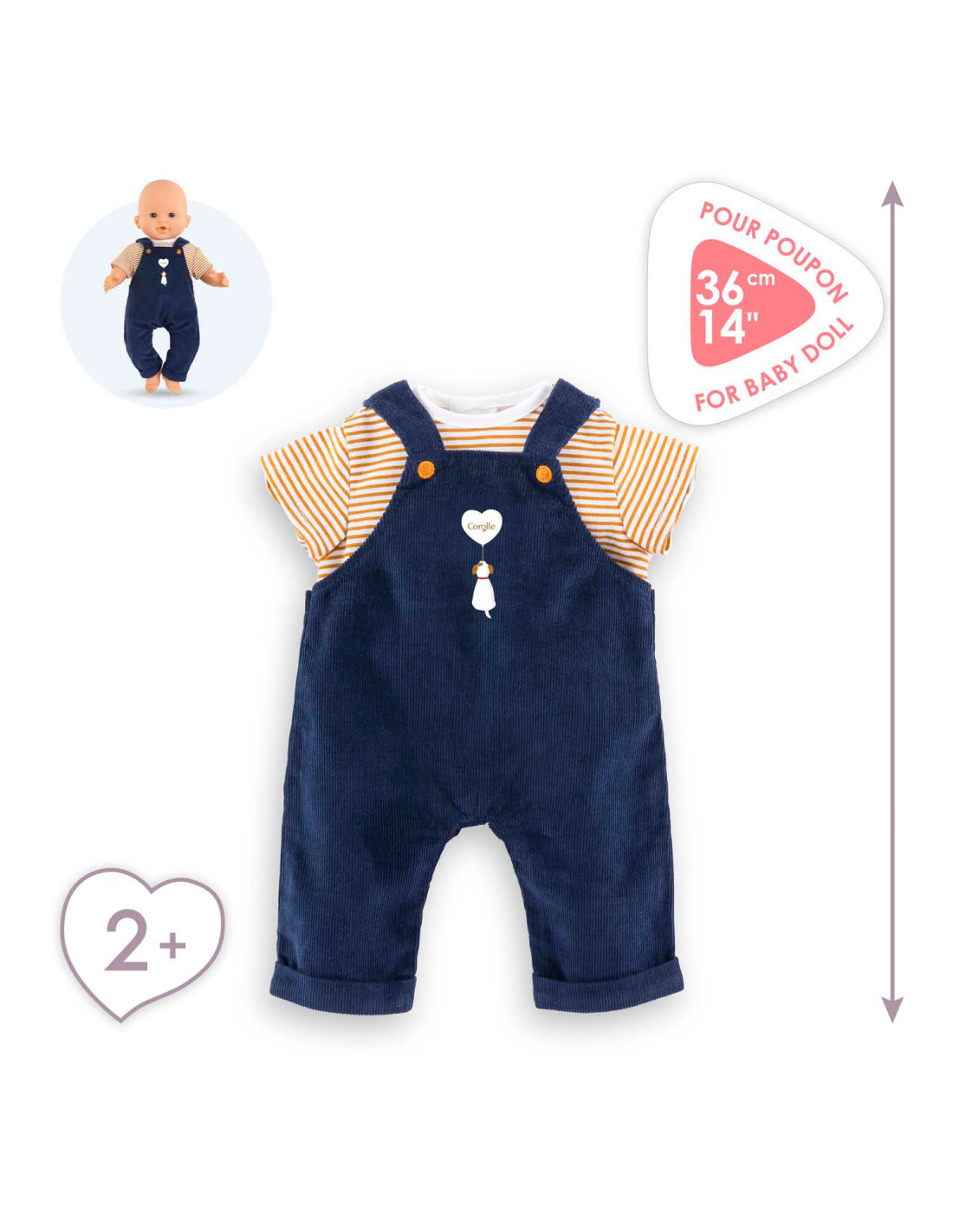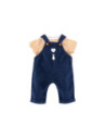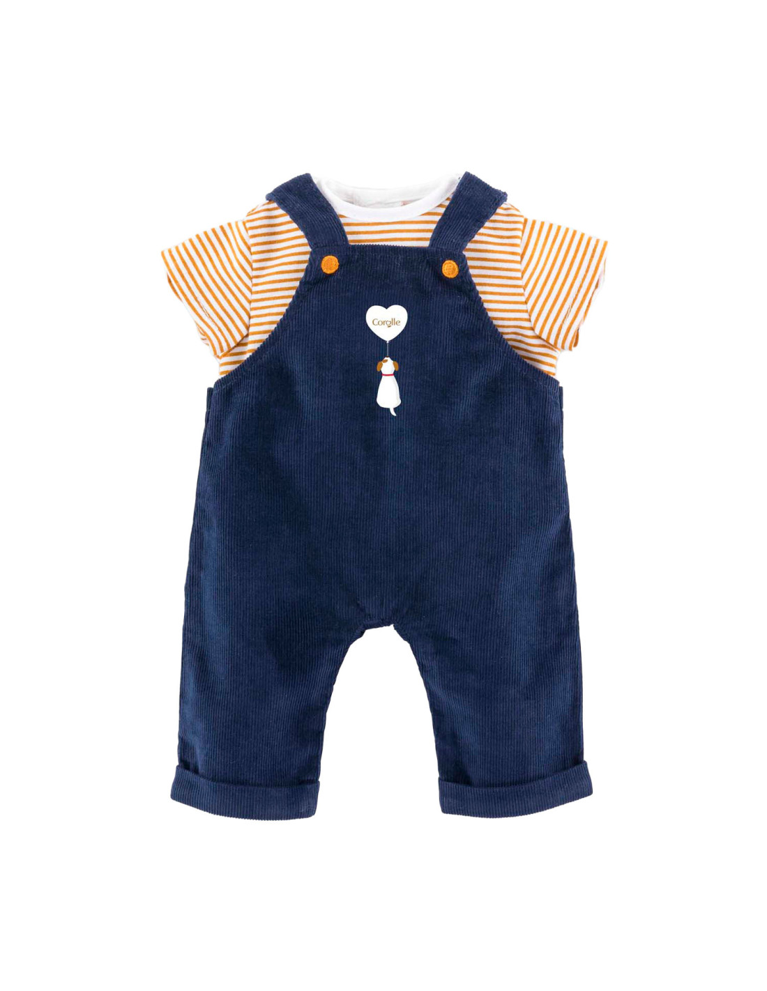 Corolle outfit set. Donkerblauwe tuinbroek en geel-wit gestreept T-shirt.
