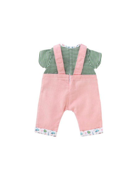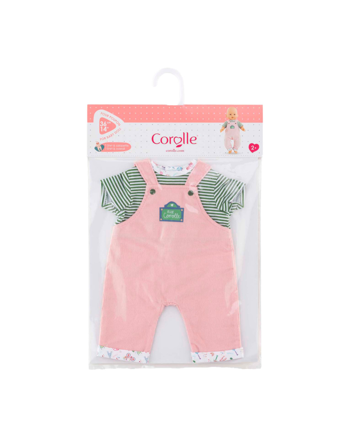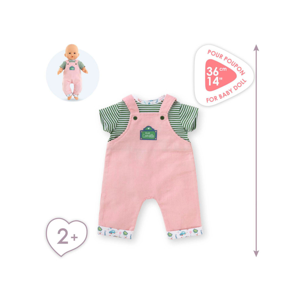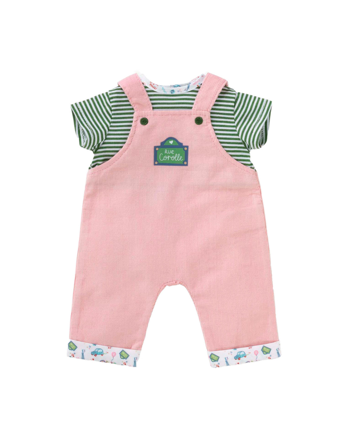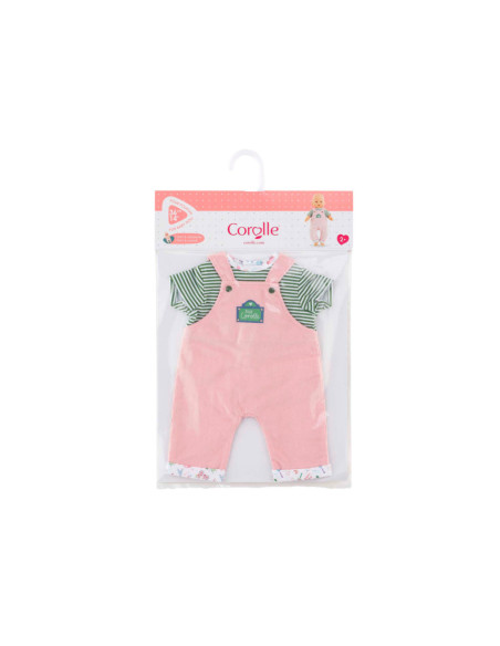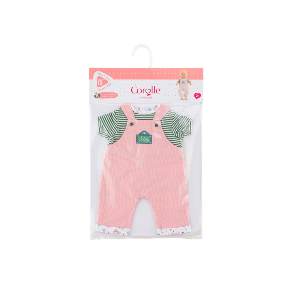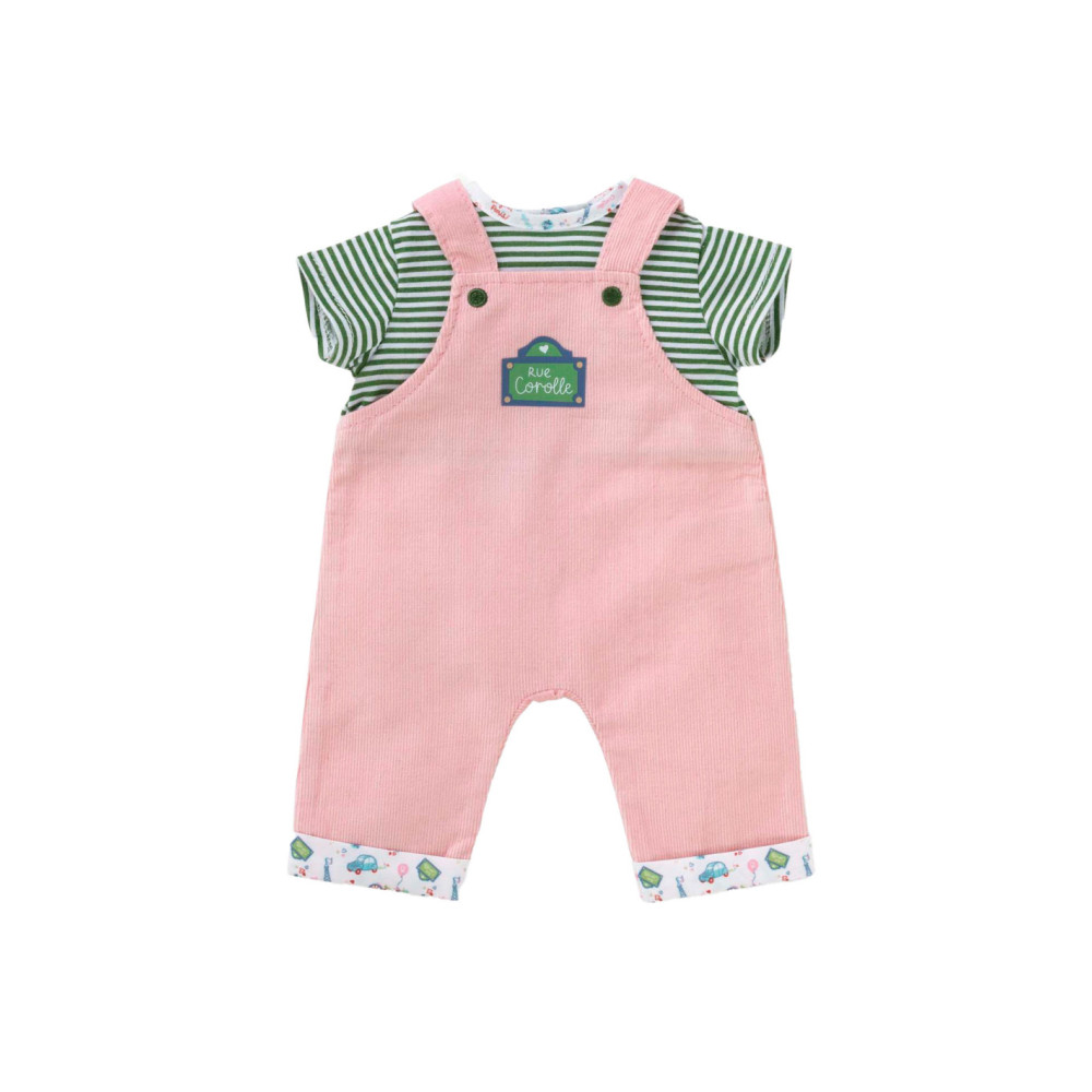 Voor een casual outfit is de Weekend in Parijs set met T-shirt en overall het ideale kledingstuk voor kleine 36 cm Corolle-poppen. Deze alles-in-één set bestaat uit een roze corduroy overall en een groen-wit gestreept T-shirt. De Parijse touch van de Week-end à Paris-collectie vinden we terug in de opdruk op de kraag van het t-shirt en de zomen van de overall. Op de voorkant is ook een zeefdruk van “rue Corolle” aanwezig.