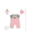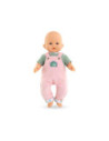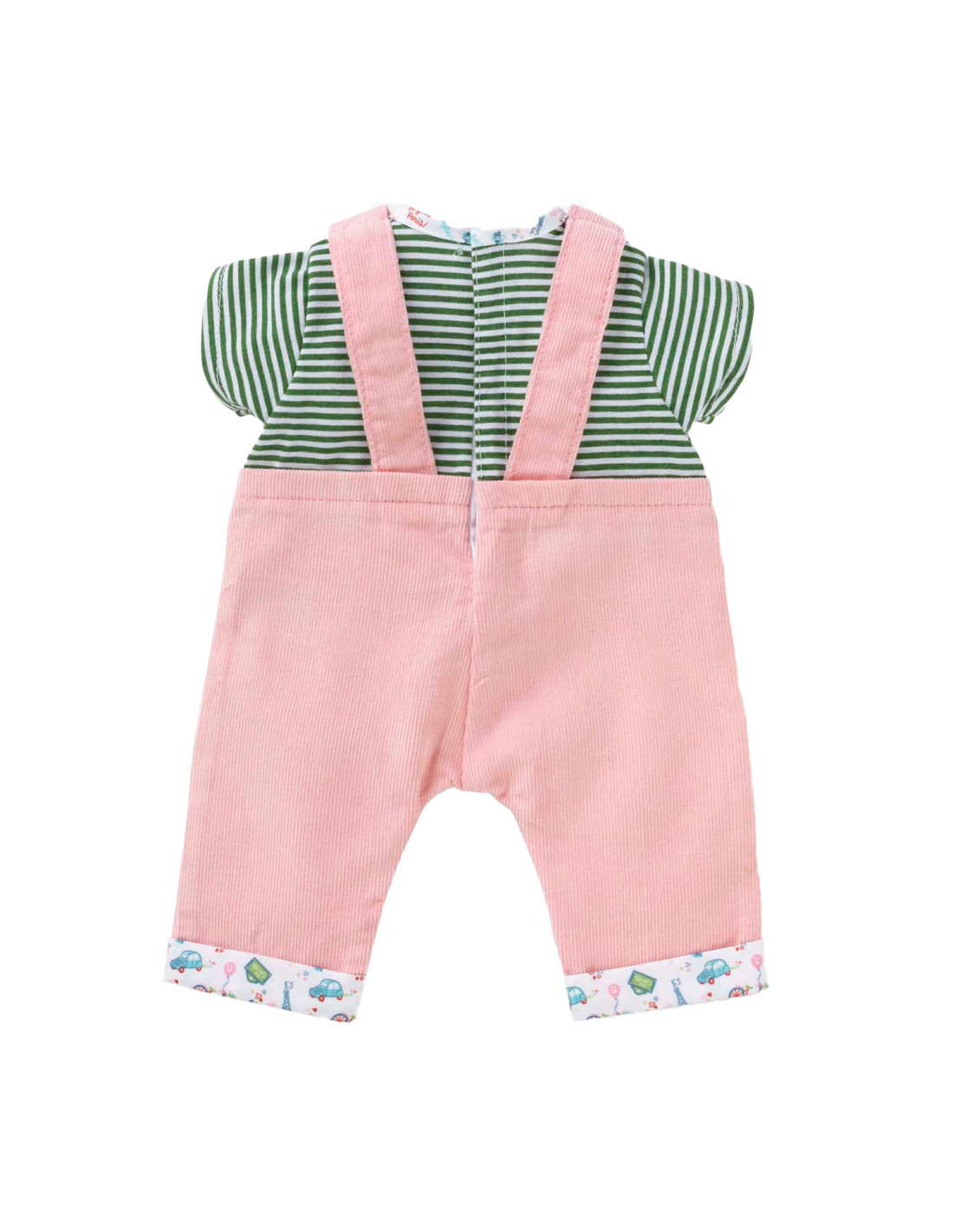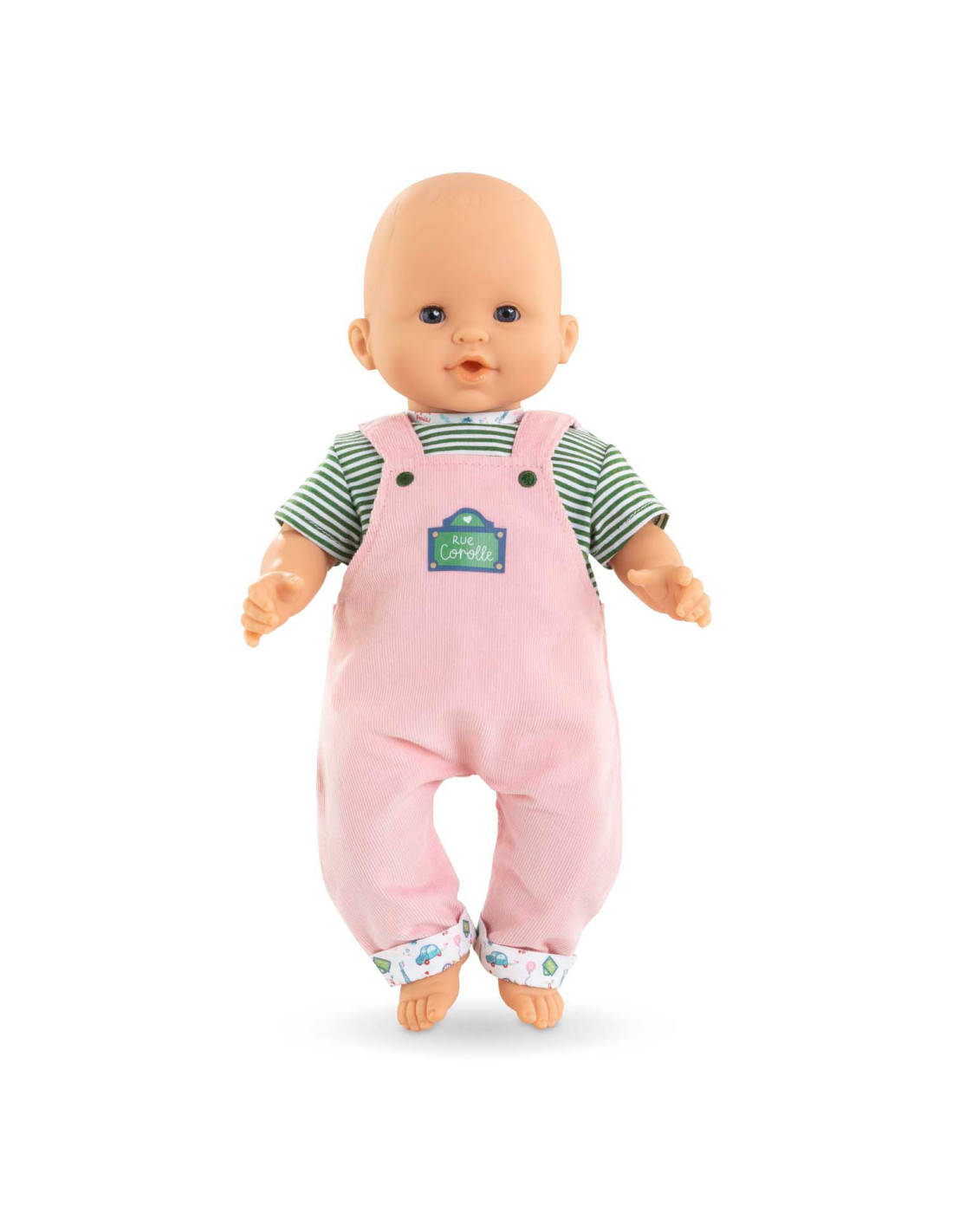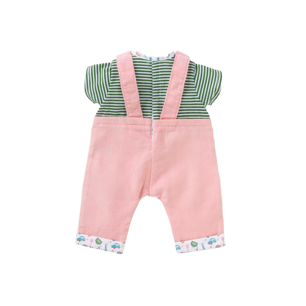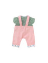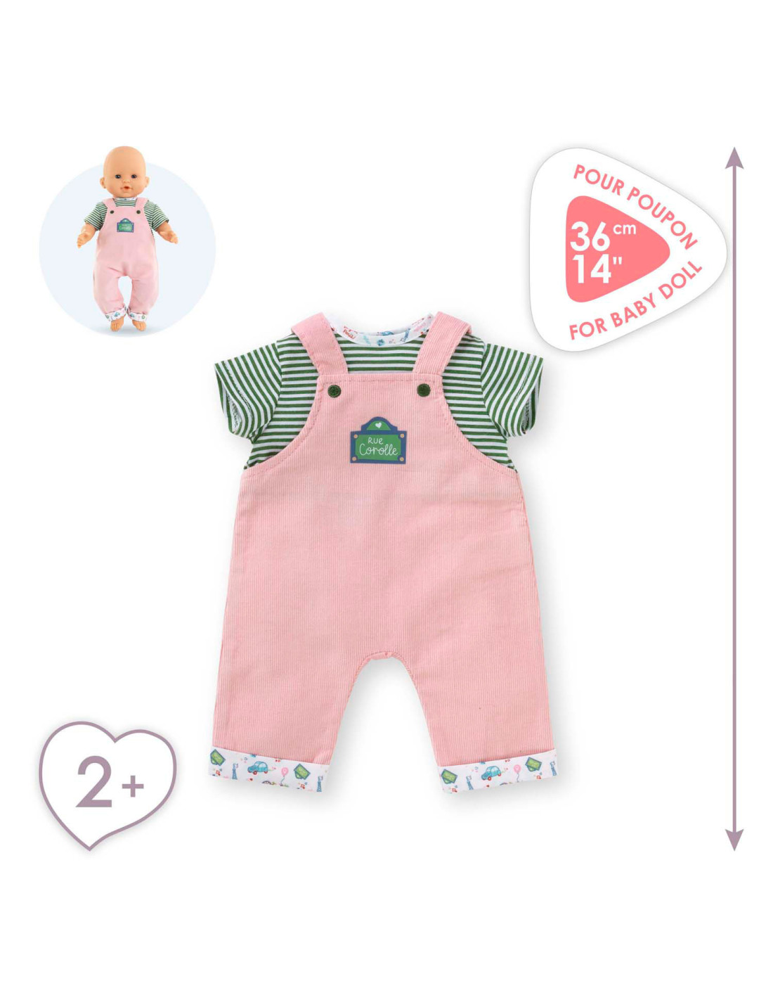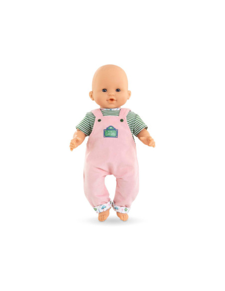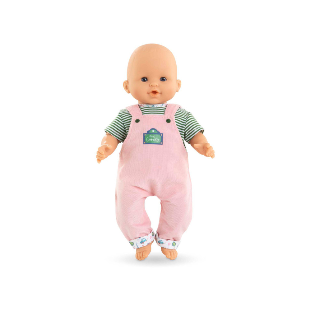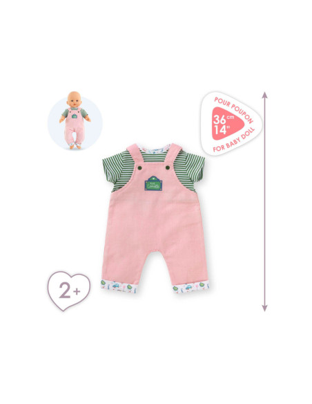 Voor een casual outfit is de Weekend in Parijs set met T-shirt en overall het ideale kledingstuk voor kleine 36 cm Corolle-poppen. Deze alles-in-één set bestaat uit een roze corduroy overall en een groen-wit gestreept T-shirt. De Parijse touch van de Week-end à Paris-collectie vinden we terug in de opdruk op de kraag van het t-shirt en de zomen van de overall. Op de voorkant is ook een zeefdruk van “rue Corolle” aanwezig.