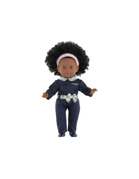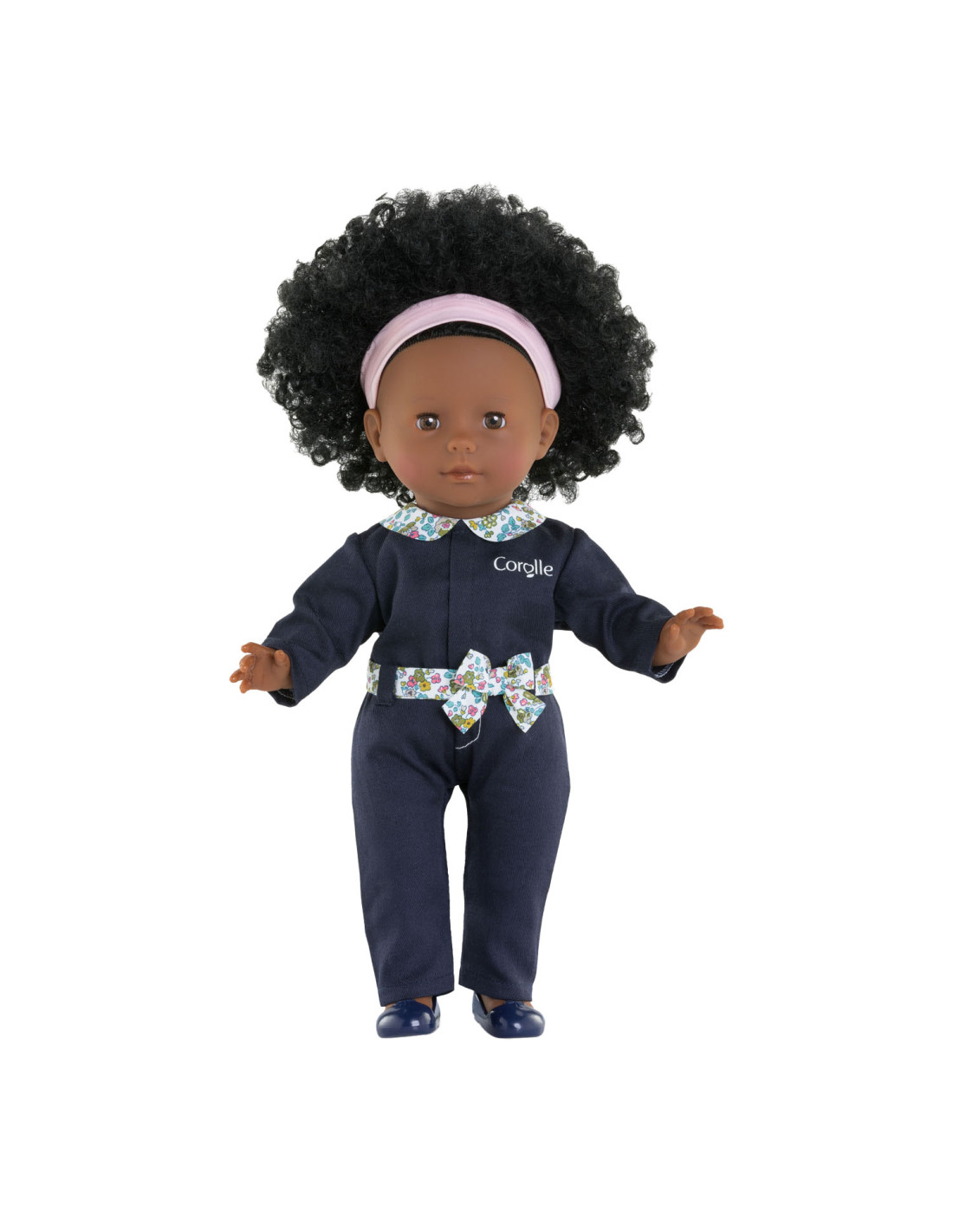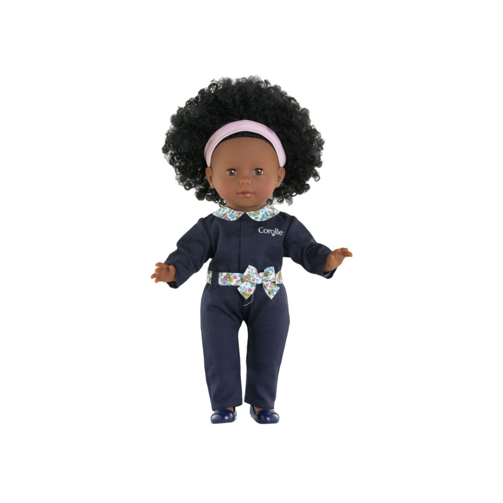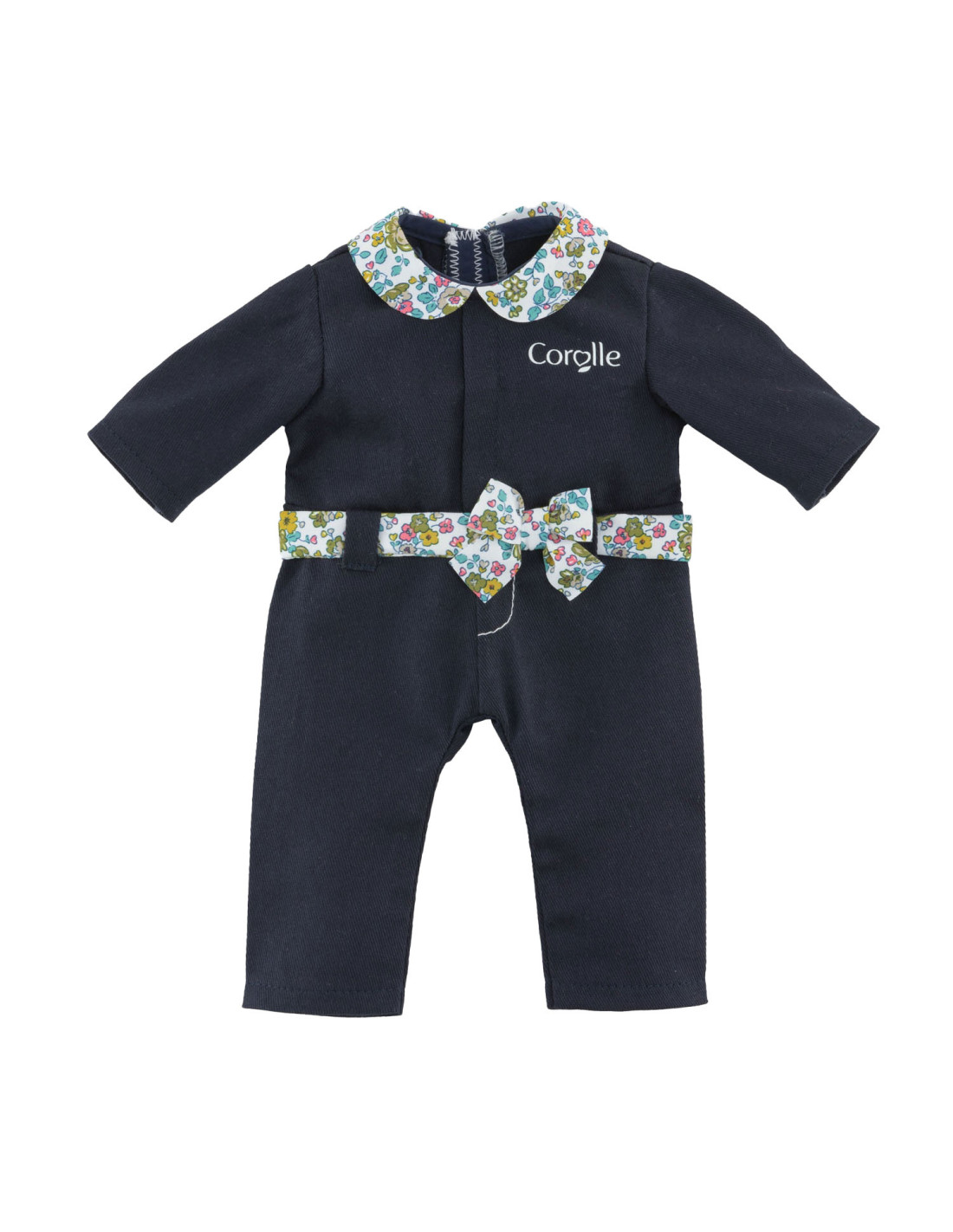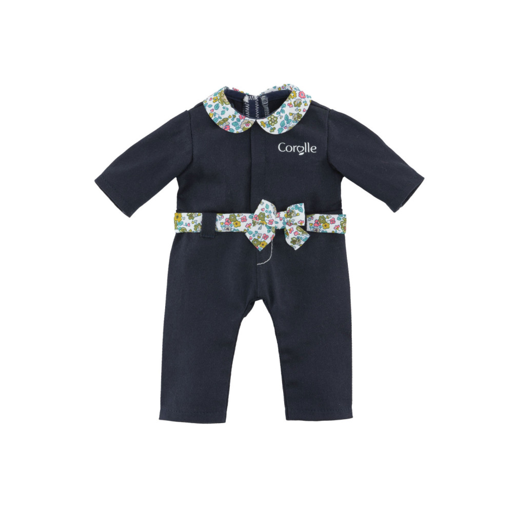 Jumpsuit voor een Corolle pop van 36 cm. De jumpsuit is donkerblauw met een gebloemde kraag en riem.