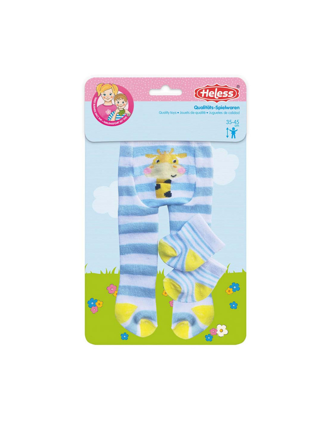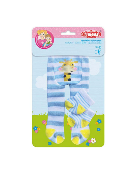 De kleurrijke poppenmaillot “Funny Animals” met sokken van Heless zorgen met hun schattige dierenmotieven en vrolijke patronen altijd voor een goed humeur. De maillot en sokken zijn blauw gekleurd, met horizontale strepen en een giraffe erop afgebeeld. Door de goede pasvorm van de maillot is er ook voldoende ruimte voor luiers. De panty's en sokken zijn zeer elastisch en kunnen daardoor gemakkelijk aan- en uitgetrokken worden door een grote verscheidenheid aan poppen. Een kleurrijk basisstuk dat elke poppenoutfit opfleurt. Panty's en sokken passen bij de meeste poppen van 35-45 cm op de markt. Ze zijn ook verkrijgbaar in een andere uitvoering voor poppen van 28-35 cm (artikelnummer 1520399C).