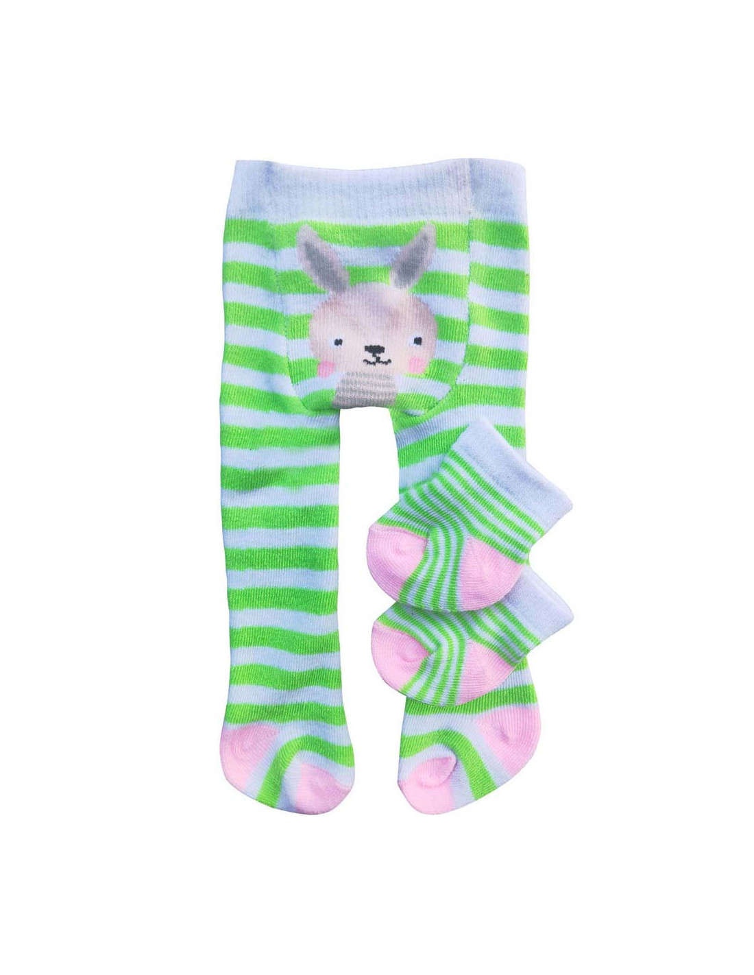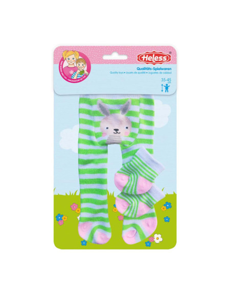 De kleurrijke poppenmaillot “Funny Animals” met sokken van Heless zorgen met hun schattige dierenmotieven en vrolijke patronen altijd voor een goed humeur. De maillot en sokken zijn groen gekleurd, met horizontale strepen en een konijn erop afgebeeld. Door de goede pasvorm van de maillot is er ook voldoende ruimte voor luiers. De panty's en sokken zijn zeer elastisch en kunnen daardoor gemakkelijk aan- en uitgetrokken worden door een grote verscheidenheid aan poppen. Een kleurrijk basisstuk dat elke poppenoutfit opfleurt. Panty's en sokken passen bij de meeste poppen van 35-45 cm op de markt. Ze zijn ook verkrijgbaar in een andere uitvoering voor poppen van 28-35 cm (artikelnummer 1520399B).